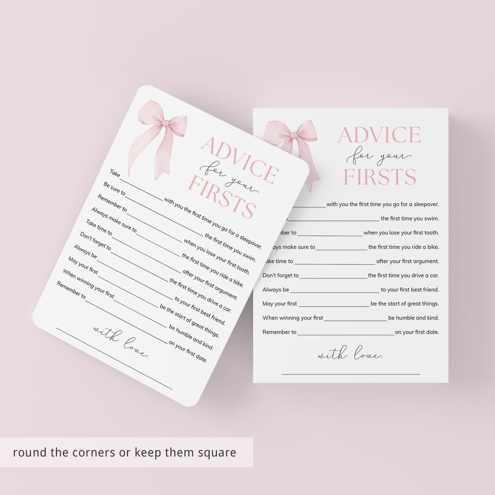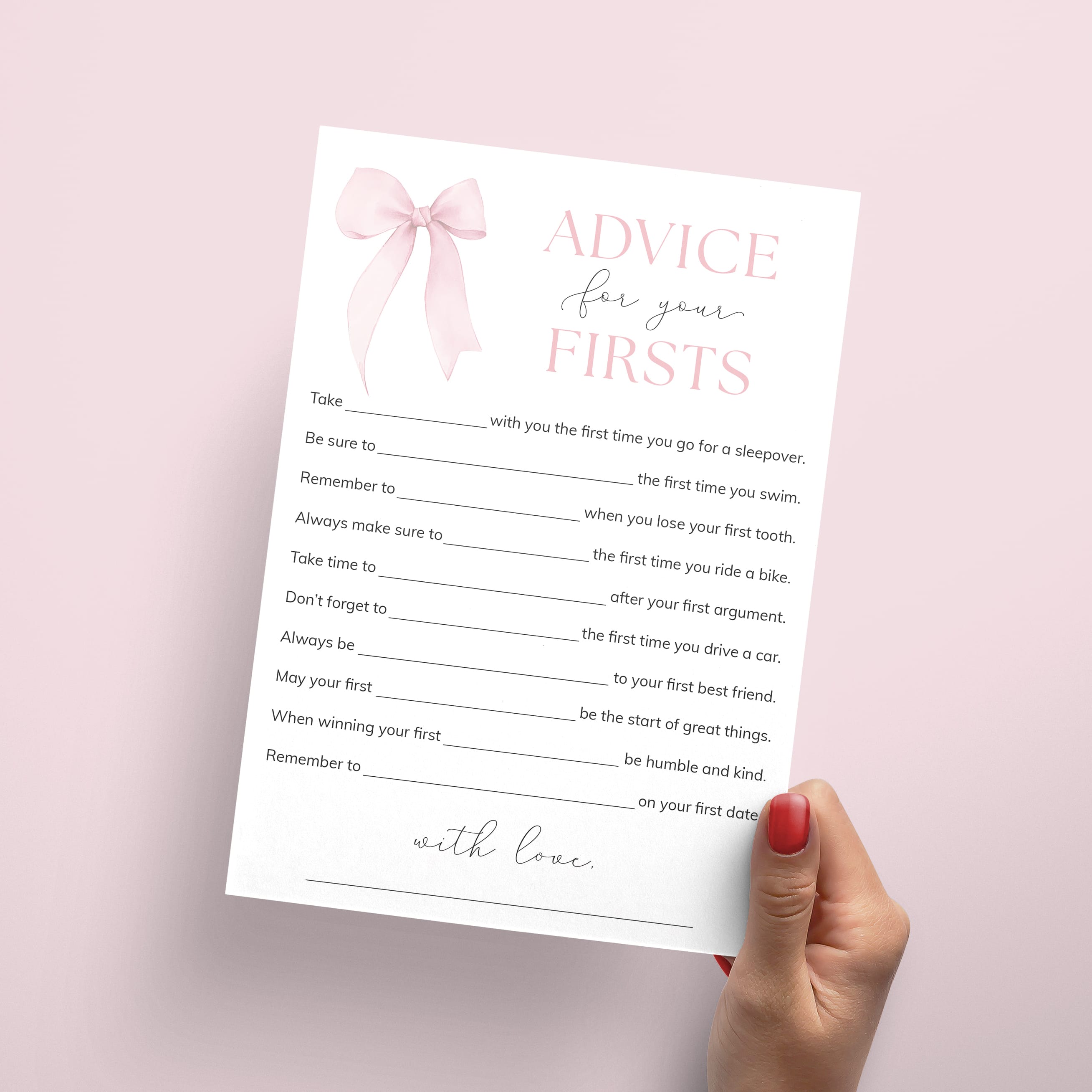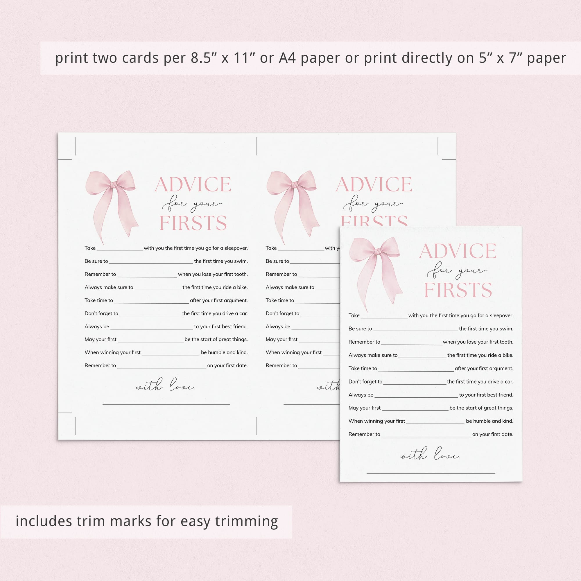 Are you looking for a meaningful keepsake for your baby girls' first birthday party? Let every guest write down their advice for your baby's firsts. This first birthday advice card with watercolor pink bow is the perfect addition to your girl's first birthday party.