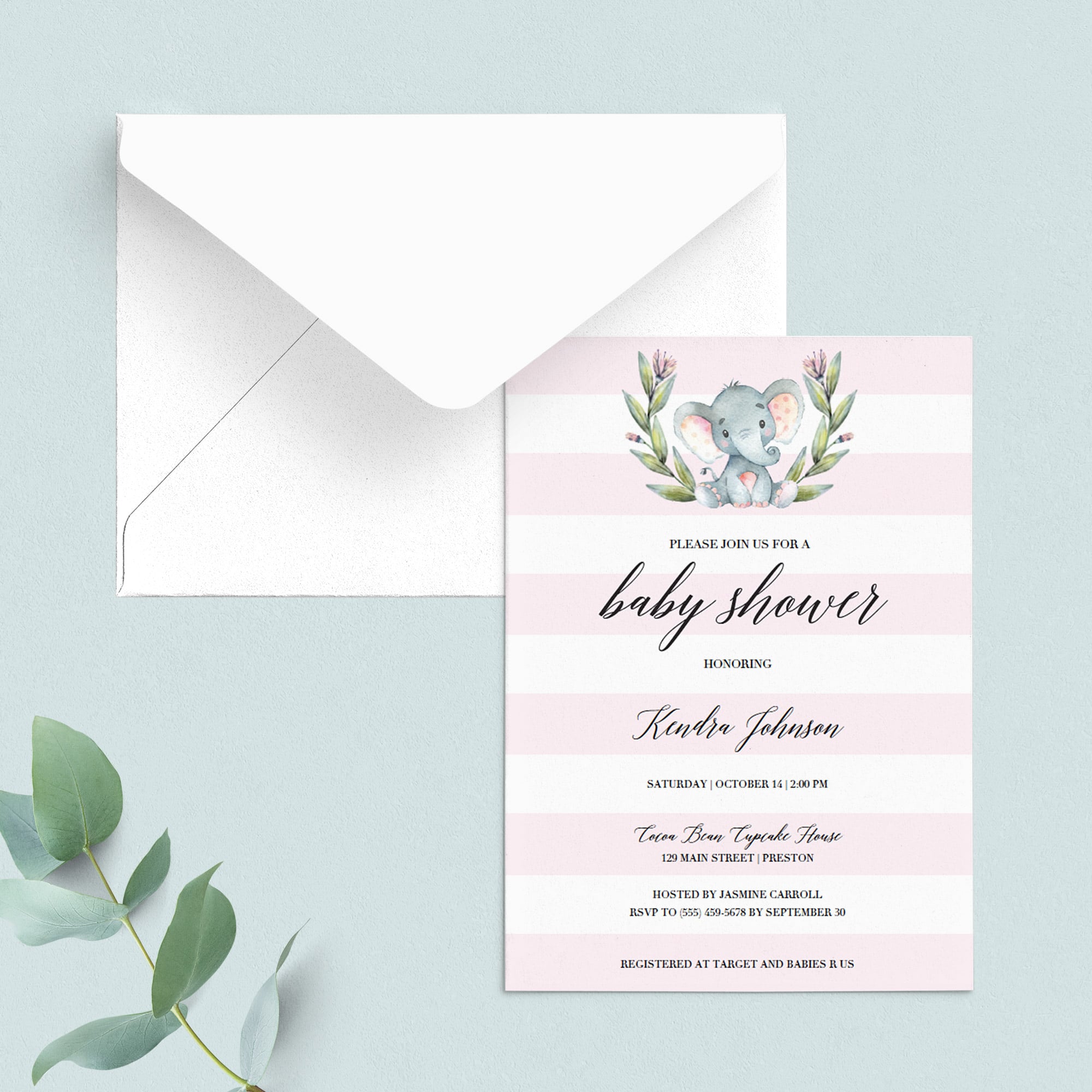 Make the perfect announcement of your friends baby shower with this adorable pink elephant baby shower invitation. This cute invite is perfect to celebrate the arrival of a baby girl.