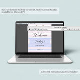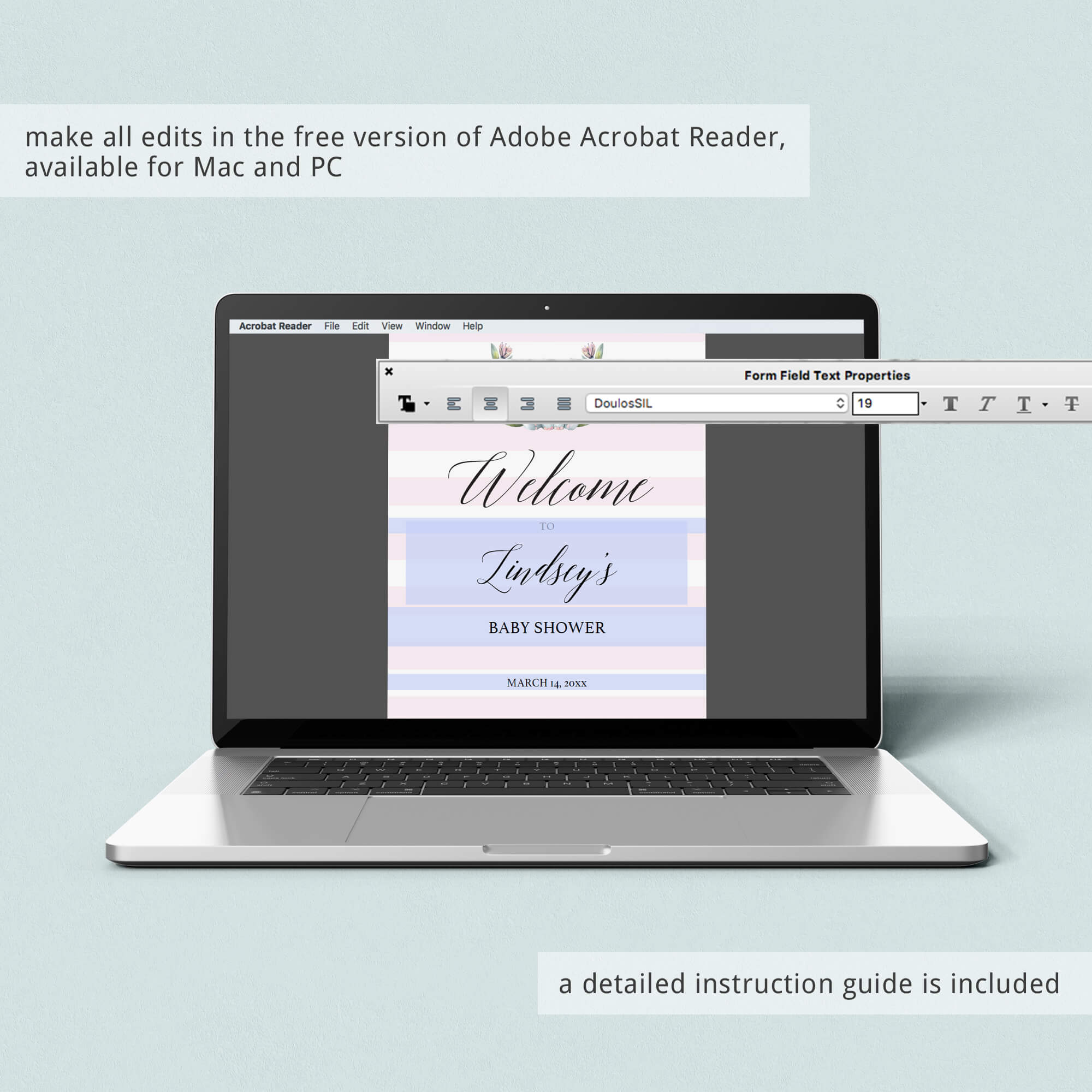 Easily personalize the white and pink welcome sign with the guest of honor's name and the date of the baby shower. A detailed instruction guide with tips & tricks on editing, trimming, paper choices and more is included.