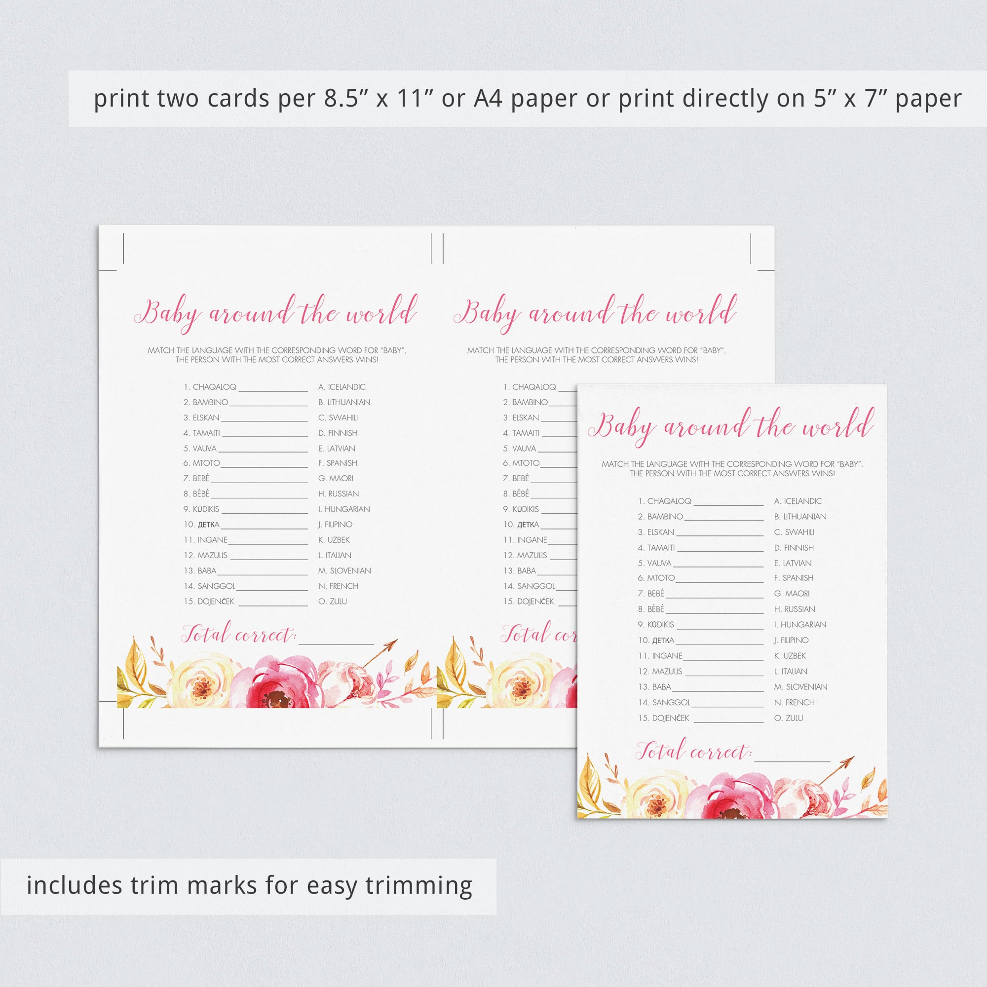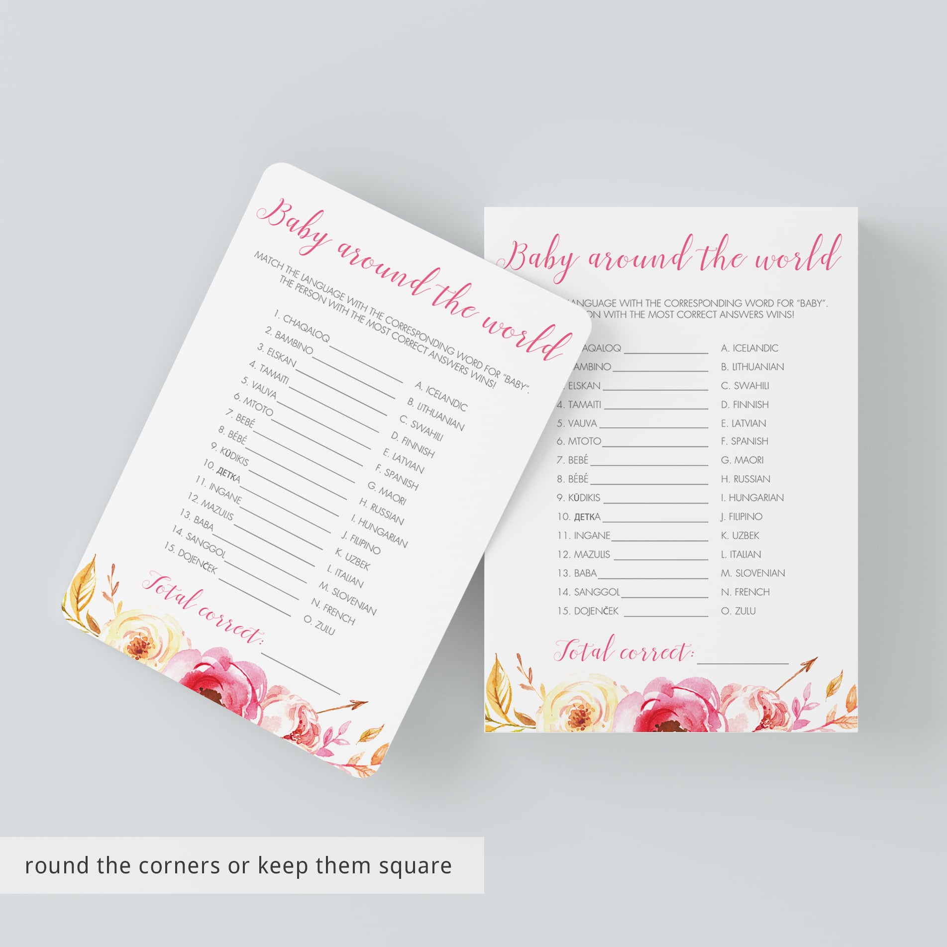 The game is very easy to play. Print and distribute this pink floral baby shower game and a pen to each of your guests. The have to match each version of the word “baby” with its language of origin. The person who matches the most correctly wins. This game is perfect for a girl baby shower.