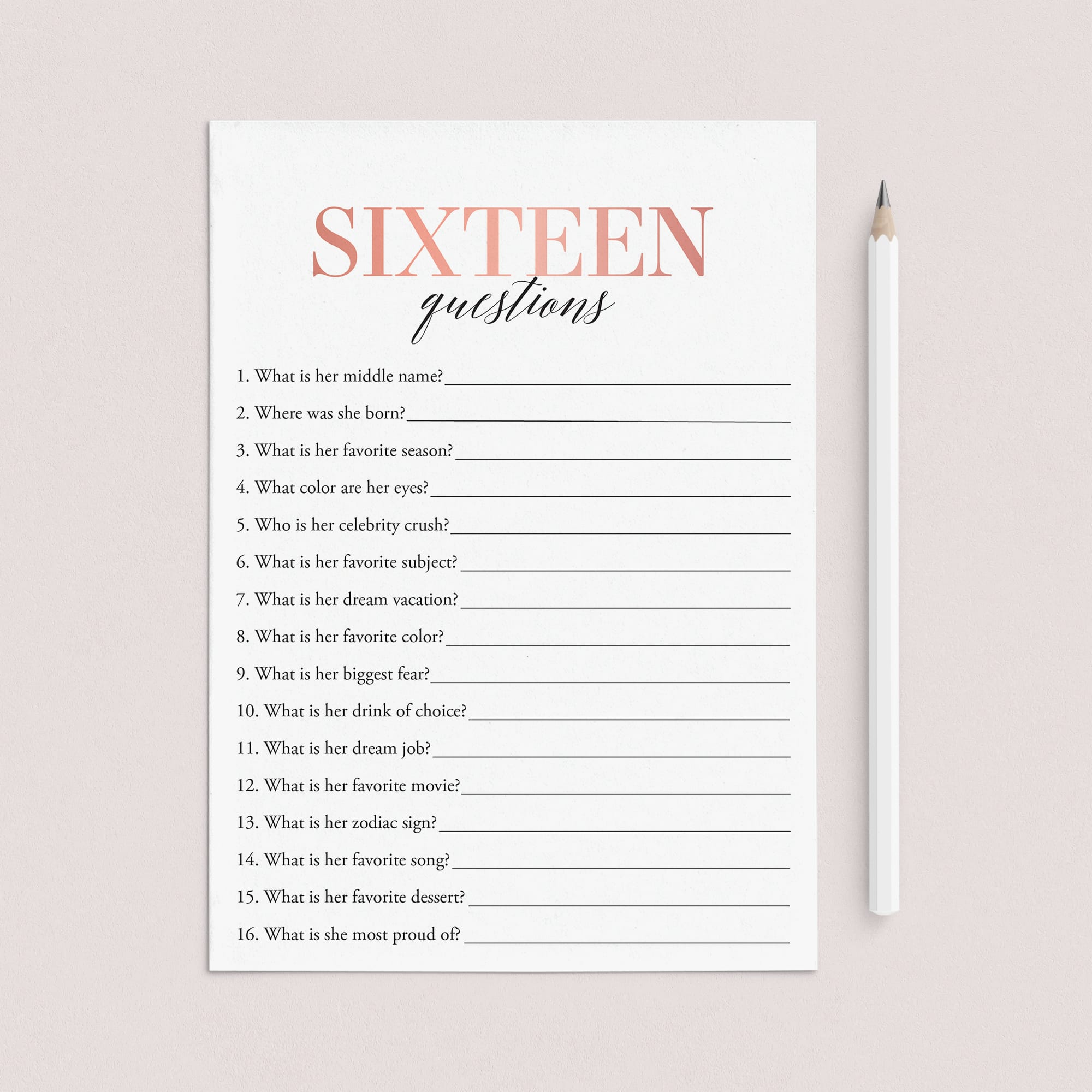 Turning 16 is a big deal! Celebrate the best way with this huge Sweet 16 Party Game Bundle. This modern rose gold Sweet 16 Party Games Bundle is the perfect addition to your daughter's birthday bash.
