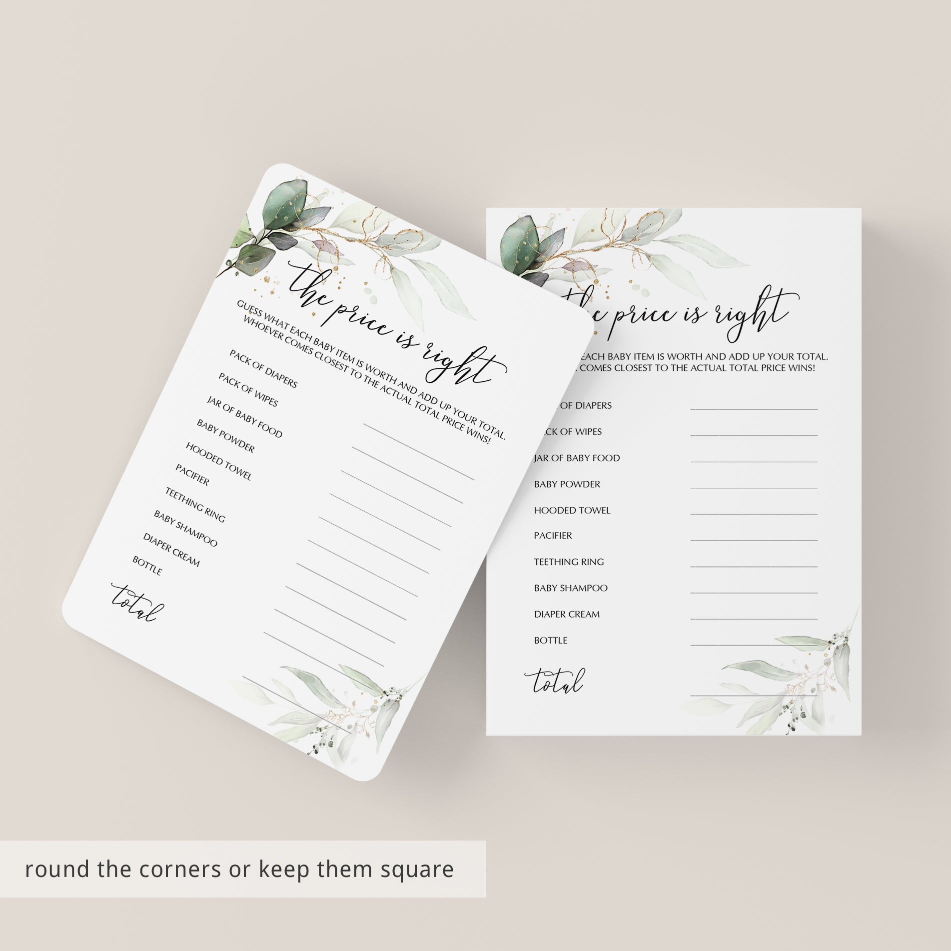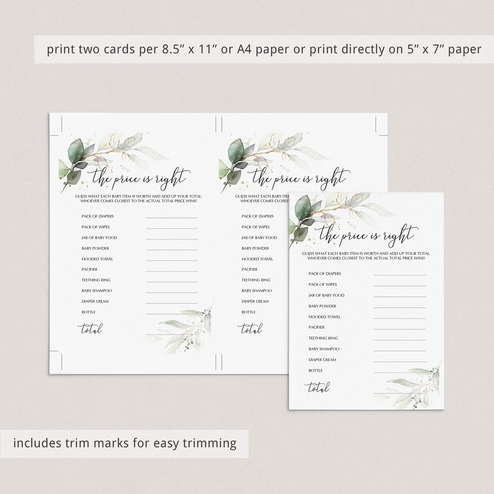 Play The Price is Right at your baby shower with these modern chic baby shower game cards. The cards with watercolor greenery and faux gold foil would be the perfect addition to your greenery baby shower and will create an enjoyable moment for all of your guests.