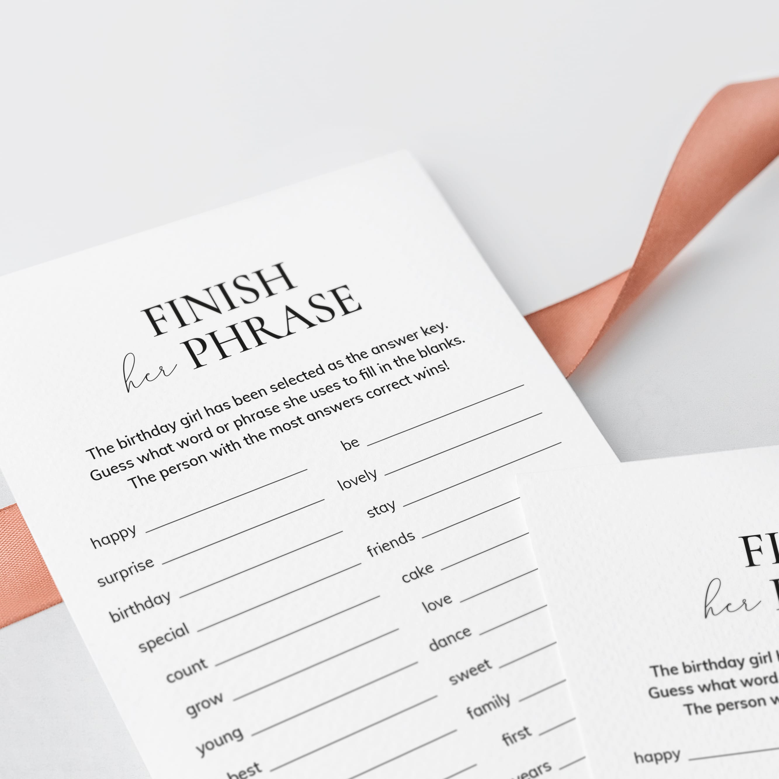Print the games right from your computer in a matter of minutes or have the cards printed at your favorite print shop. The games have been designed in black and white. You can print on kraft paper to create a rustic look or print on colored card stock to match your party color palette. We recommend printing on a nice heavy card stock for highest quality feel.