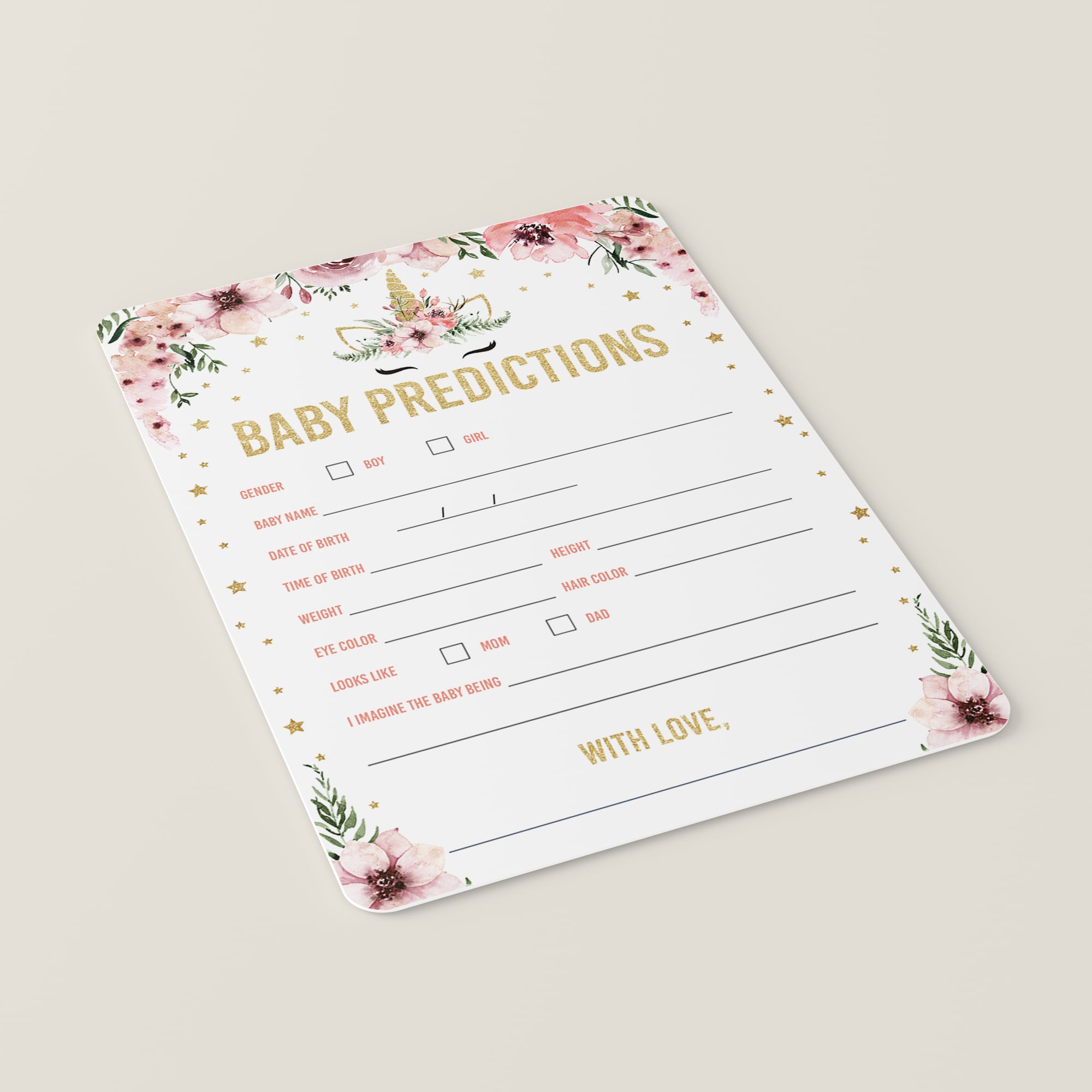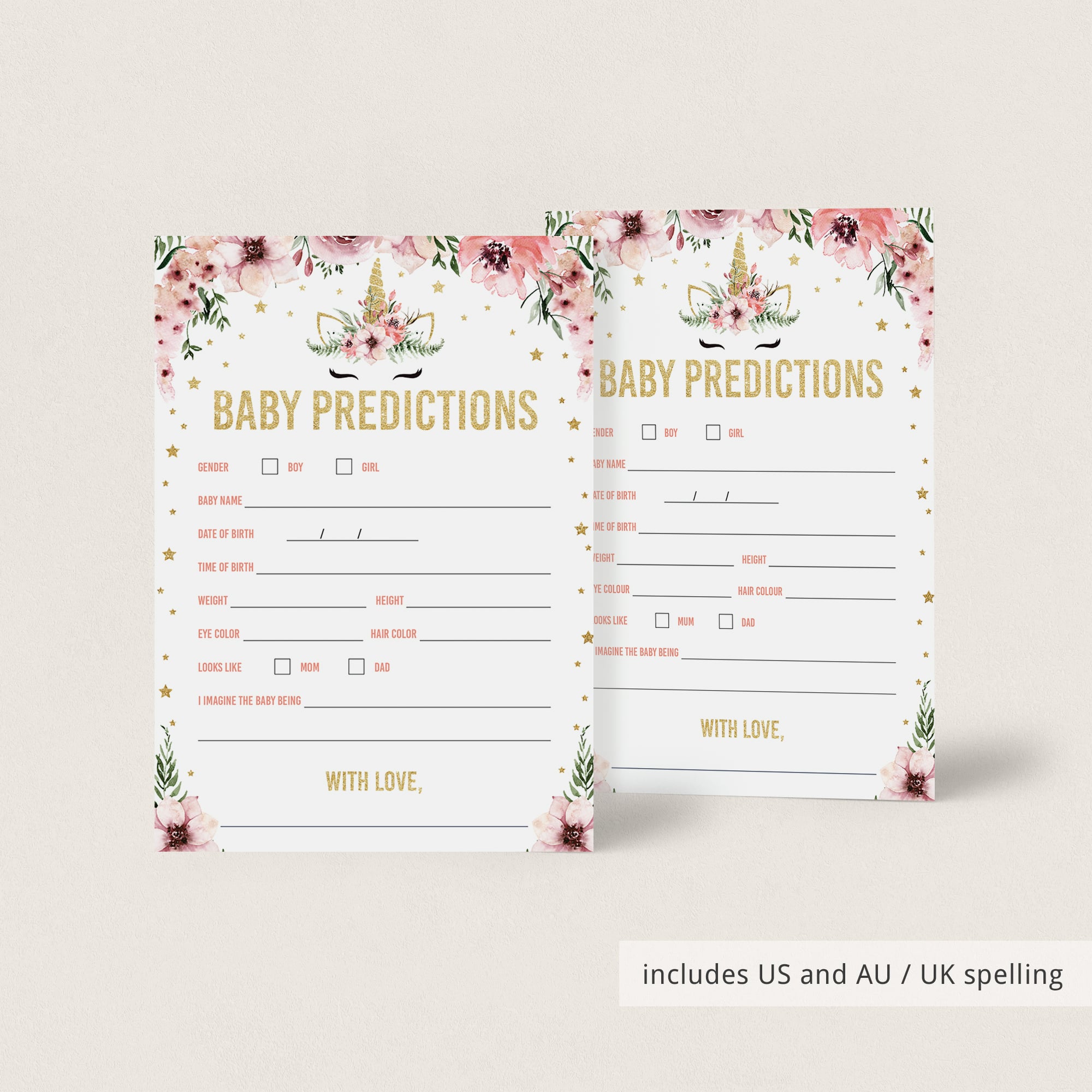 Let your guests make their best predictions at all the baby's birth statistics and WOW everyone with your gorgeous pink and gold unicorn baby prediction cards!