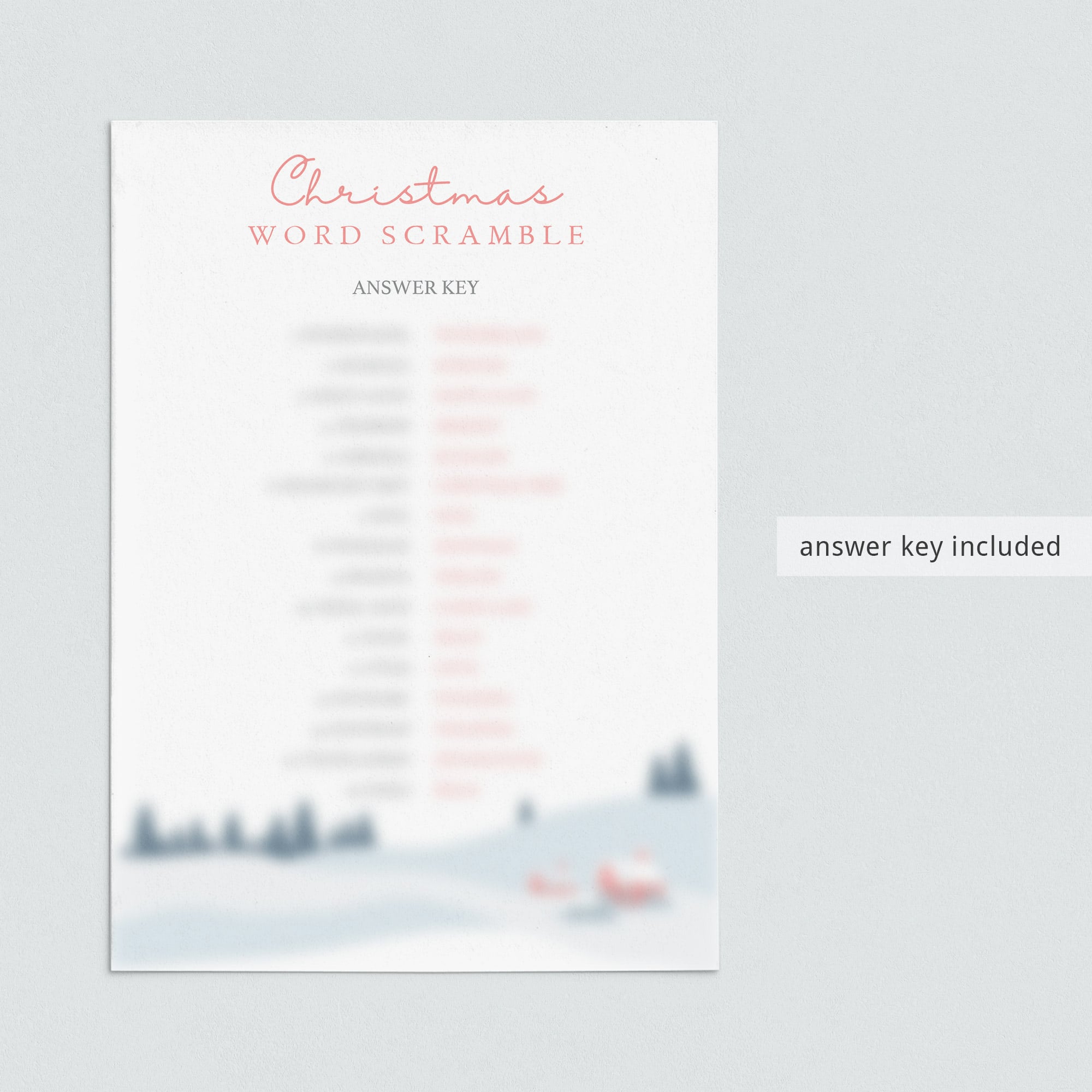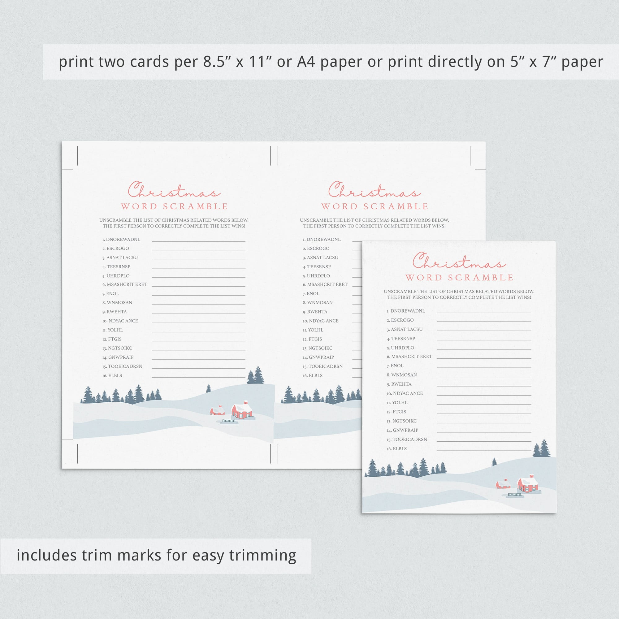 This printable Christmas word scramble game is an instant download, so simply download and print or distribute online within minutes after purchase. Print right from your computer in a matter of minutes or have the game printed at your favorite print shop.