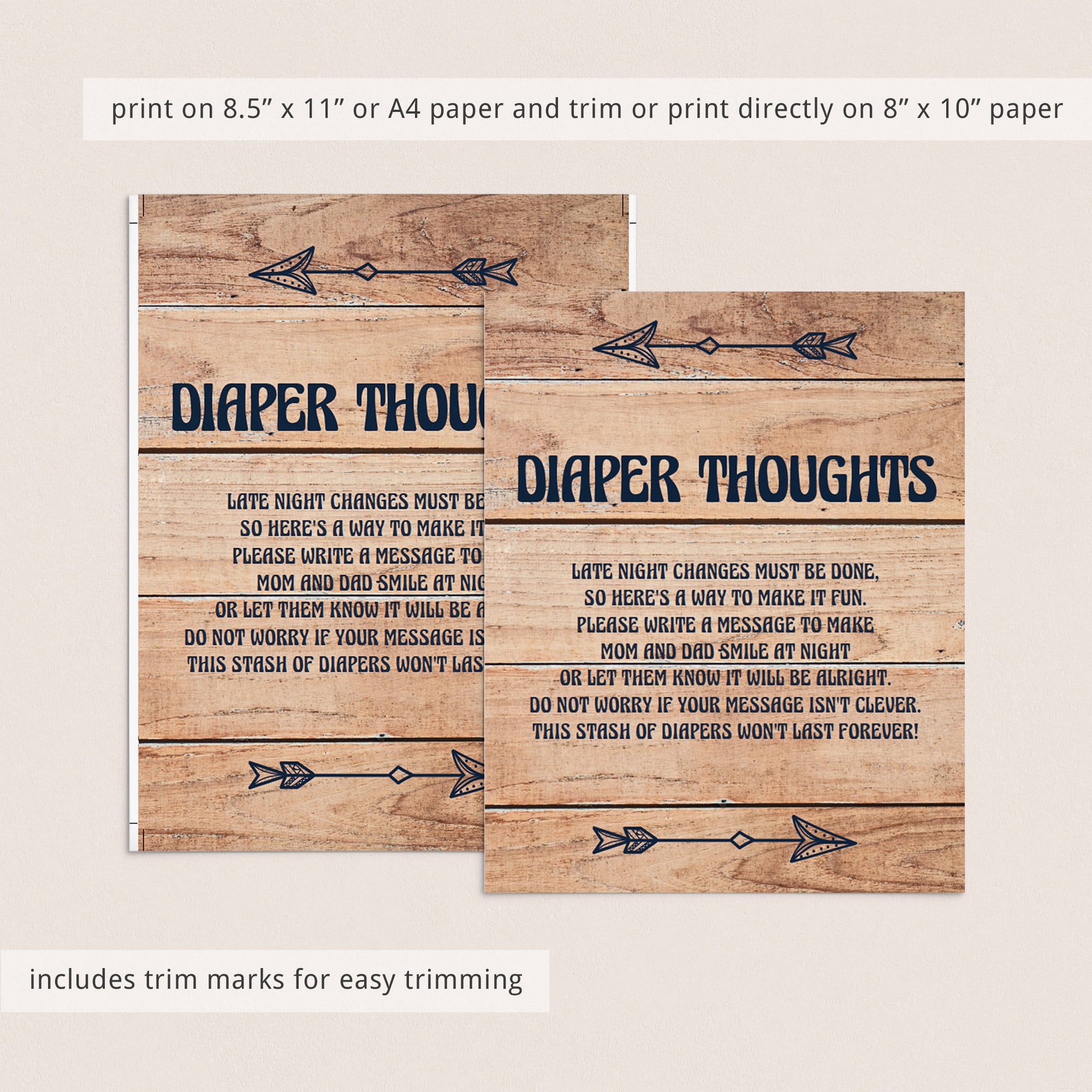 Are you looking for a creative and fun baby shower activity? Set up a Diaper Thoughts station with this woodland themed baby shower Diaper Thoughts sign with rustic background. Guaranteed to be a huge hit!