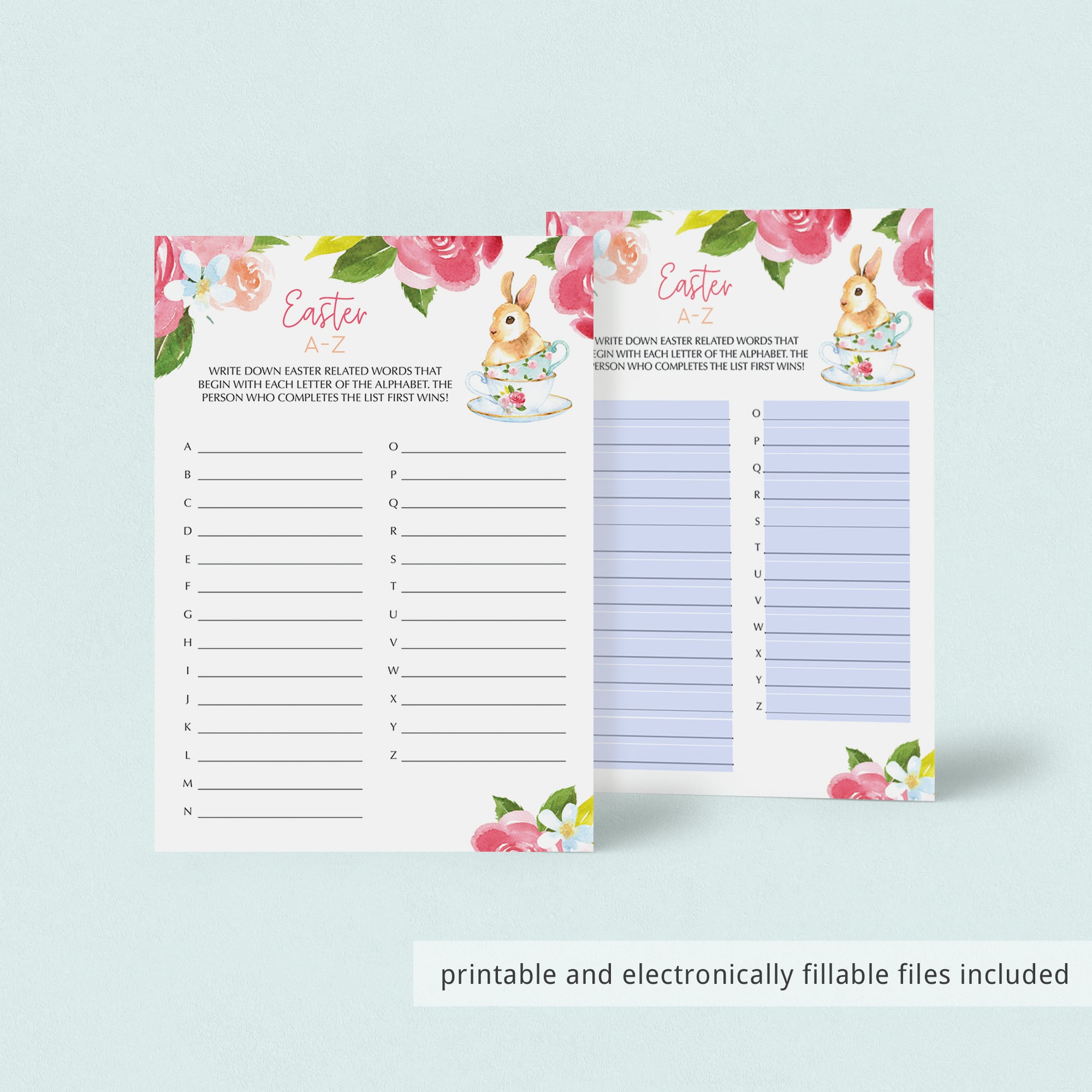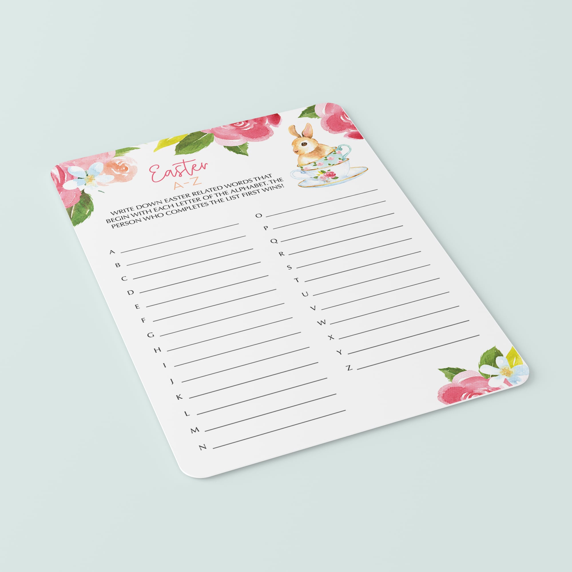 The game is very easy to play. Hand out or send this gorgeous floral Easter A-Z game sheet to your friends and family. They will have to come up with Easter related words that begin with each letter of the alphabet as fast as they can. The first person to get all the words from A to Z wins!