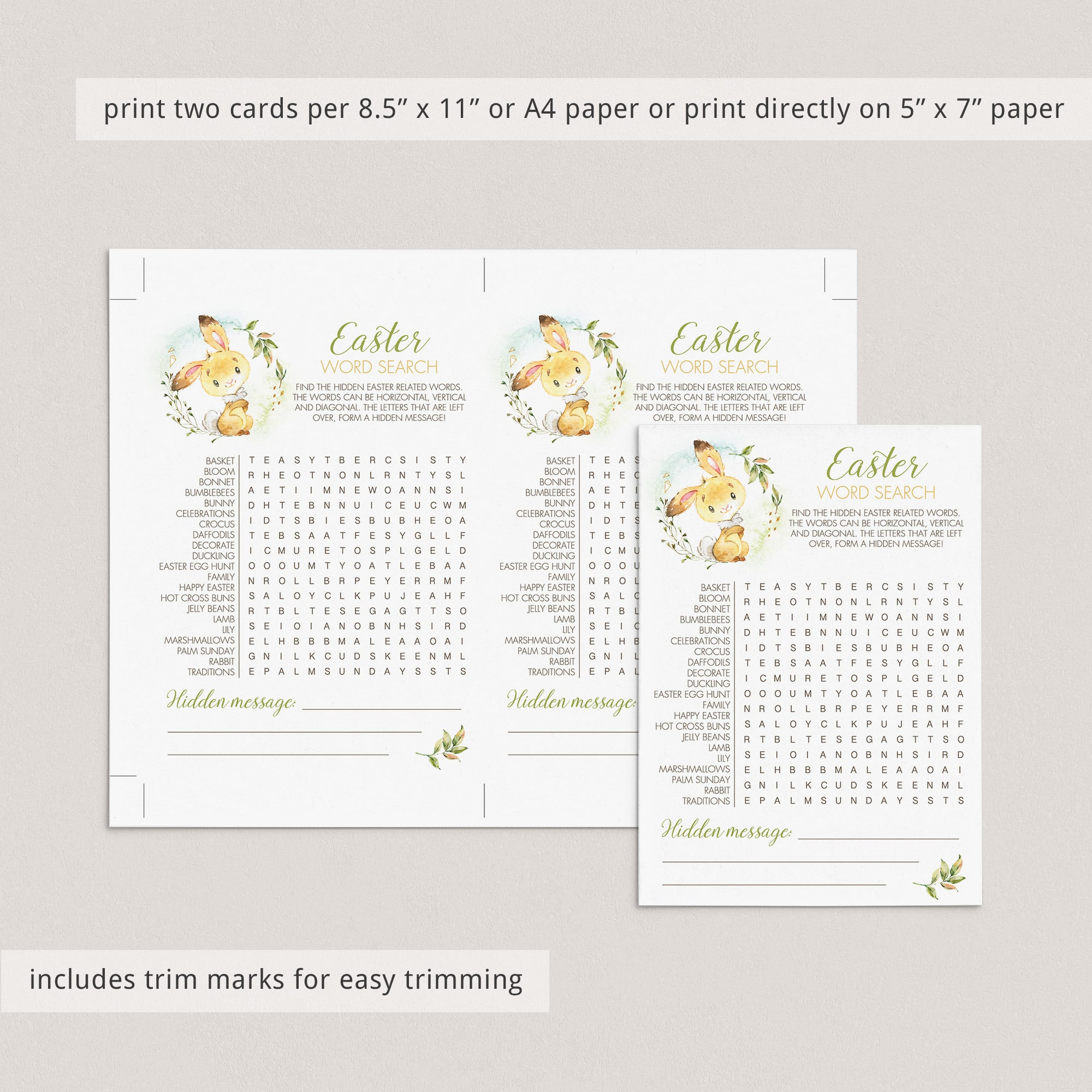 Download and print the Easter Word Search game as many times as you need. We recommend printing on a nice heavy card stock for highest quality feel. Print right from your computer in a matter of minutes or have the cards printed at your favorite print shop.