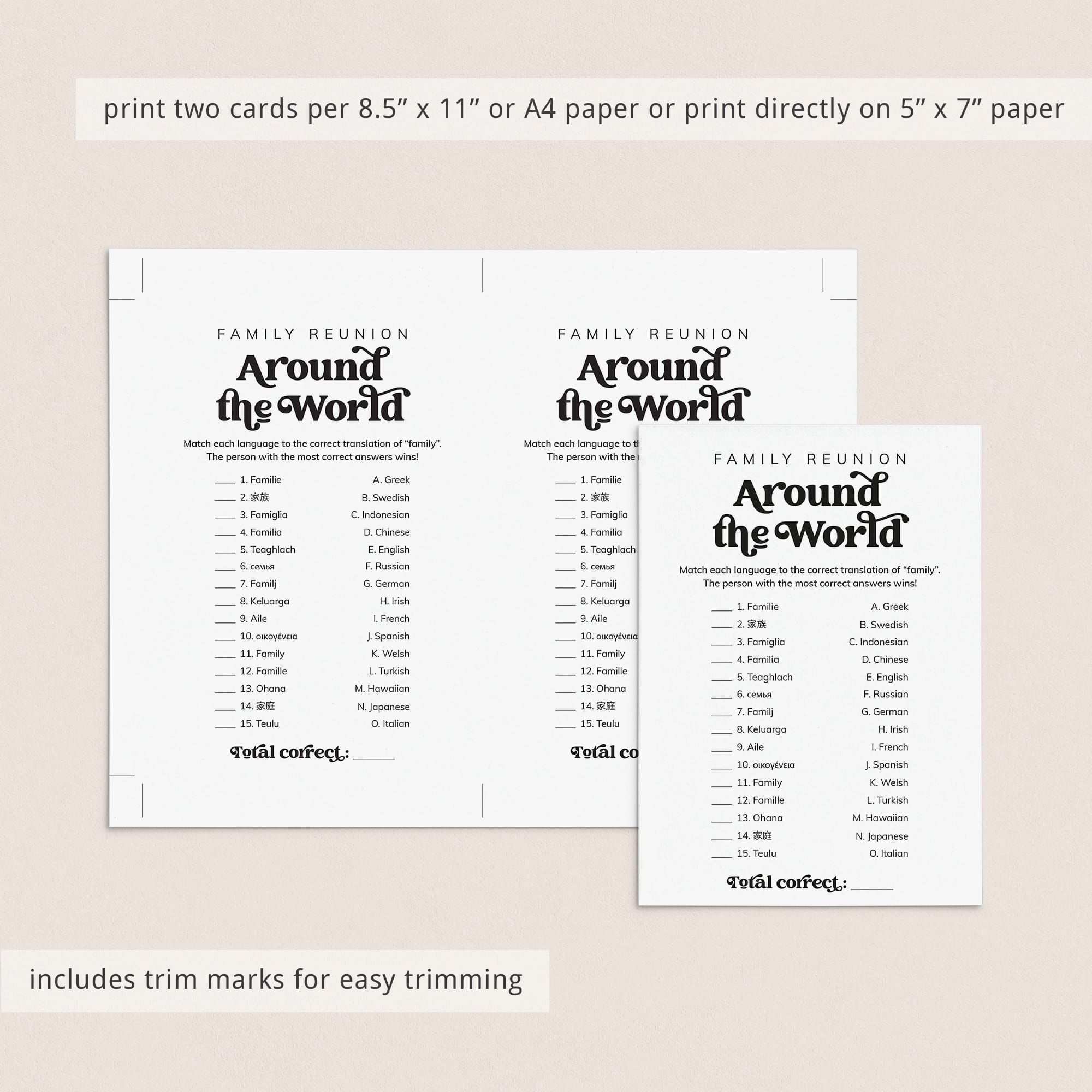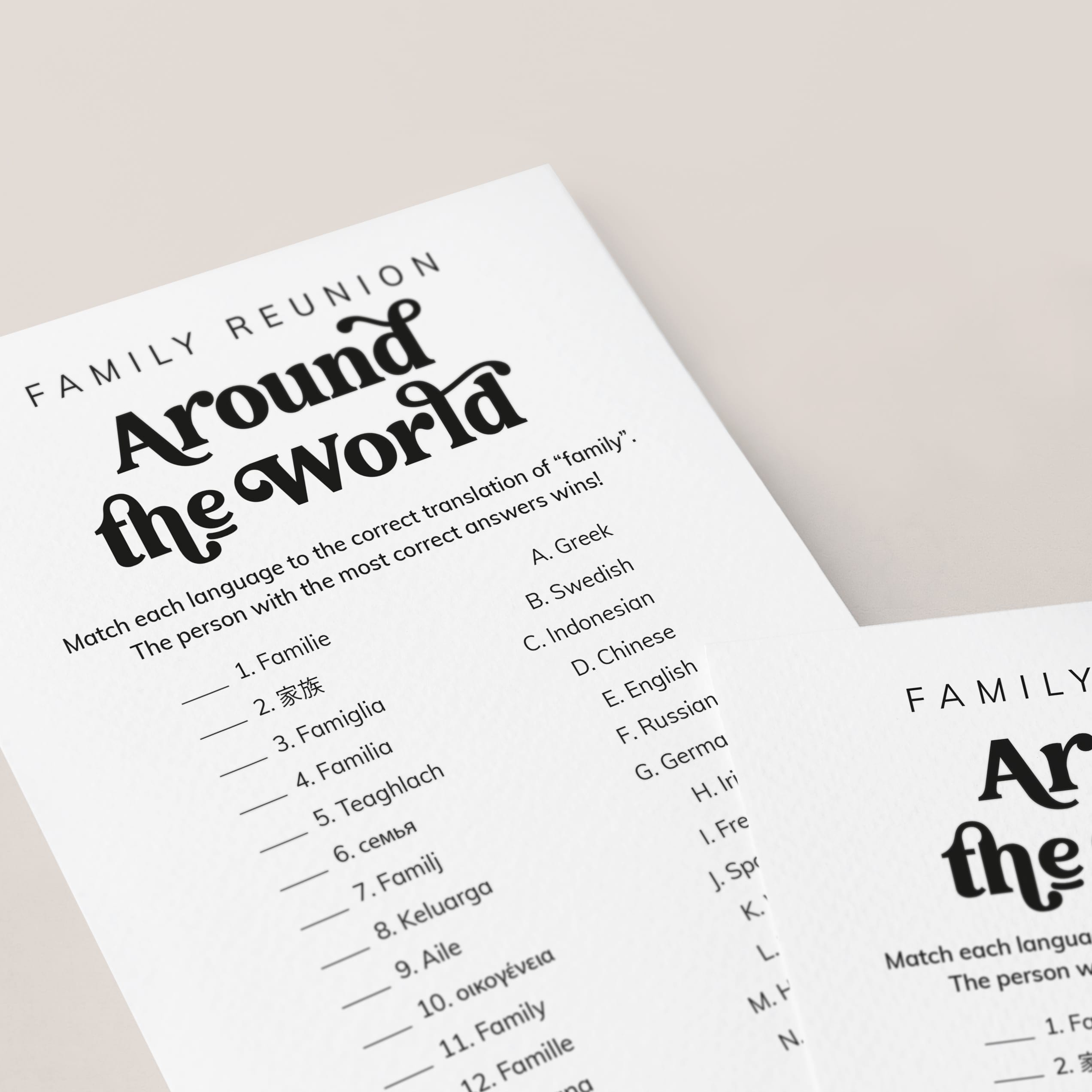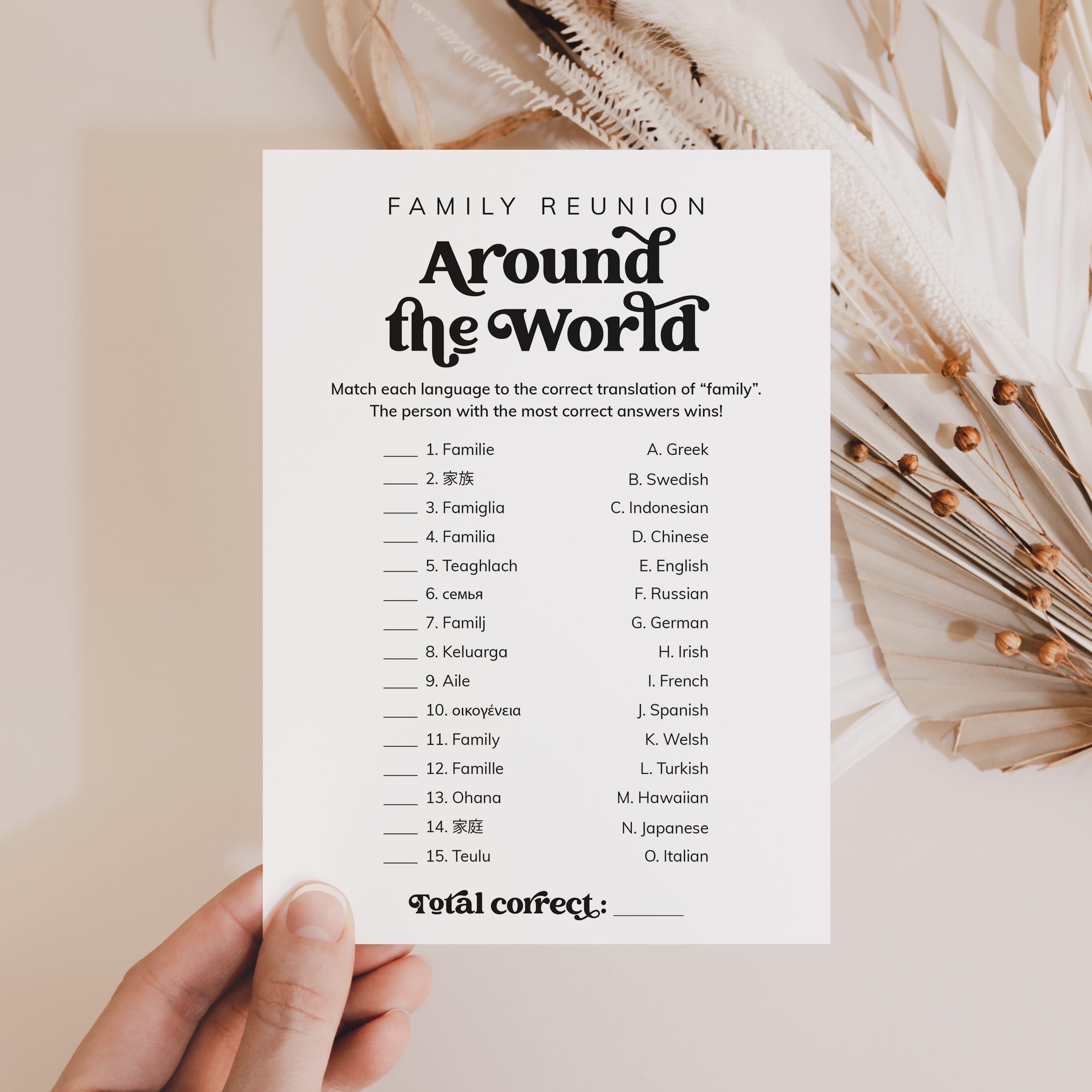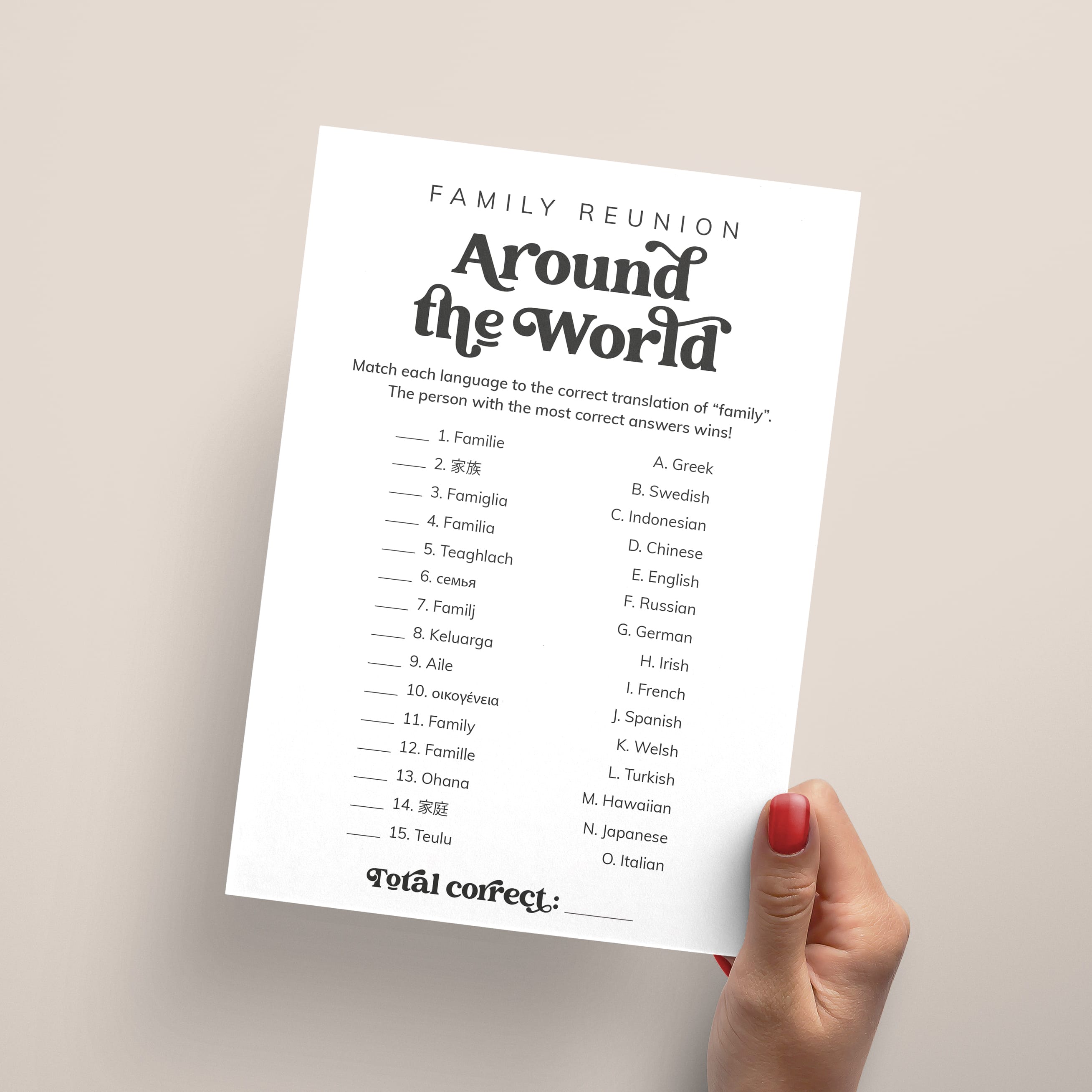 This game is simple and fun for all ages. Print and hand out these black and white Family Around the World game cards with a pen or pencil to each guest. Everyone must try to match each version of the word “Family” with its language of origin. The person with the most correct answers wins.
