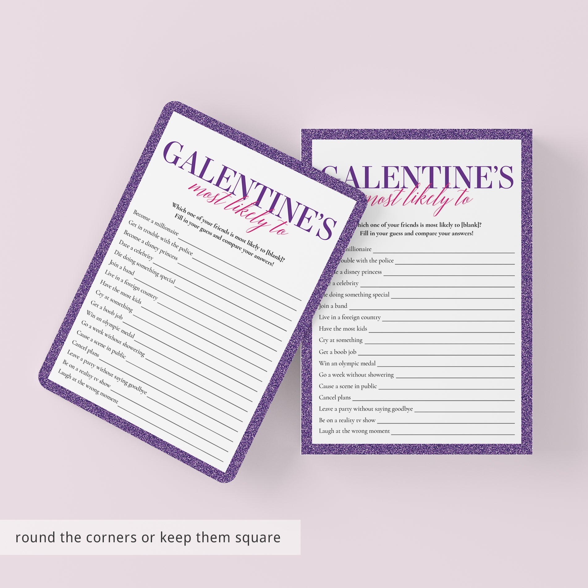 Ladies celebrating ladies. It’s time to celebrate the most important people in your life: your girlfriends. Celebrate Galentine's Day with your girlfriends or have a party with your girl squad any day of the year. This purple glitter Galentines games bundle will help you and your gals have a memorable party.