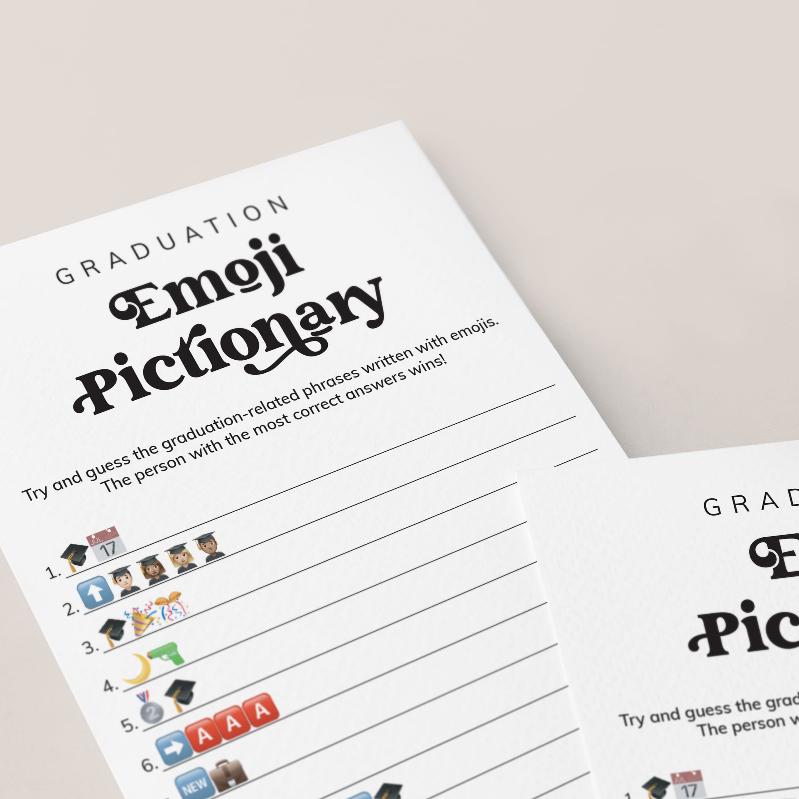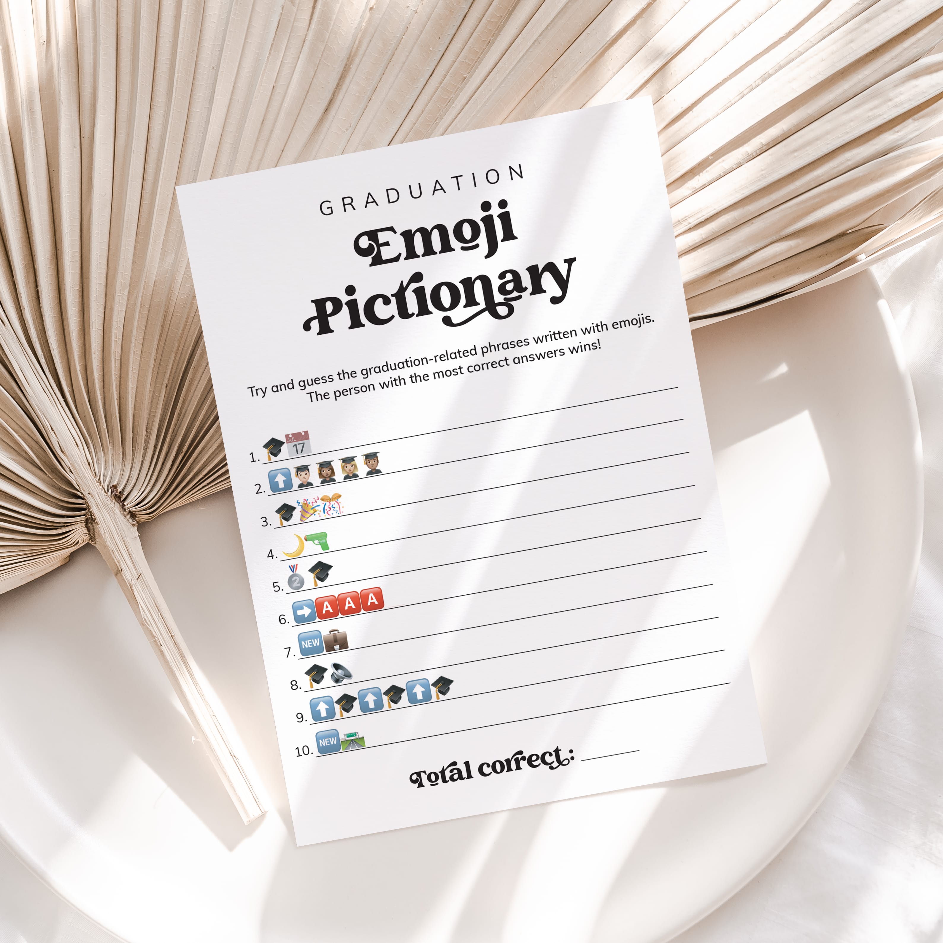 Are you looking for a fun game to play at your graduation party? Play Emoji Pictionary! It's a great game for all ages. Play this black and white graduation game, featuring a creative script font, at a high school graduation party or college graduation party. Games are a must for every grad party!