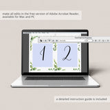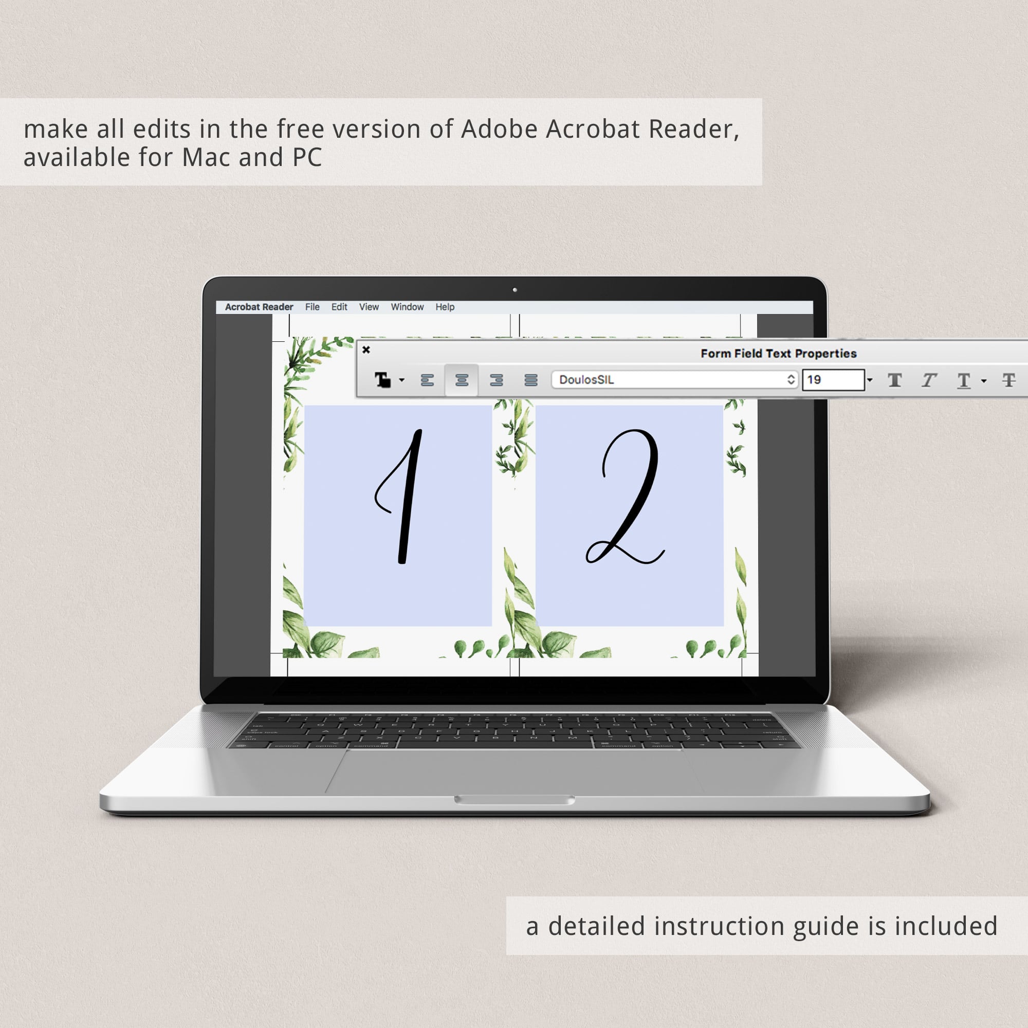 The greenery table number template is editable in Adobe Acrobat Reader (free download). Print the table cards one-sided or double-sided. A detailed instruction guide is included as well, so that customizing the PDF templates will be an easy and fun DIY project for anyone.