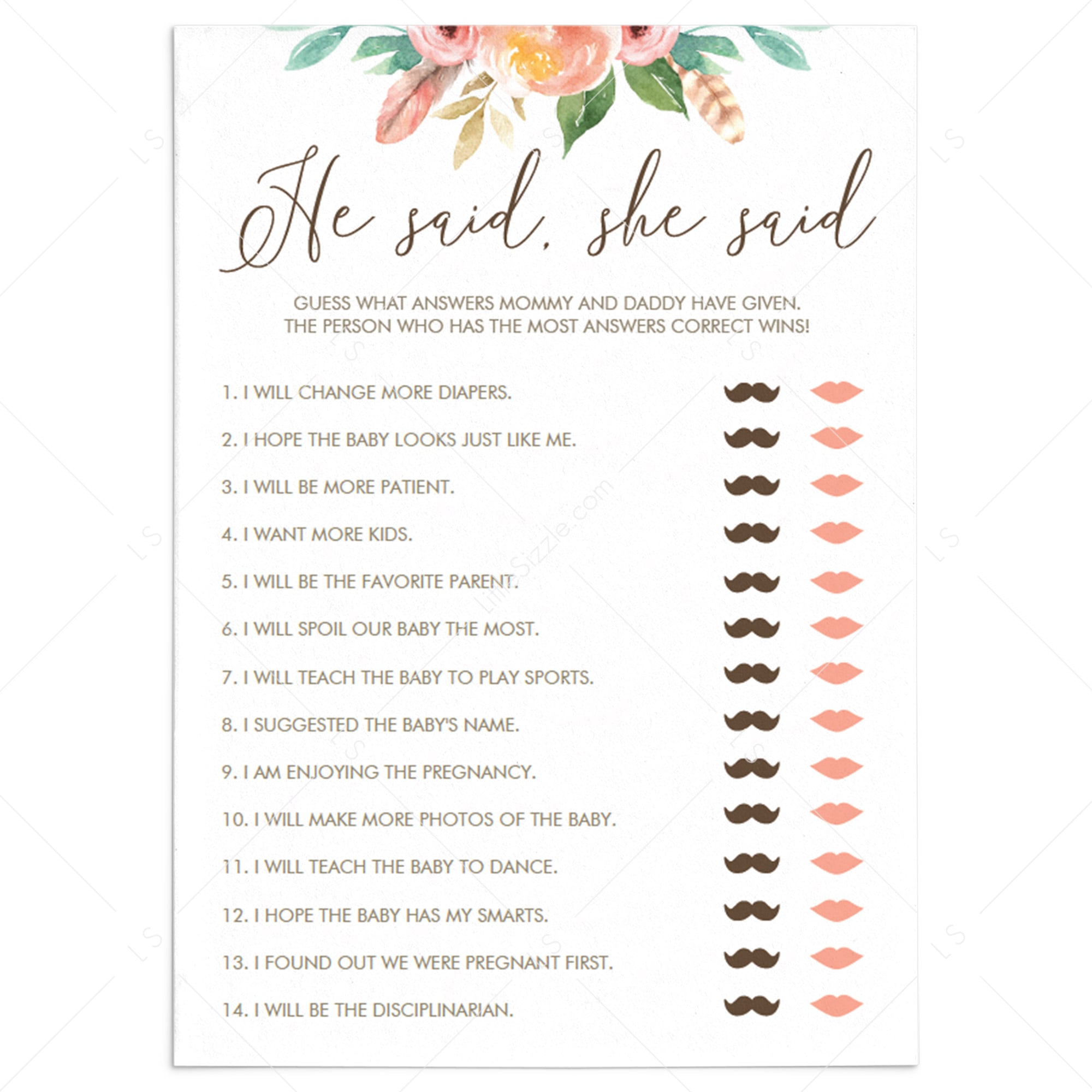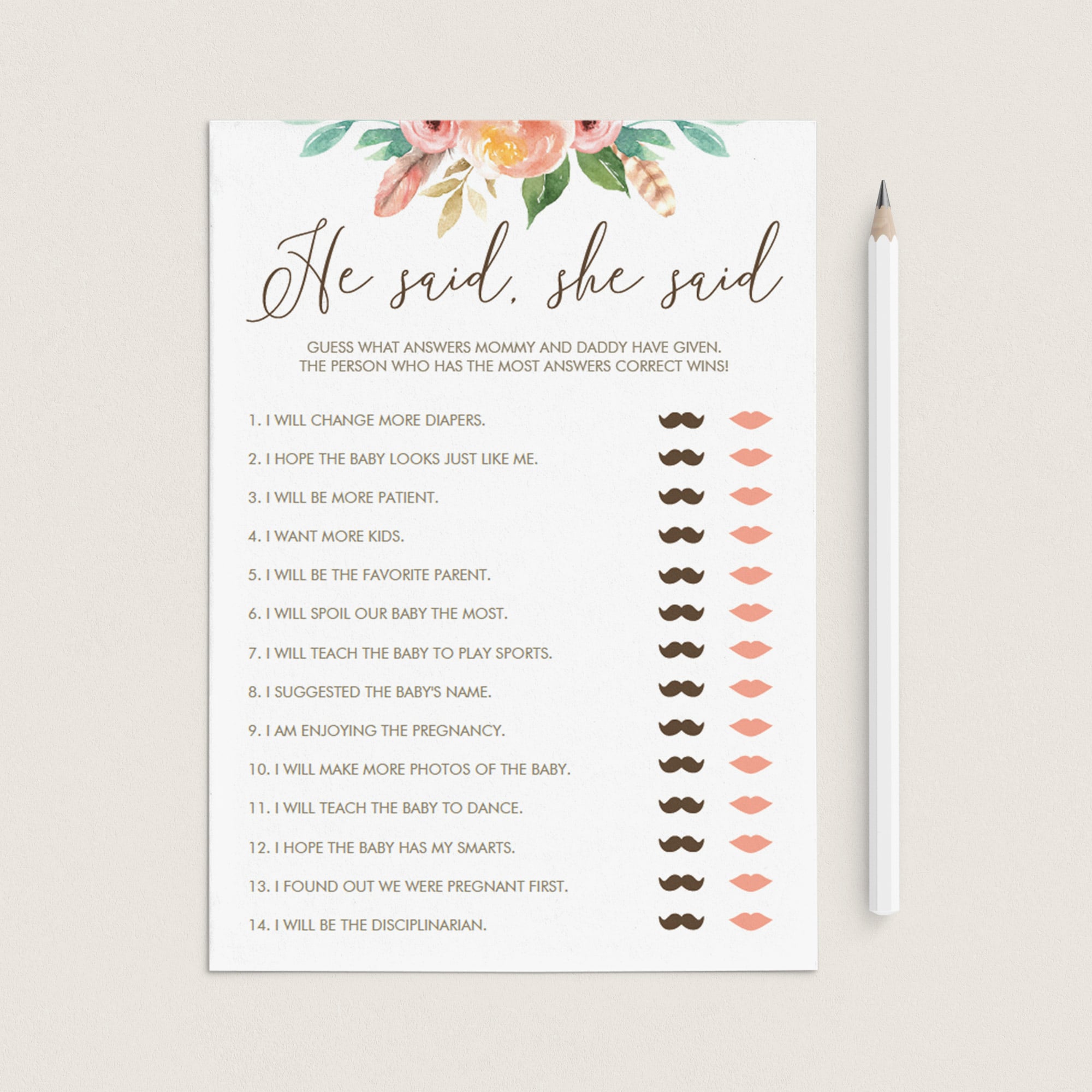 A "He Said She Said" game is such a fun way to find out some more about the new parents. This game is especially fun if you are hosting a coed baby shower.