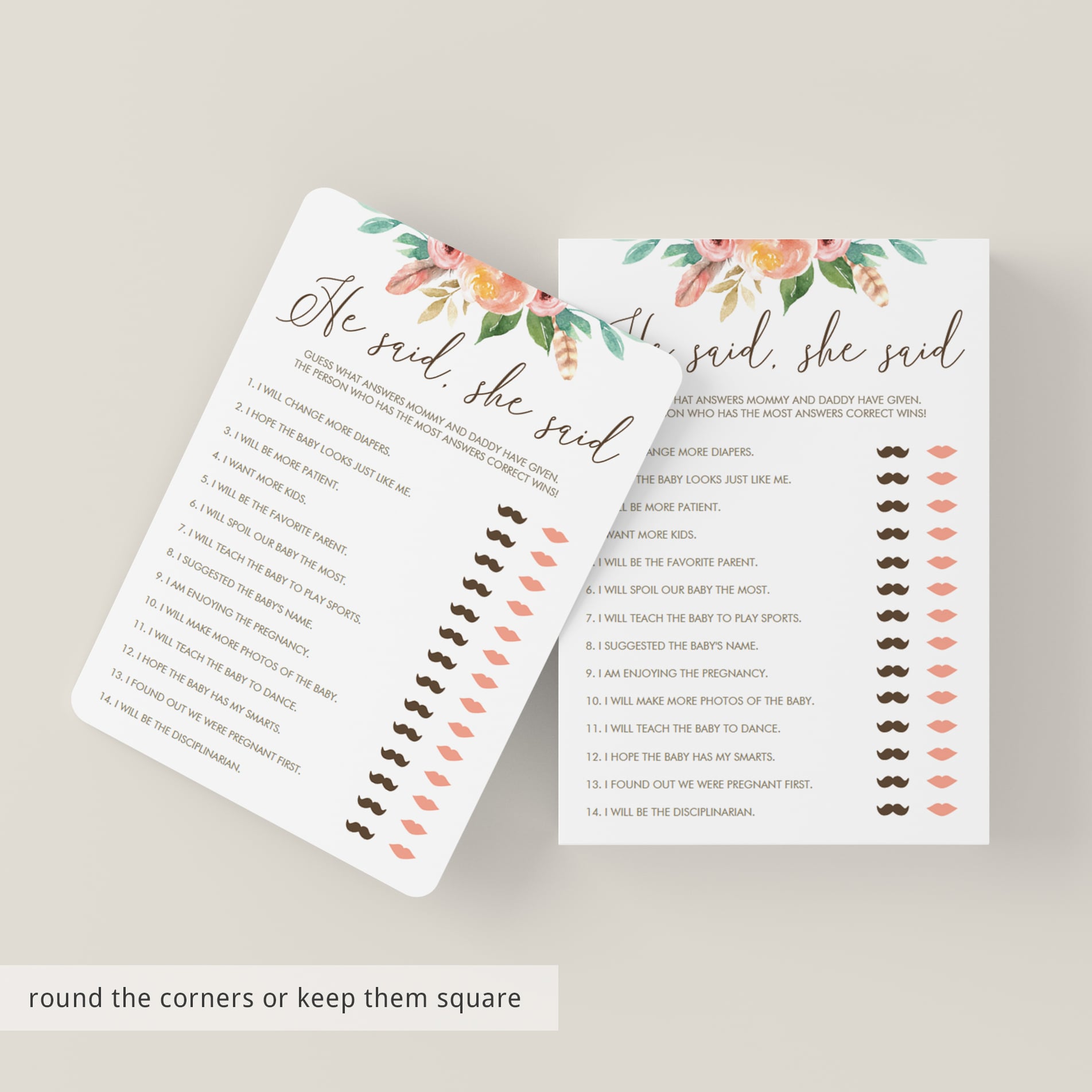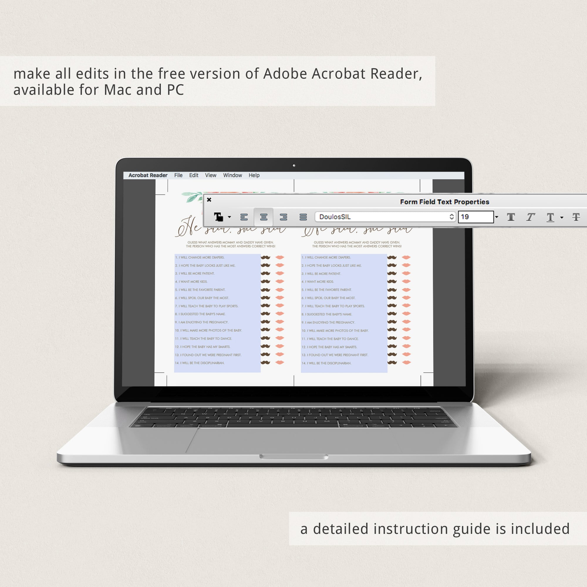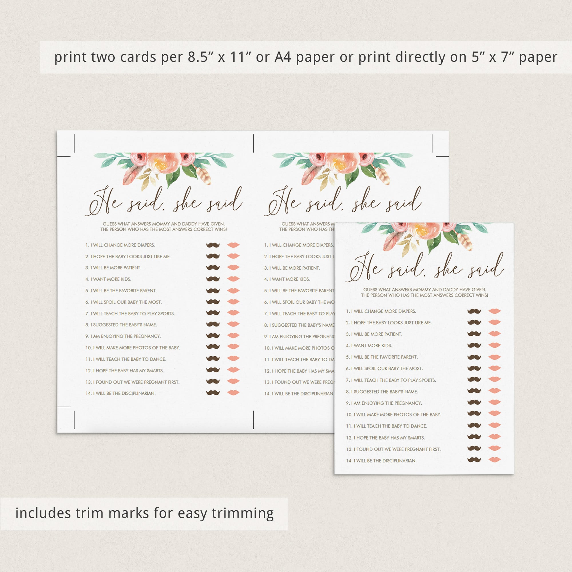 This floral He Said, She Said game template is editable in the free version of Adobe Acrobat Reader. After downloading the file, personalize the game and print it in just minutes. Print these game cards on any 8.5" x 11" or A4 paper of your choice. We recommend a nice heavy card stock for the highest quality feel. A detailed instruction guide with tips & tricks on editing, printing, trimming, paper choices and more is included.