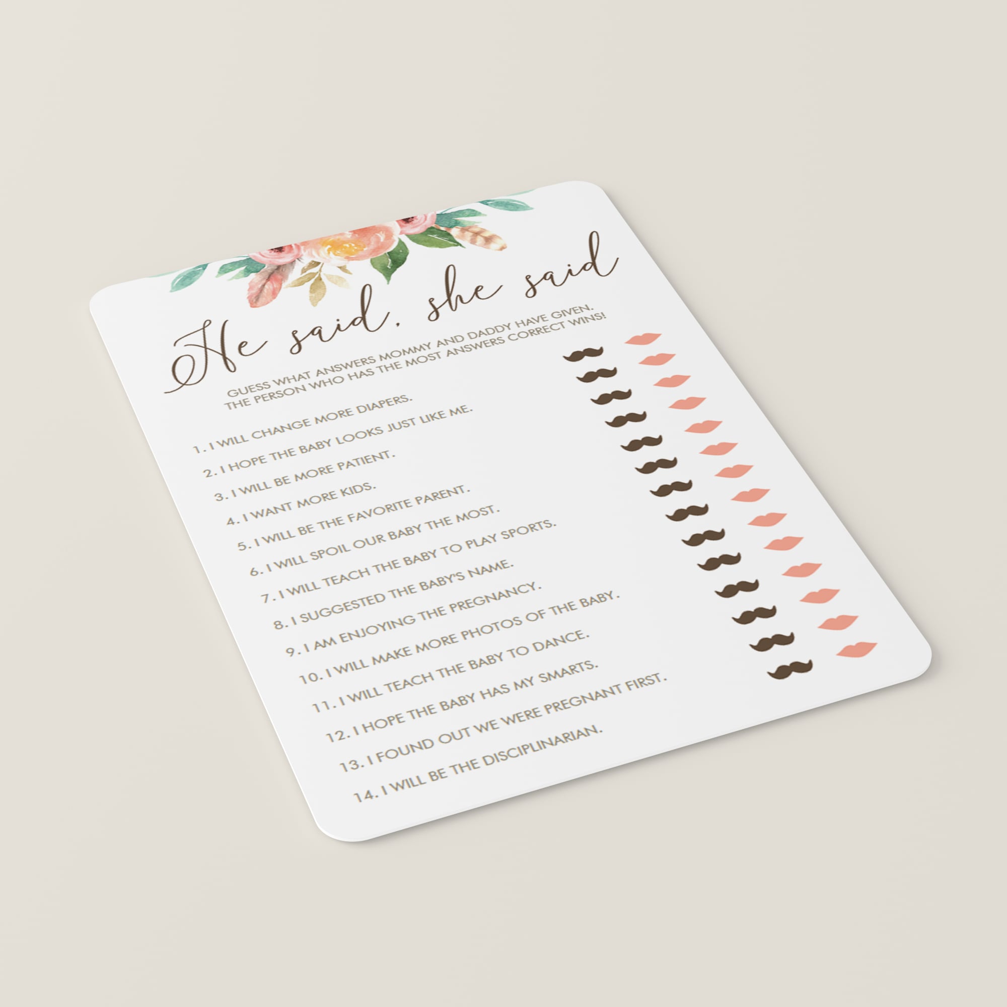 Before the baby shower, ask the mom and dad-to-be the questions listed on the watercolor floral game sheet and write down their answers. The questions can be personalized. Who suggested the baby’s name? Who will teach baby to dance? Who will be more patient?