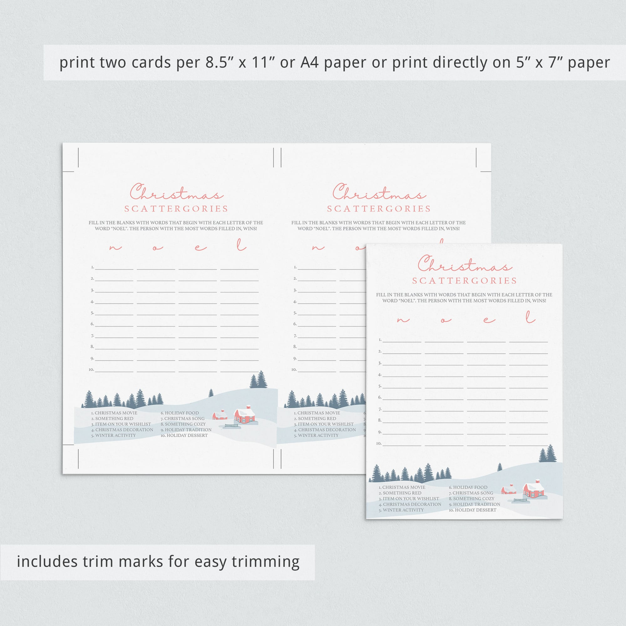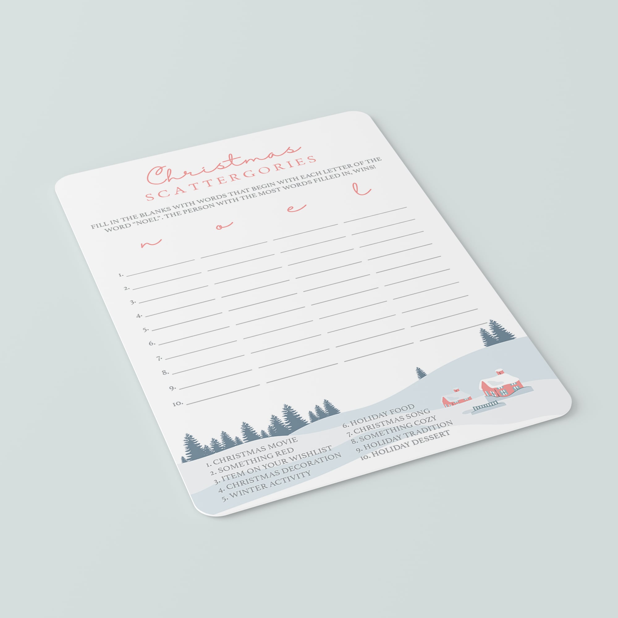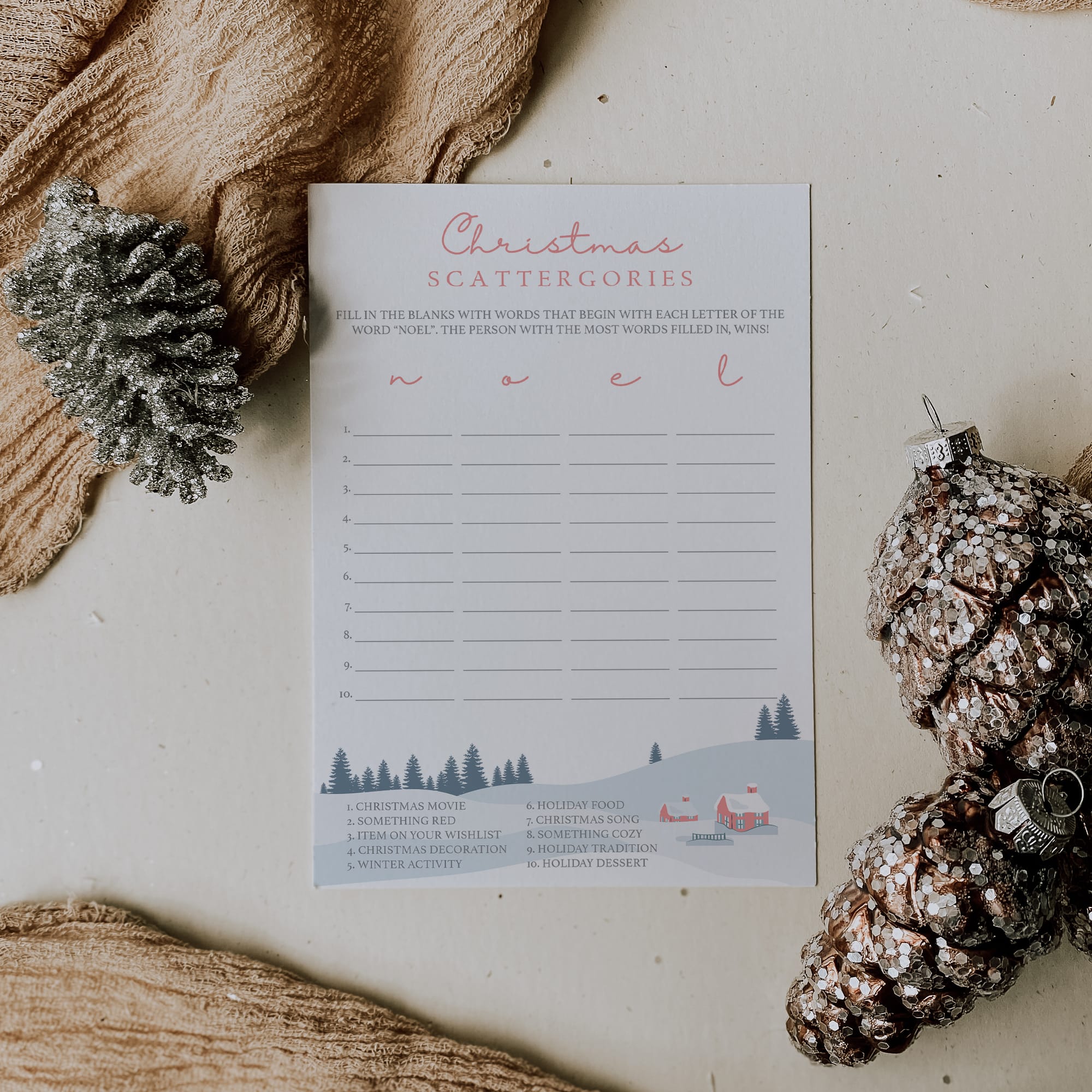 How to play Scattergories? Simply hand out this game card with beautiful winter landscape and a pen to your guests. They will have to come up with as many words related to the categories at the bottom of the sheet. The difficulty is that the words must begin with the letters in the word "NOEL". The person that gets the most words filled in within the set time, wins!