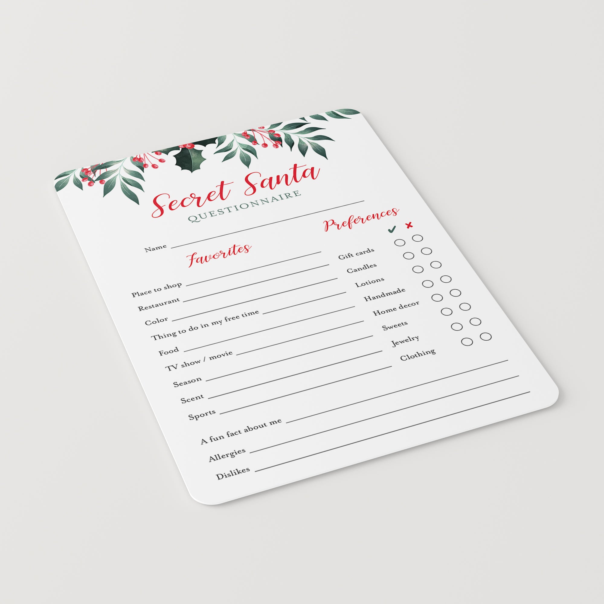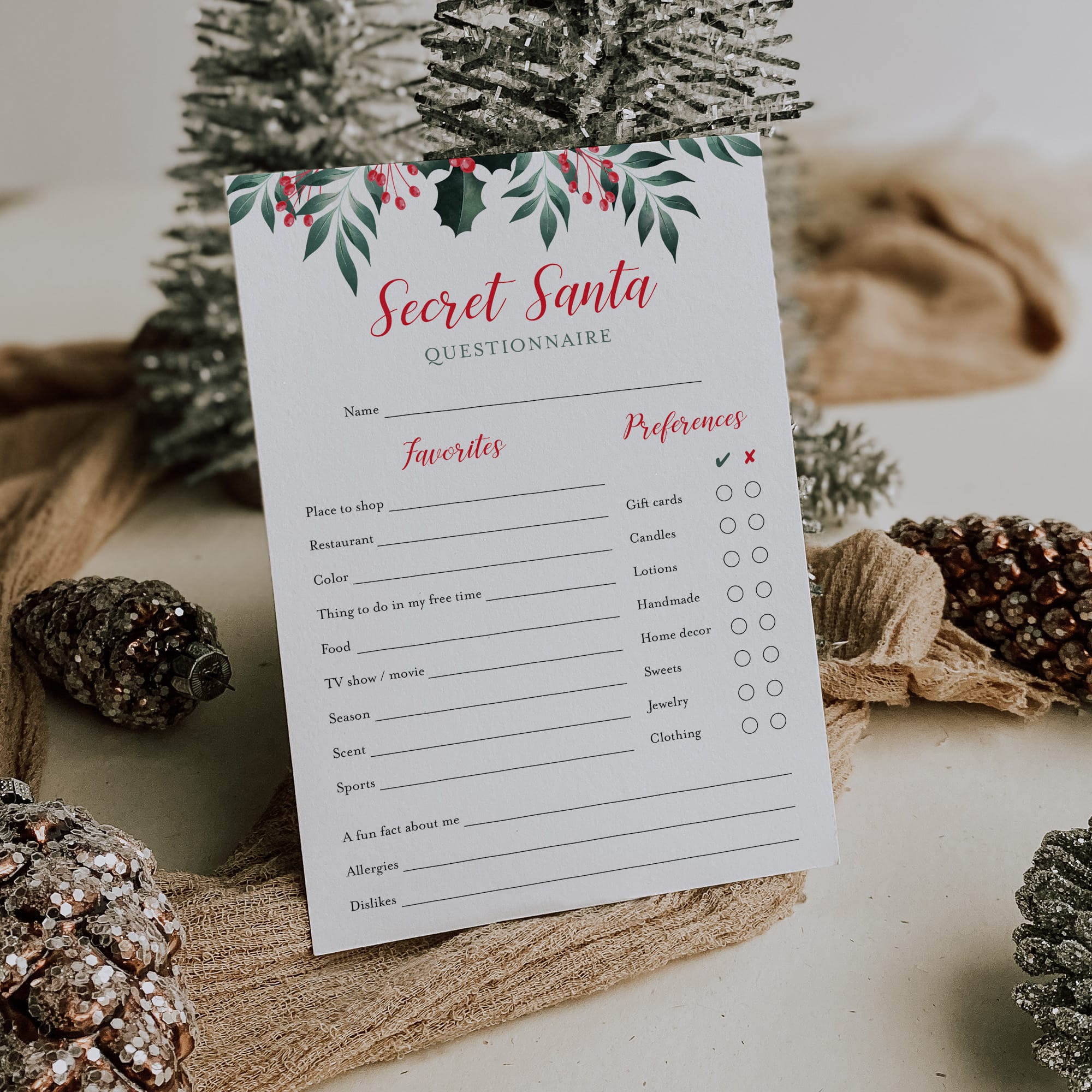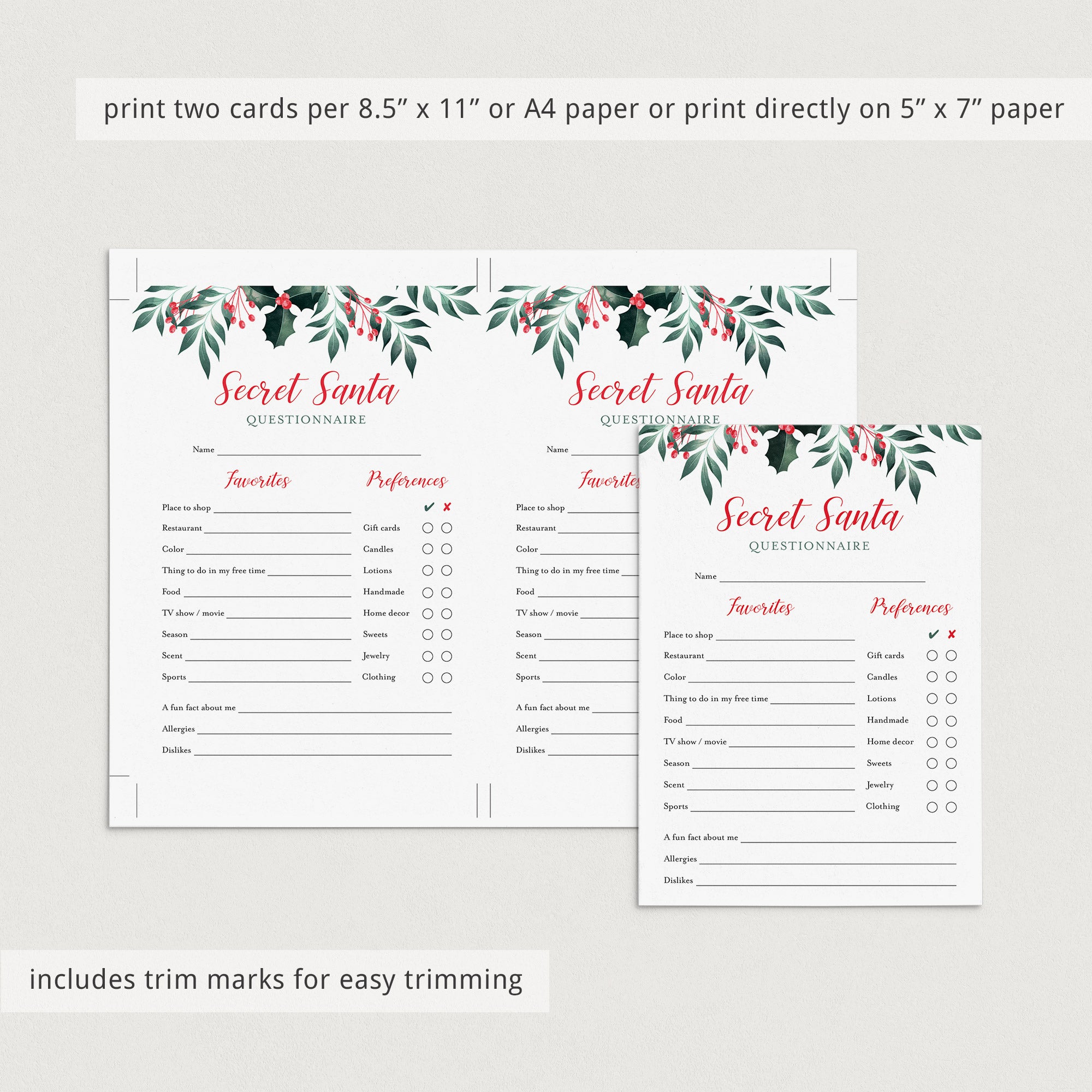 Make this year's planning and buying holiday gifts easy and organized with this printable Secret Santa questionnaire. Have everyone fill out one of the cards with watercolor greenery and Christmas holly which will make your holiday gift shopping stress free.