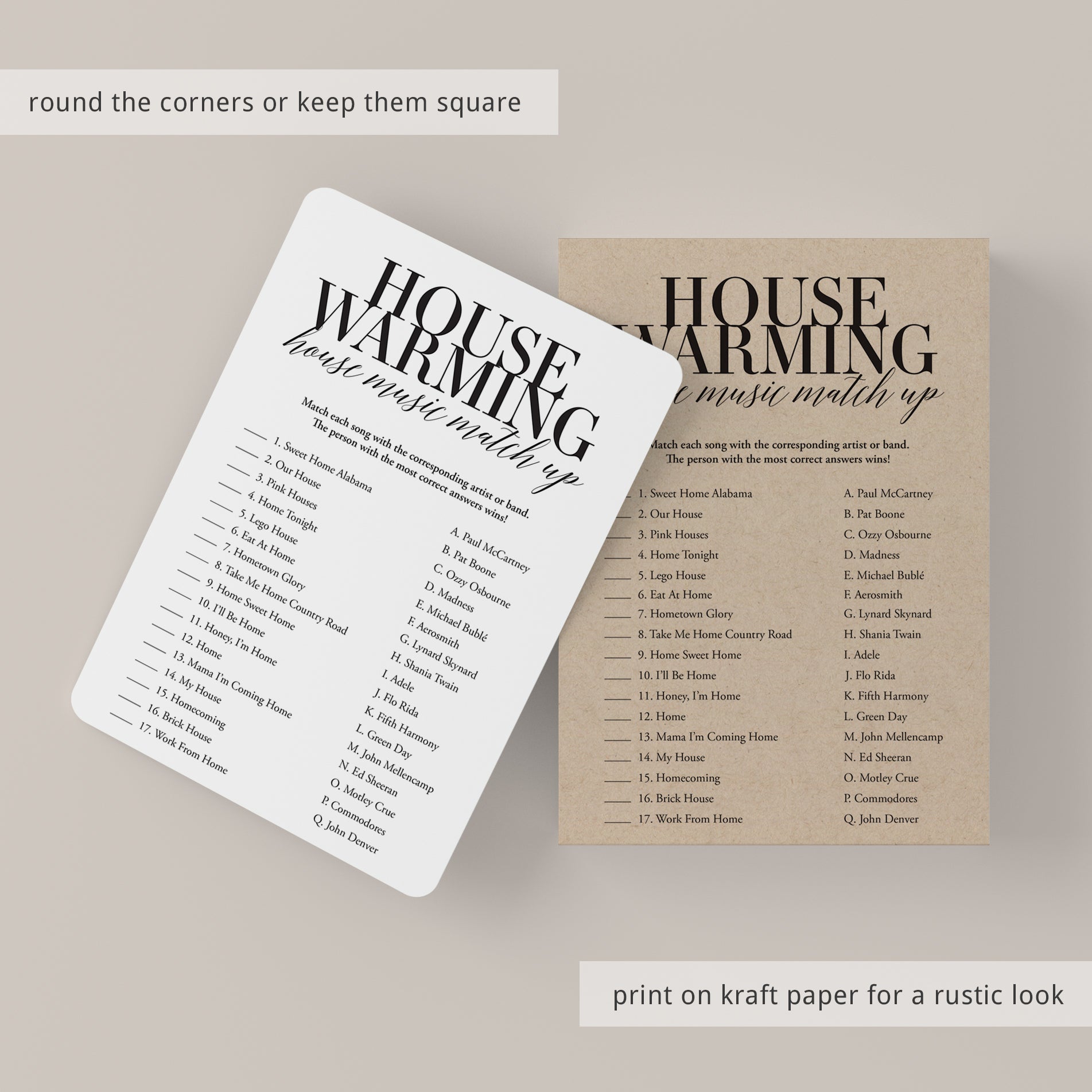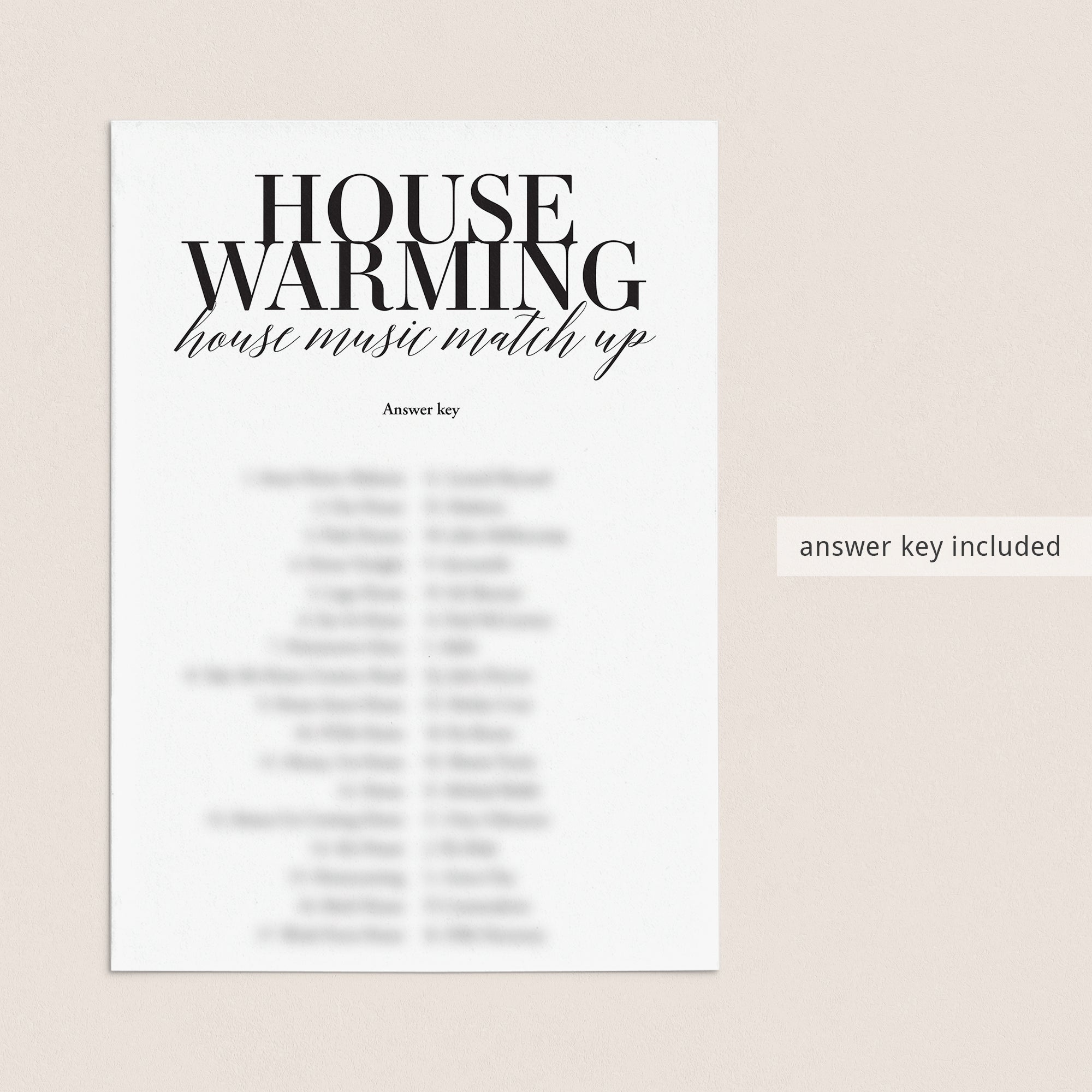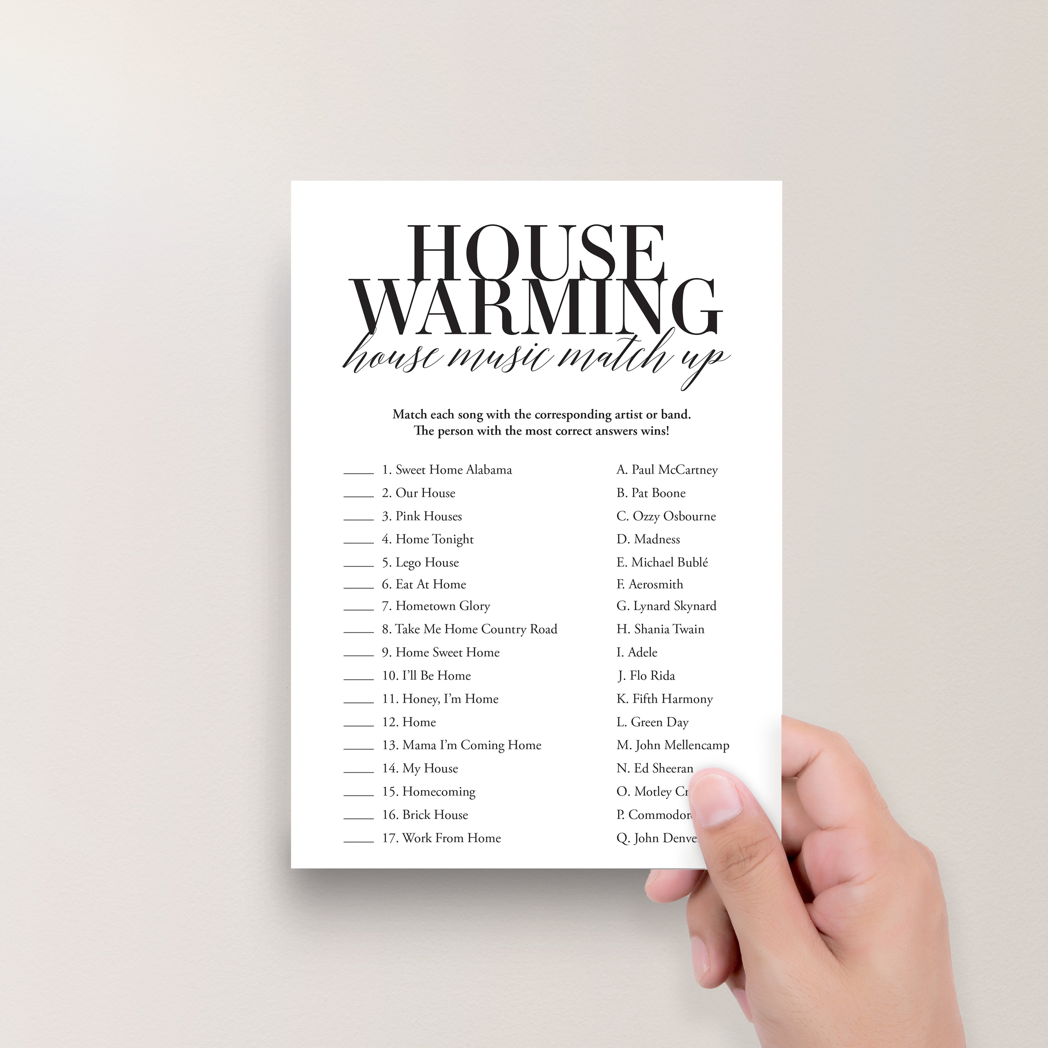 The game is very easy to play. Hand out this minimalist black and white housewarming game to your guests. Have them match the song titles with the word "home" or "house" in it with the corresponding artist or band. The person with the most correct answers wins. An answer key is included.