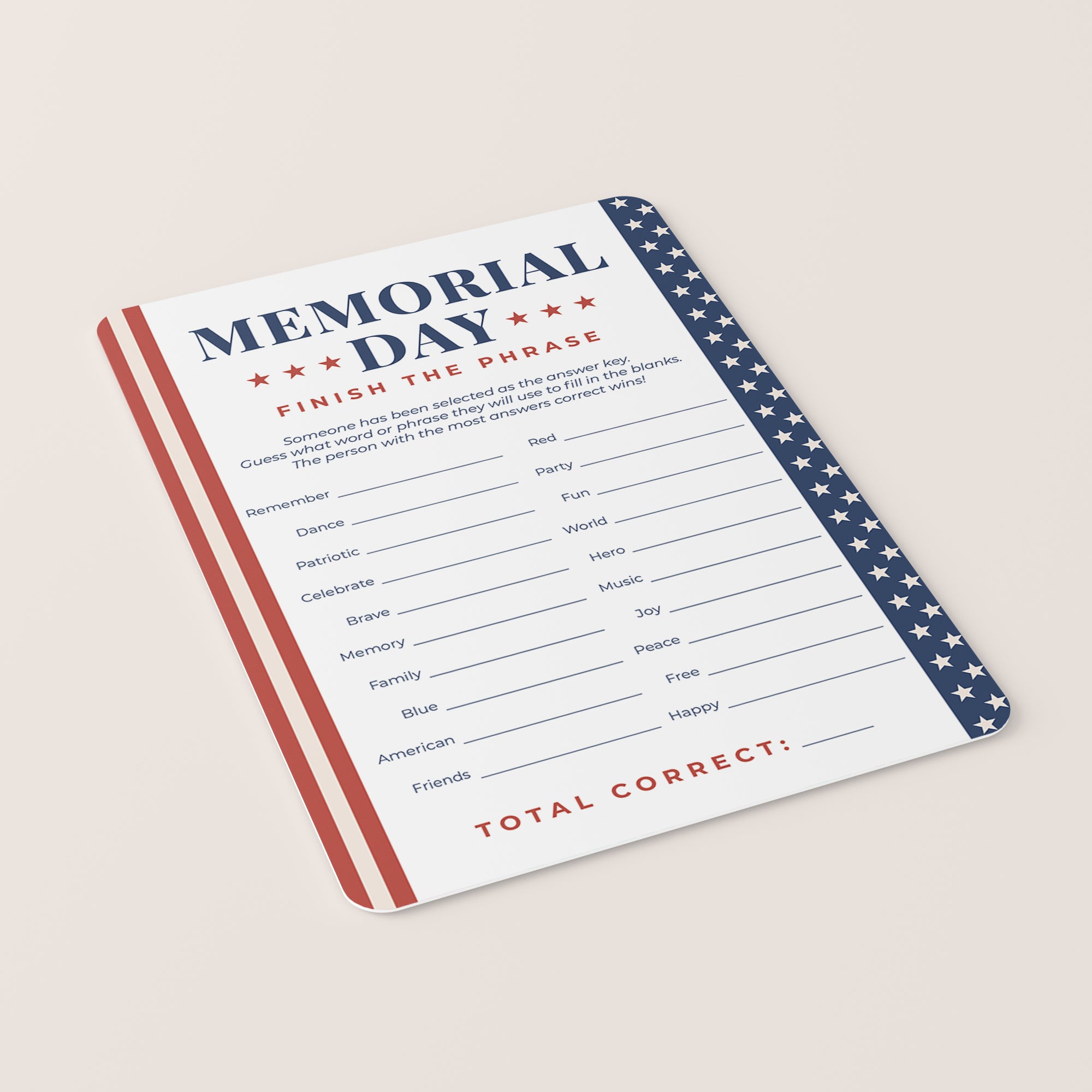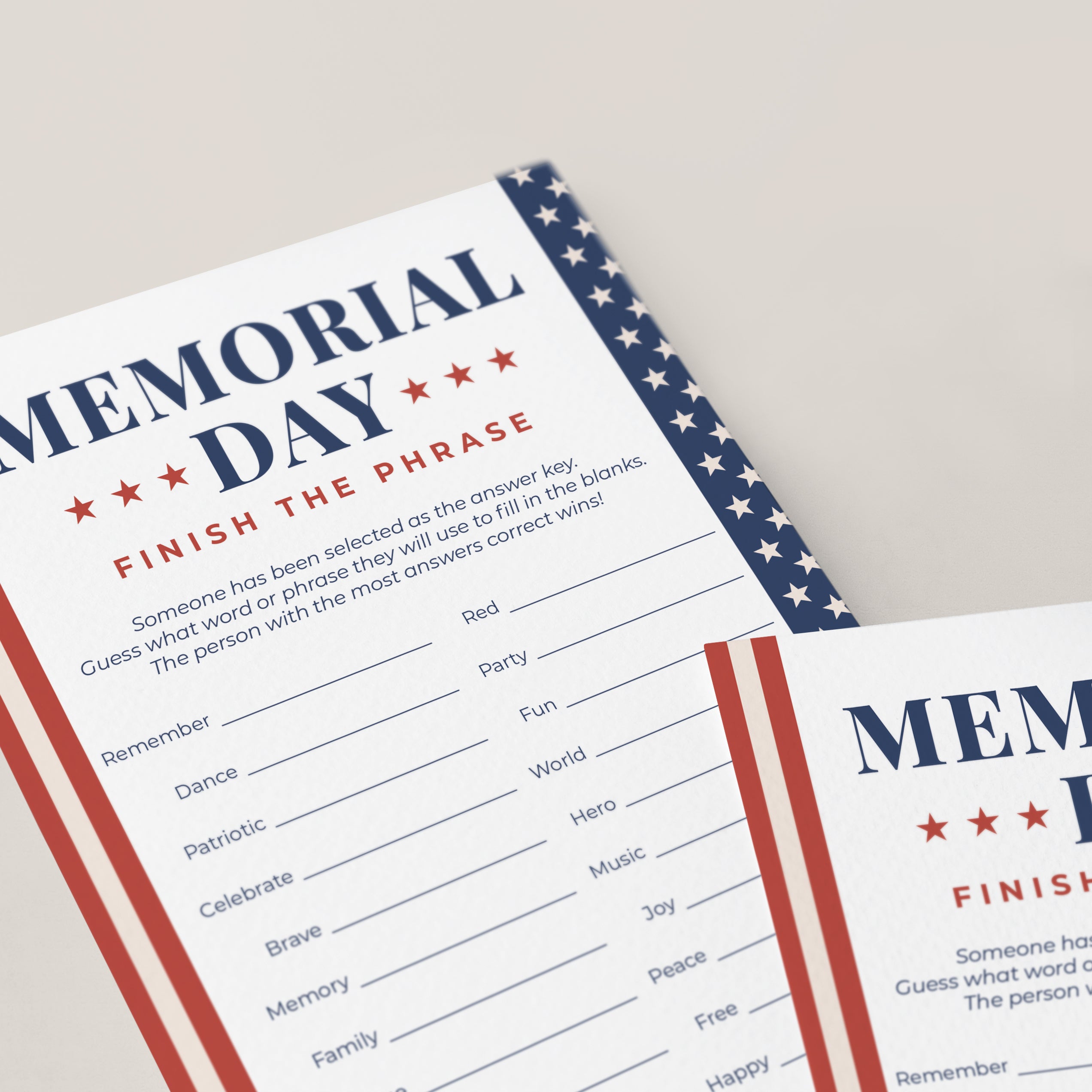Memorial Day Finish The Phrase is a great game to play with large groups. It is a fun activity for kids and adults of all ages and very easy to play. You can play this game in classrooms, at the office or with friends and family. It's the perfect addition to your Memorial Day weekend celebration.