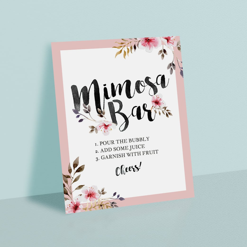 A Mimosa Bar will take your party to the next level. Use this pretty blush Mimosa Bar sign with watercolor flowers to decorate your Mimosa Bar Table and help guests know how to prepare their drinks. You'll easily add a lovely touch to any floral themed party.
