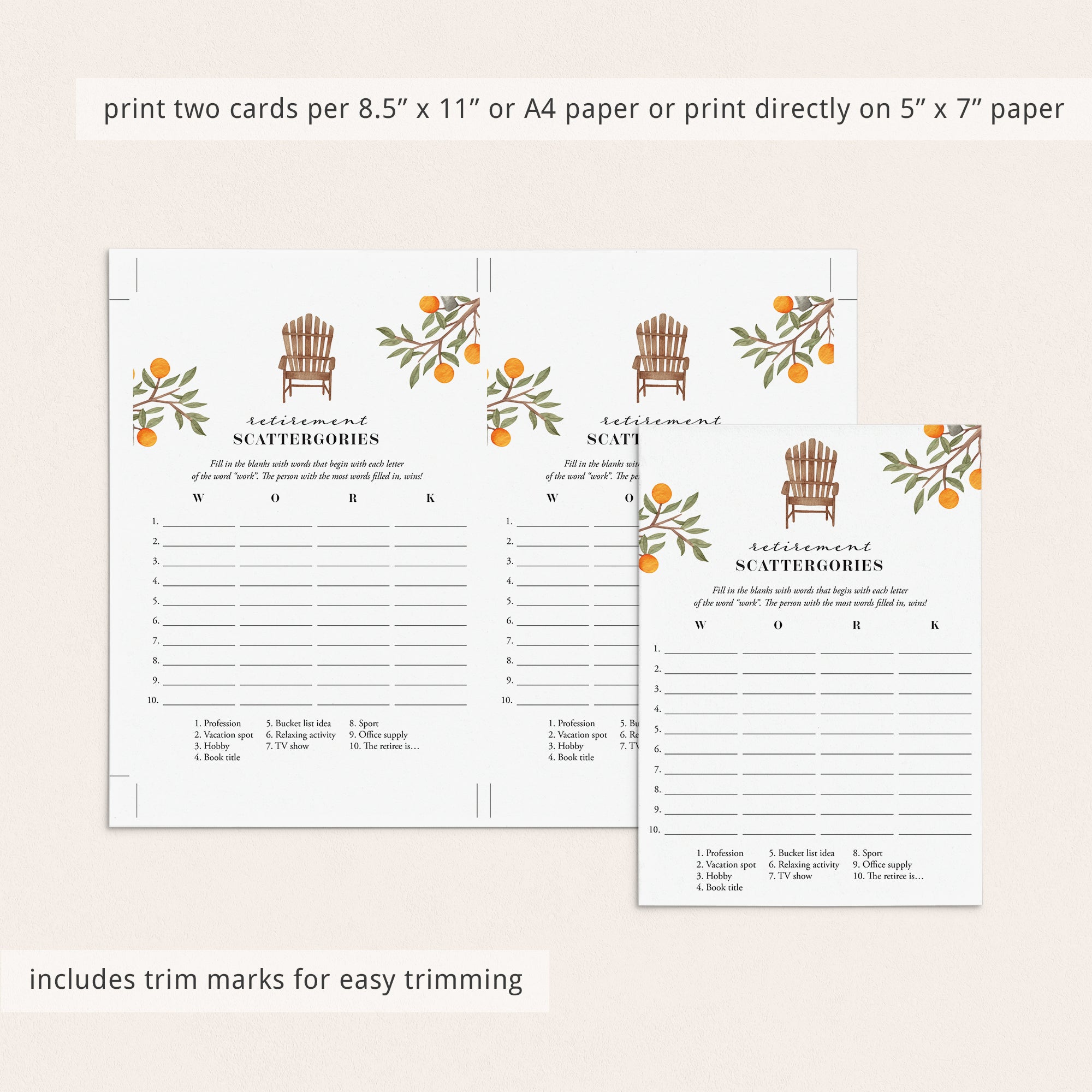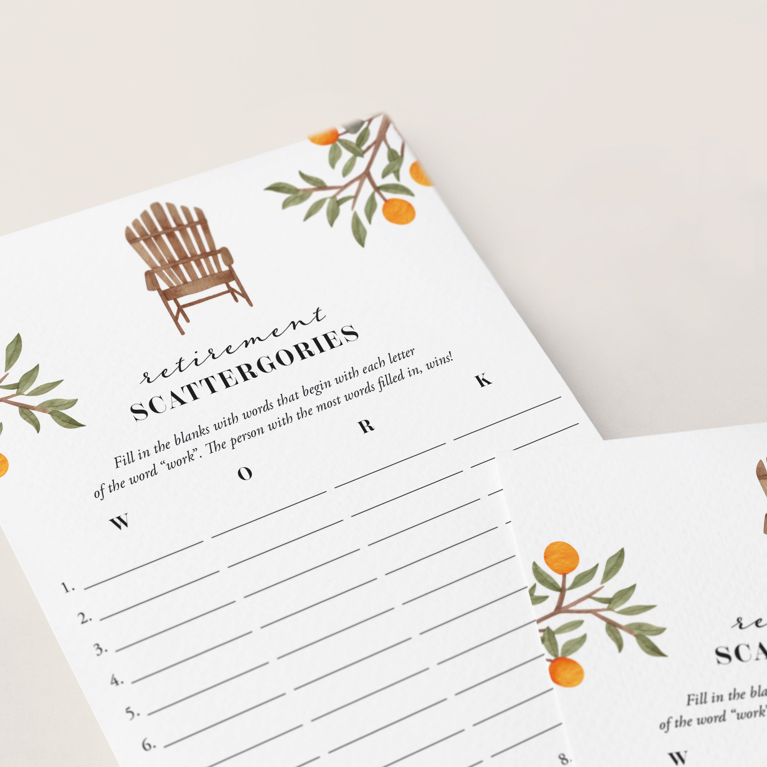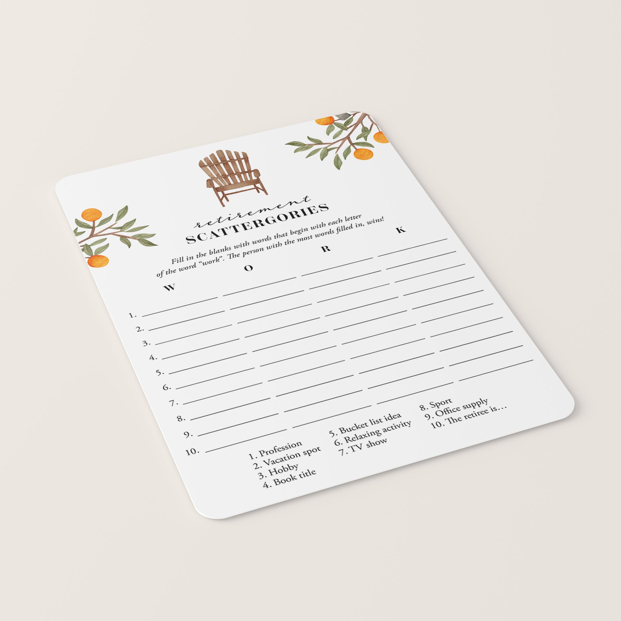 How many words can you fill in with the letters "W", "O", "R" and "K"? Play Scattergories at your retirement party with these beautiful watercolor game cards to ensure lots of fun and laughter. It's a great game for all ages.