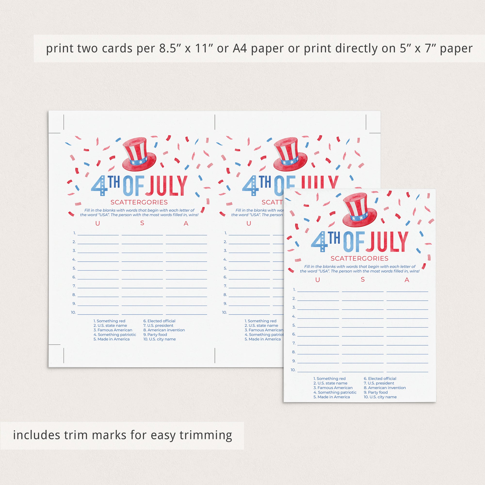 The game is very easy to play. Simply hand out this patriotic Scattergories game with watercolor confetti and Uncle Sam's Hat to your friends and family. They will have to come up with as many words related to the USA categories at the bottom of the sheet. The difficulty is that the words must begin with the letters in the word "USA". The person that gets the most answers filled in within the set time, wins!