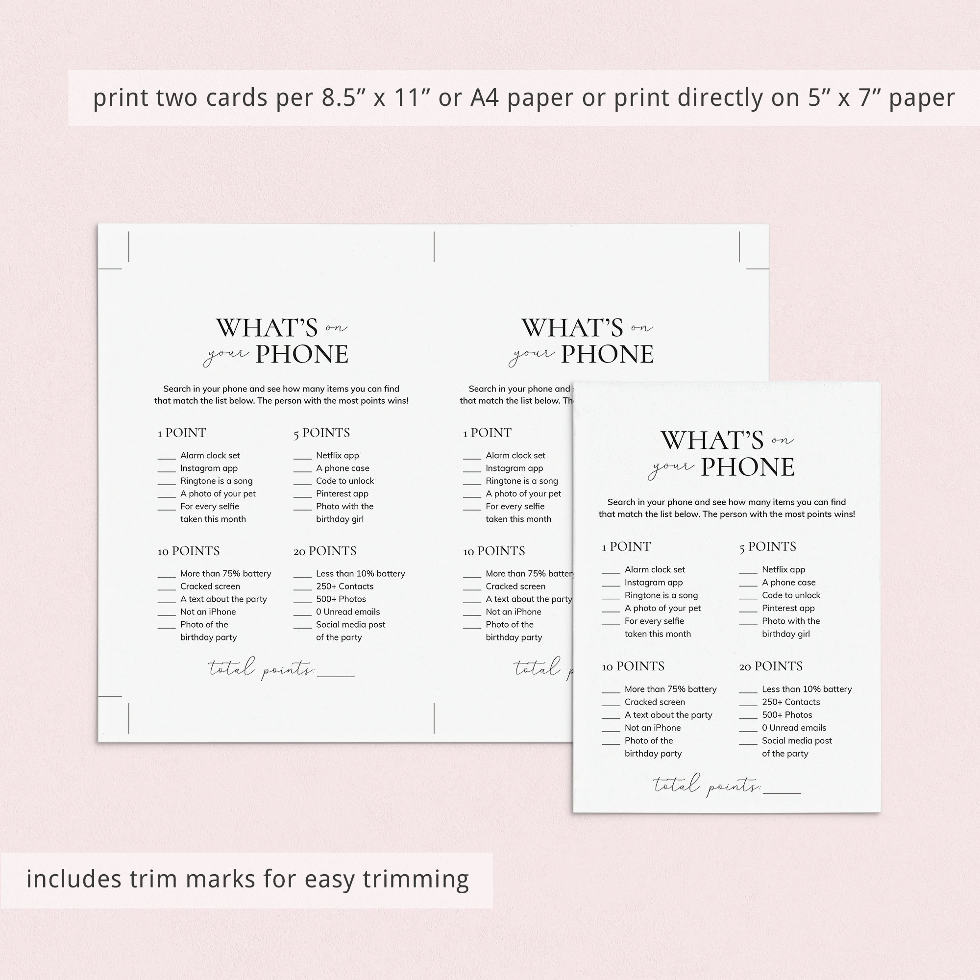 Add some fun to your next birthday party with this fun game What’s On Your Phone. It is the perfect icebreaker, super easy to prepare for AND simple to play. All guests need to play is a smartphone, one of these simple, yet elegant, Whats On Your Phone game cards and a pen.