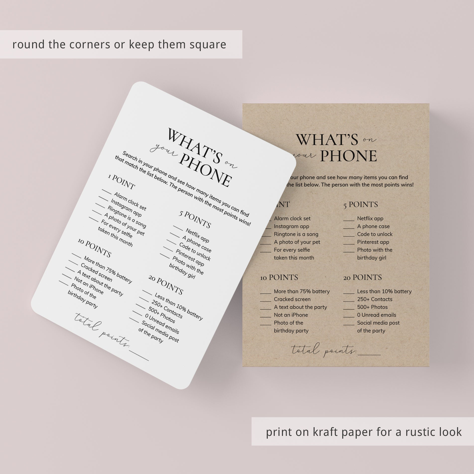 What’s On Your Phone is similar to the What’s In Your Purse game, but instead of searching for the items physically, your guests will just search for the listed items using their phone. They earn points for each item that they have in their phone.