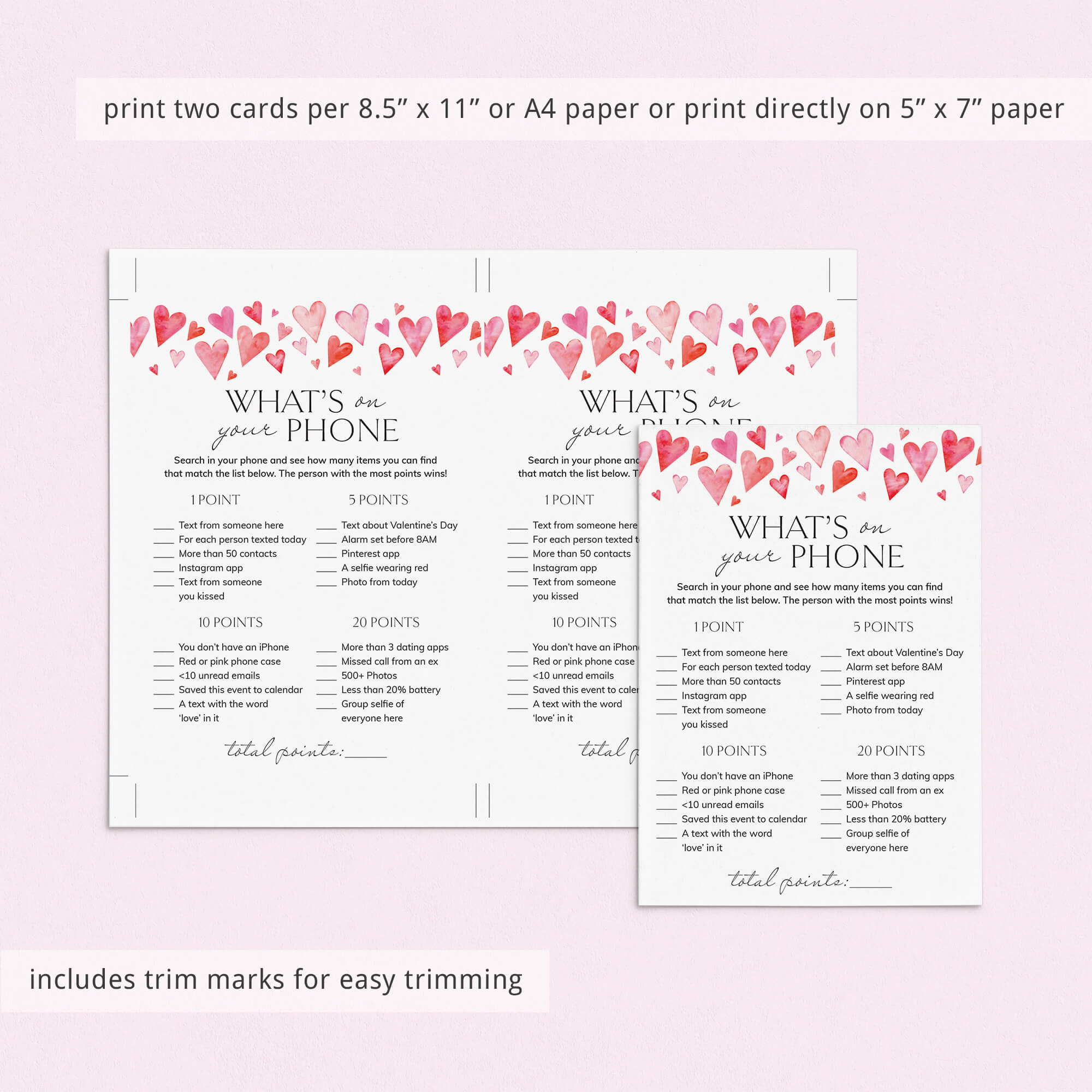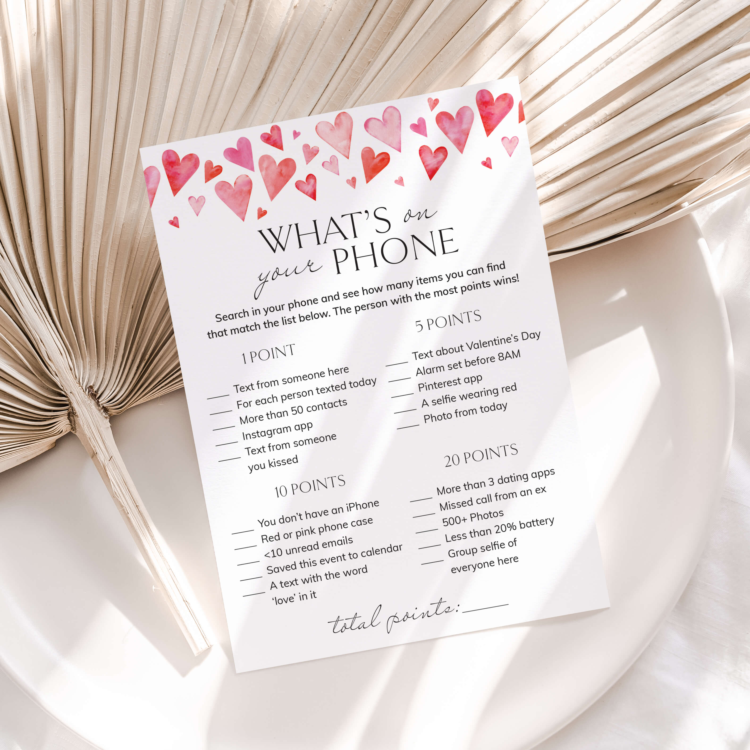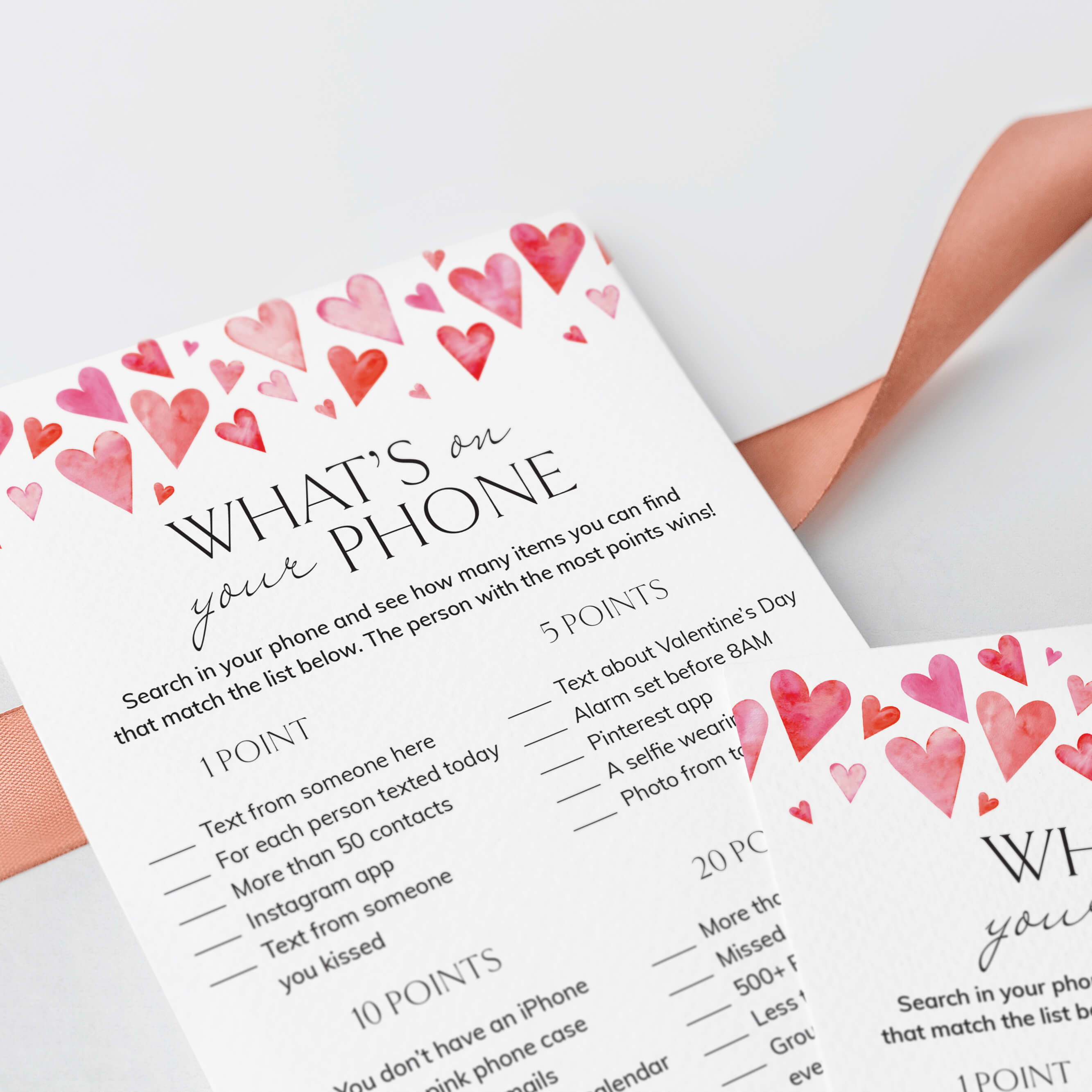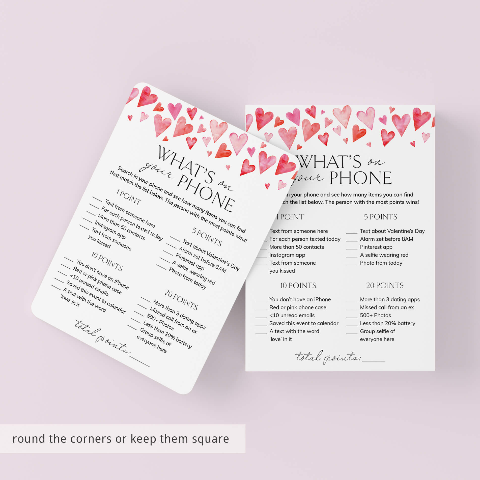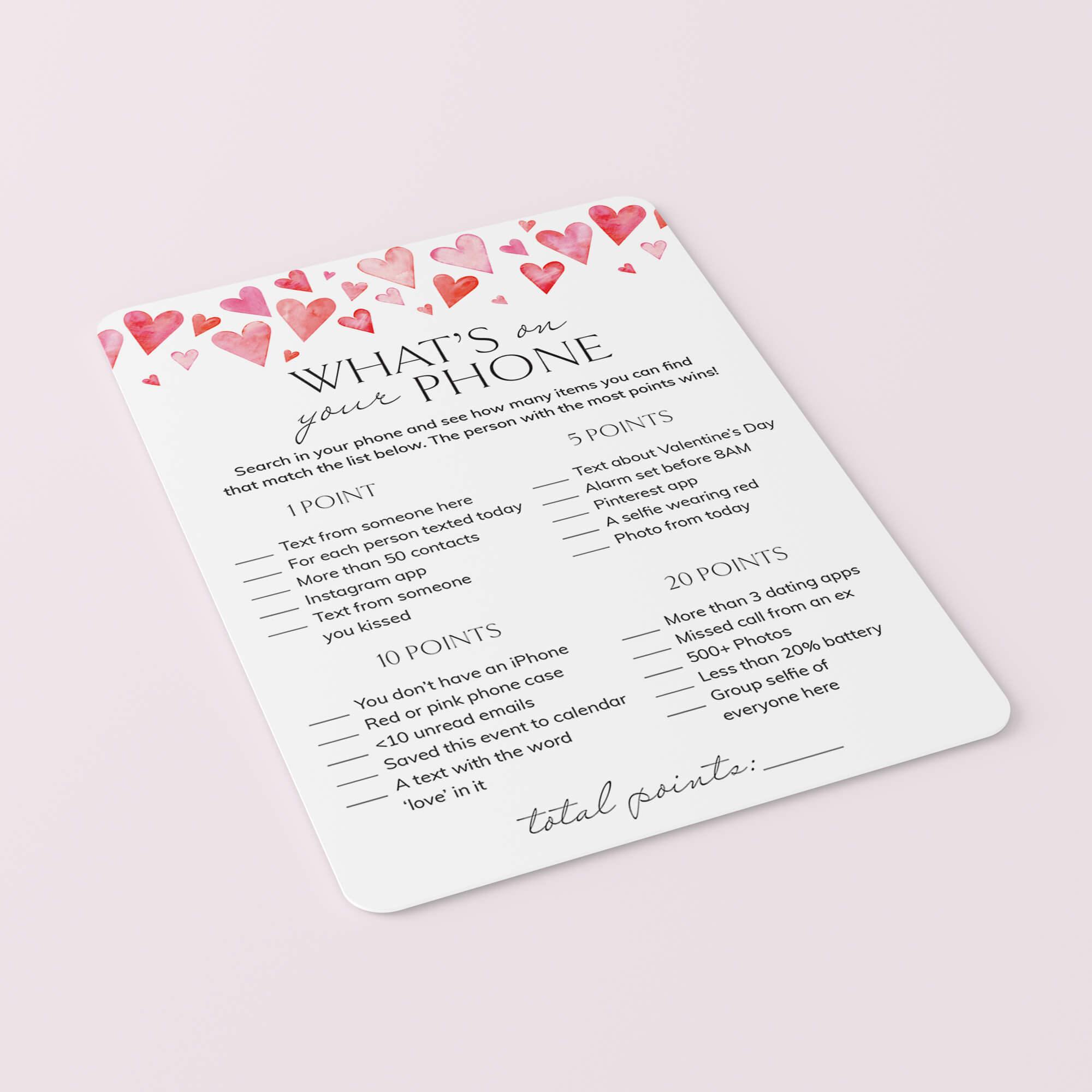 All guests need to play is a smartphone and one of these cute What's On Your Phone game cards with watercolor hearts. What’s On Your Phone is similar to the What’s In Your Purse game, but instead of searching for the items physically, your friends will just search for the listed items using their phone. They earn points for each item that they have in their phone. Things like having a red or pink phone case, a dating app, a group selfie and much, much more. The person with the most points, wins!