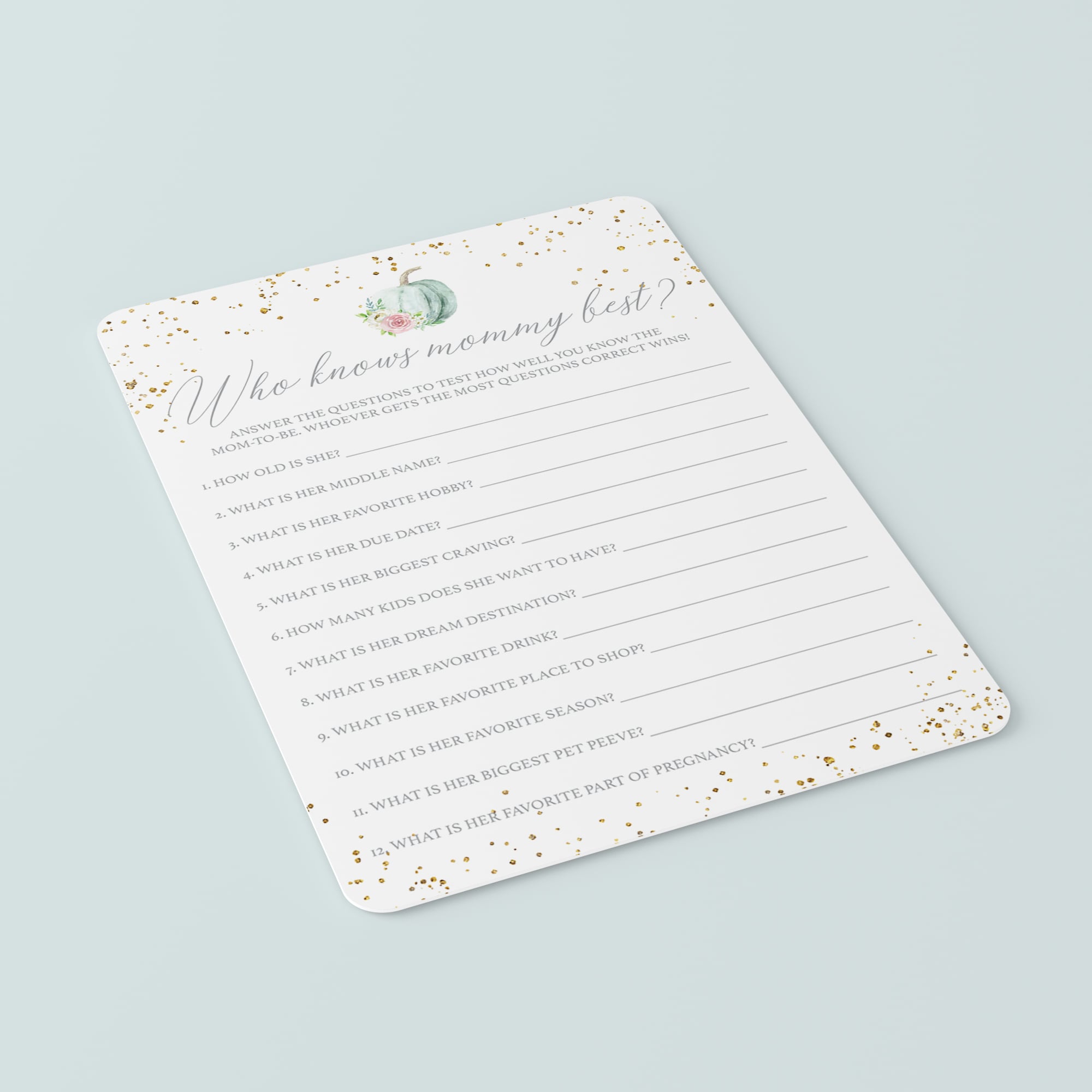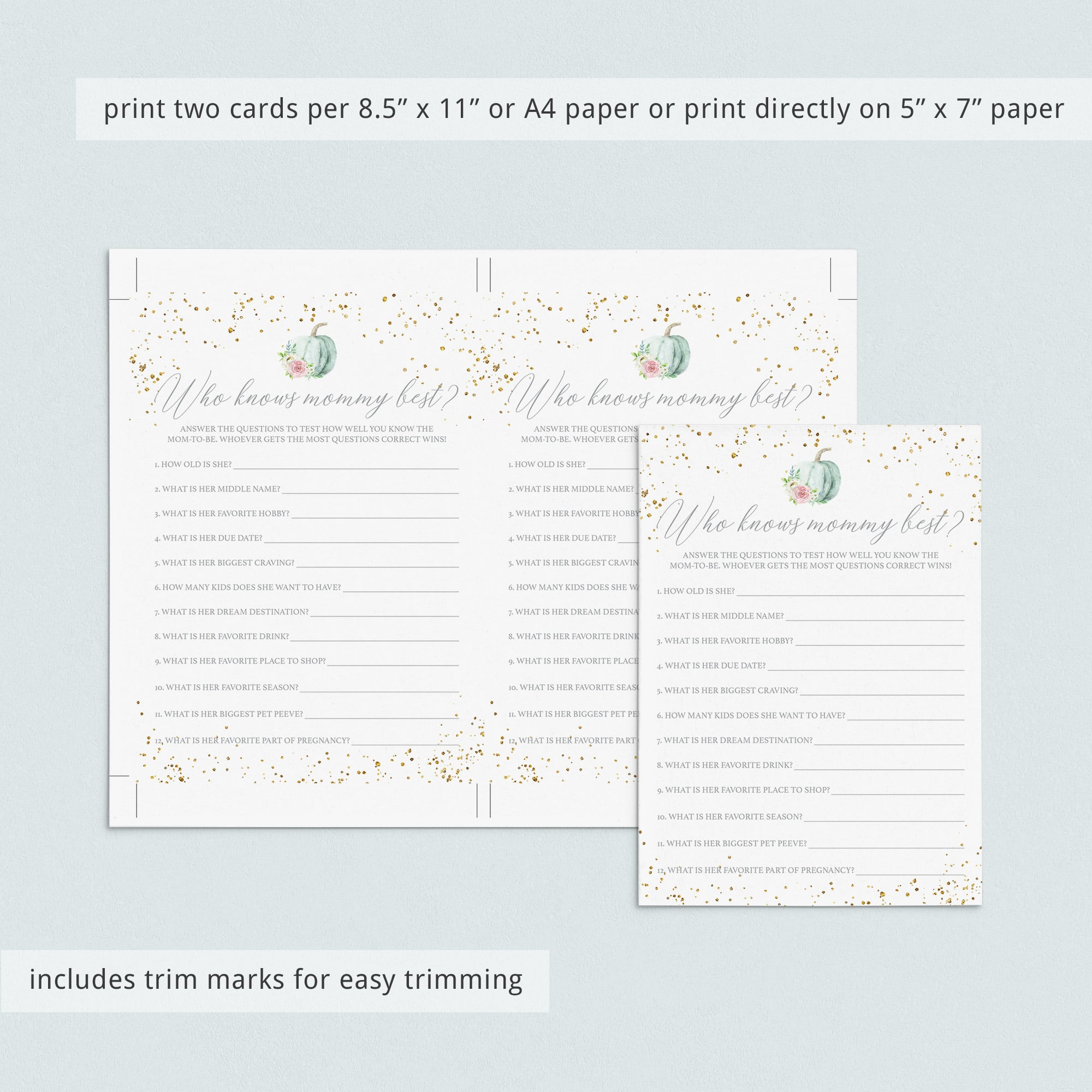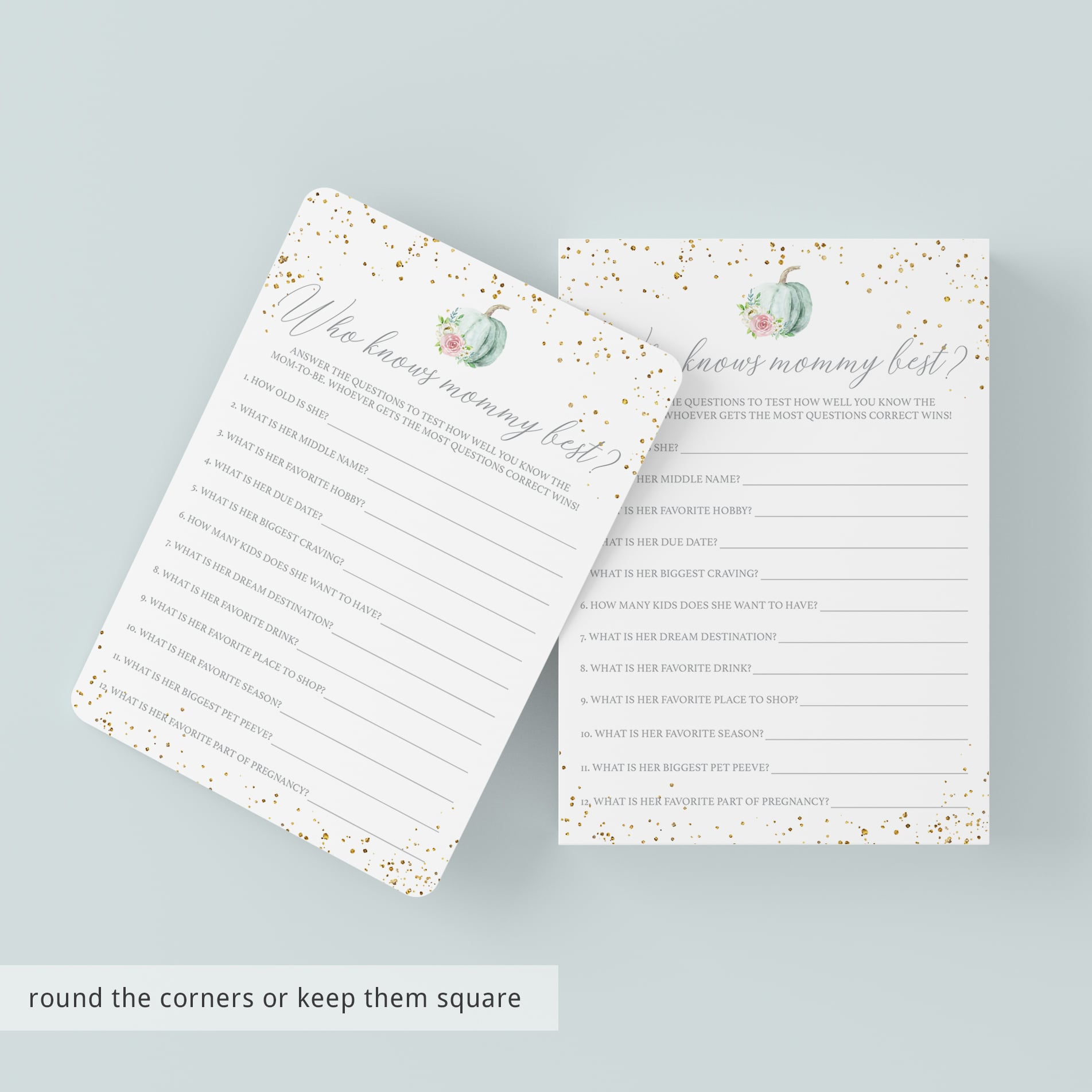 Are you hosting a pumpkin theme baby shower? Test your guests how good they know the new mommy and play "Who knows mommy best" with these gorgeous watercolor pumpkin baby shower game cards. This mommy trivia is a great way to bring disparate people together and to put them all in a party mood.