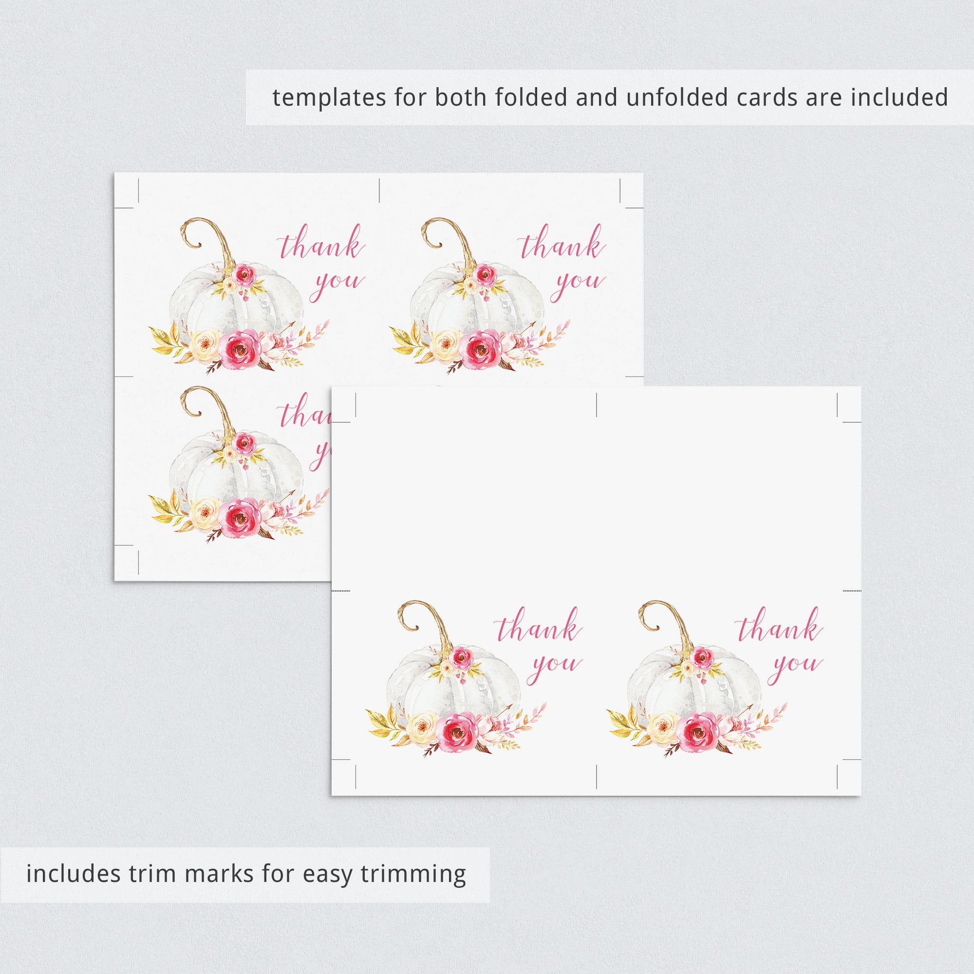 For the thank you cards, a template for both a folded and a flat card is included.