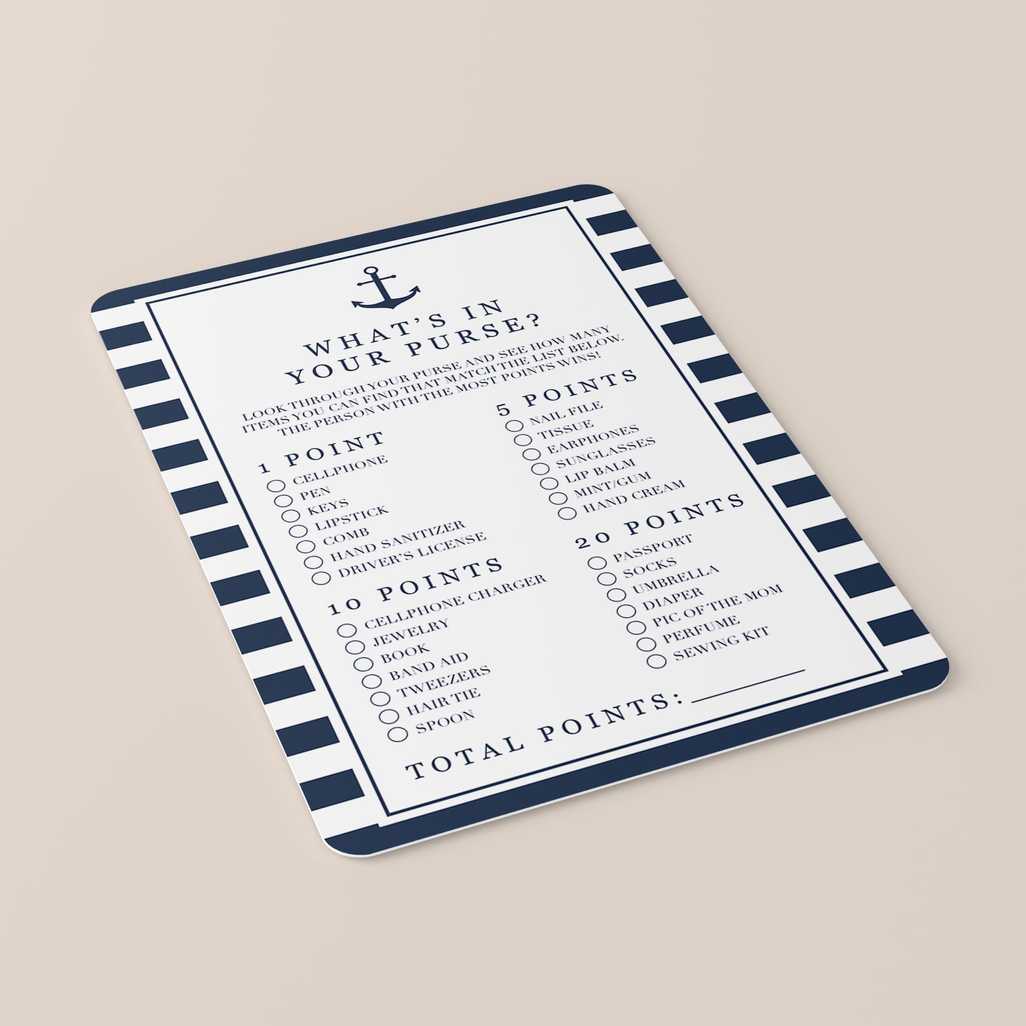 These navy and white baby shower game cards list common and not-so-common items found in handbags, including lipstick, keys, tweezers, and socks. This purse raid game is perfect for any boy baby shower.