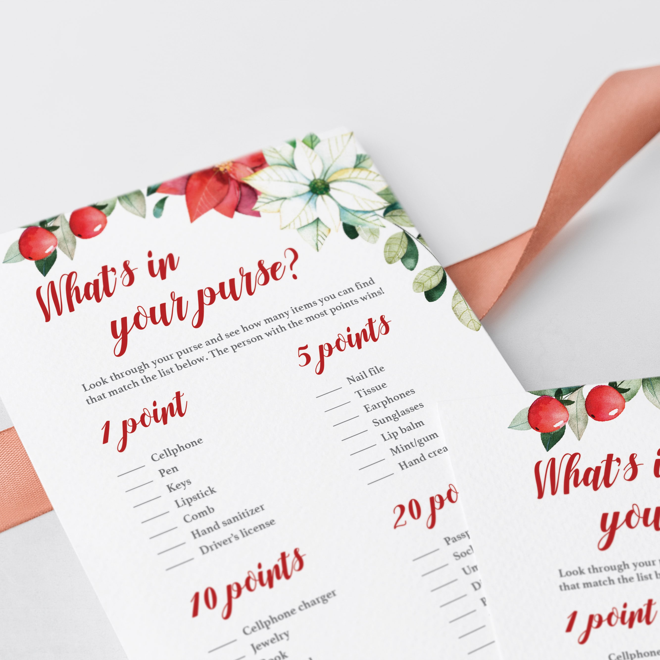 The baby shower game card with red poinsettia's list common and not-so-common items found in handbags, including lipstick, keys, tweezers, and socks.