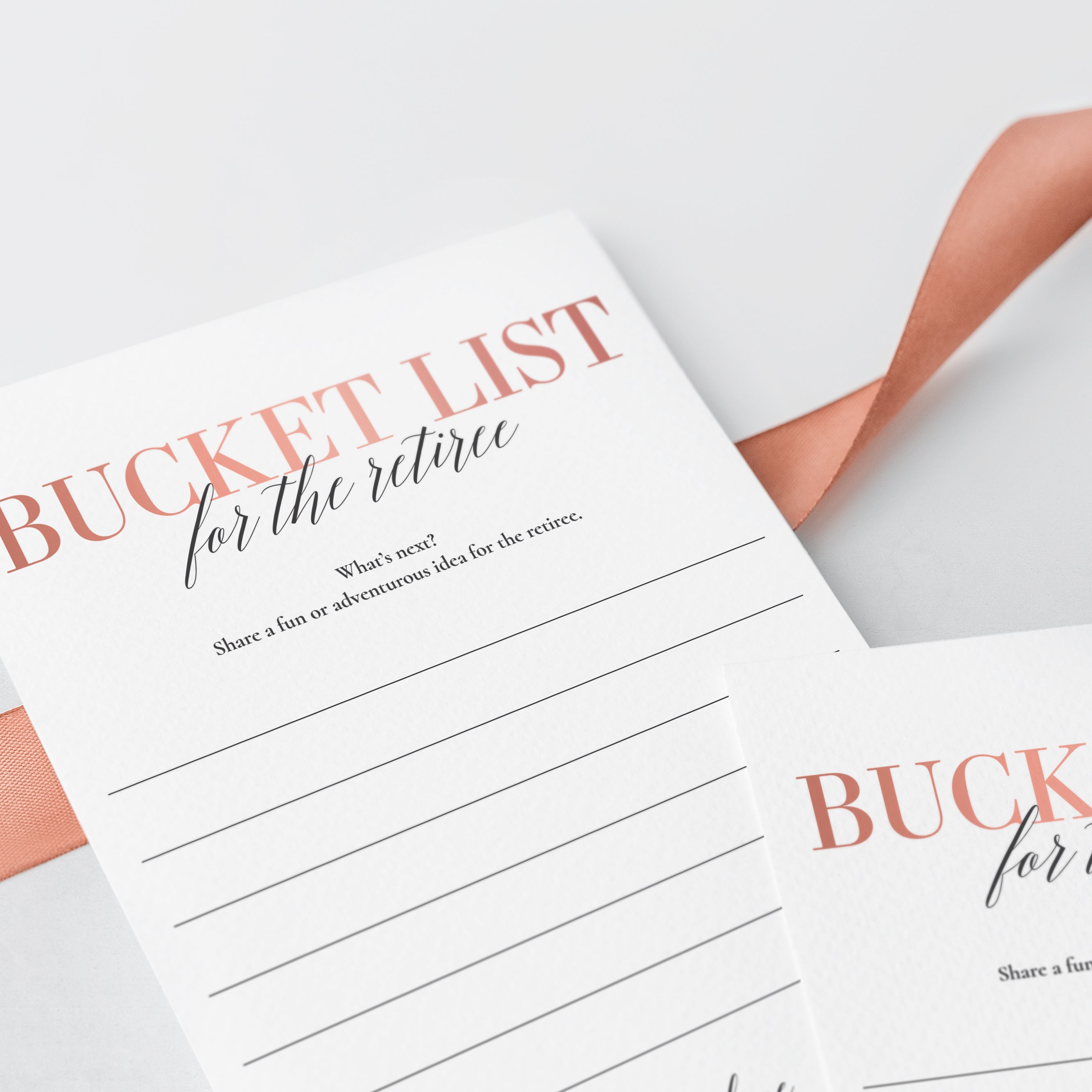 All you need is one of these blush Retirement Bucket List cards for each of your guests, a pen and a bucket. Ask your guests to write down one thing the retiree should do. Collect the bucket list cards and place them in a bucket to give to the retiree by the end of the party.