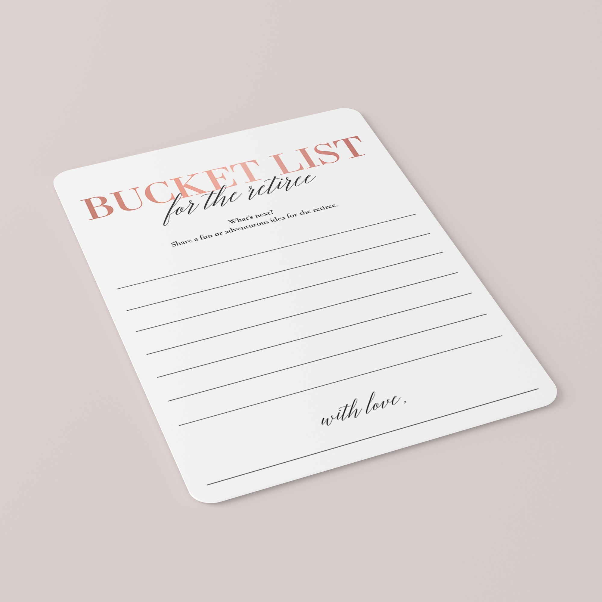 Let the retiree make the most of her retirement with these modern blush retirement bucket list cards. It is the perfect keepsake for the retiree and one of the easier retirement party games to pull off.