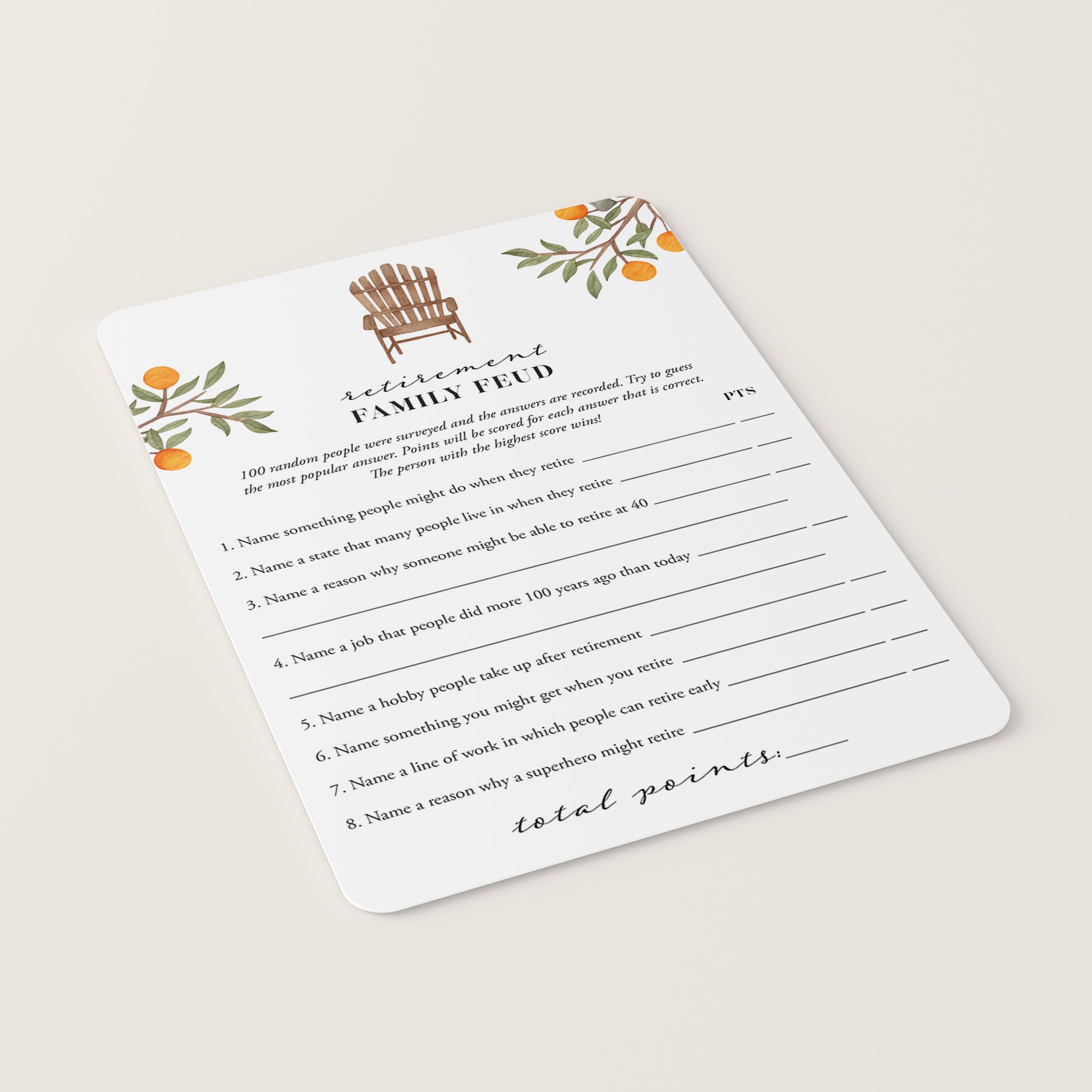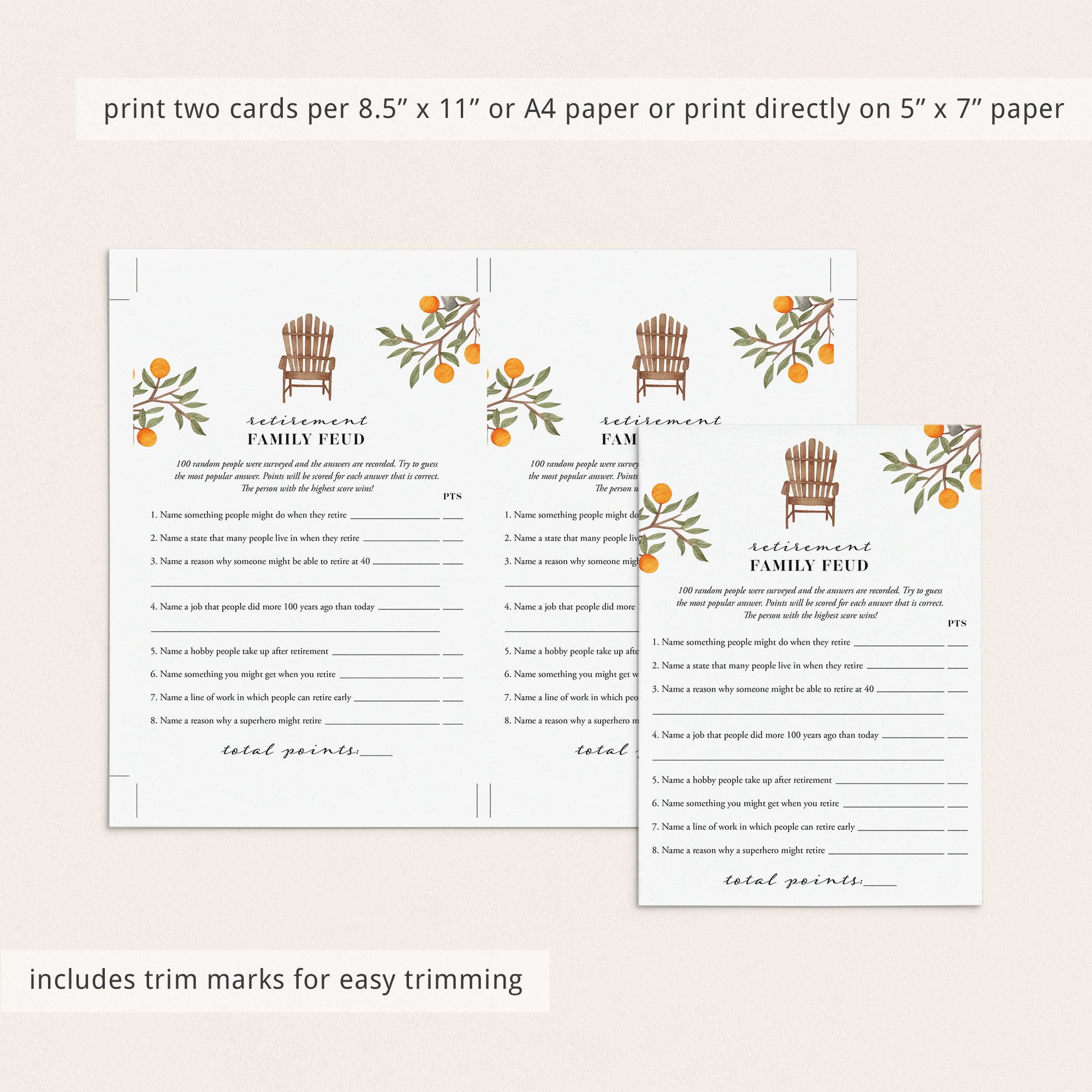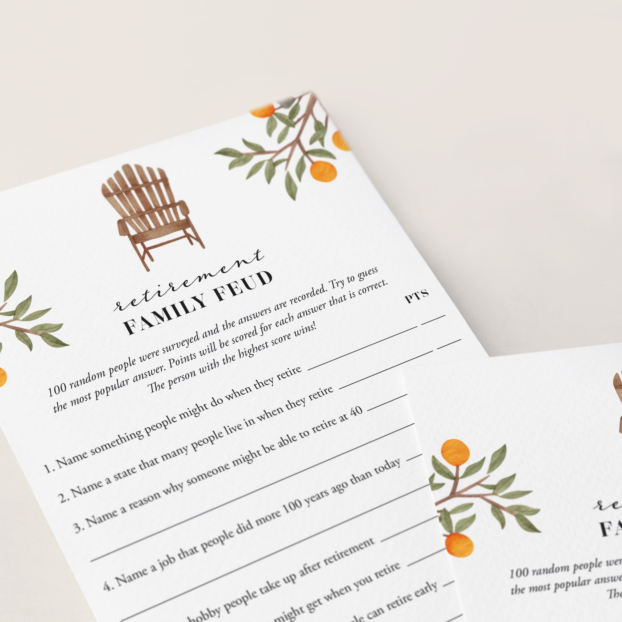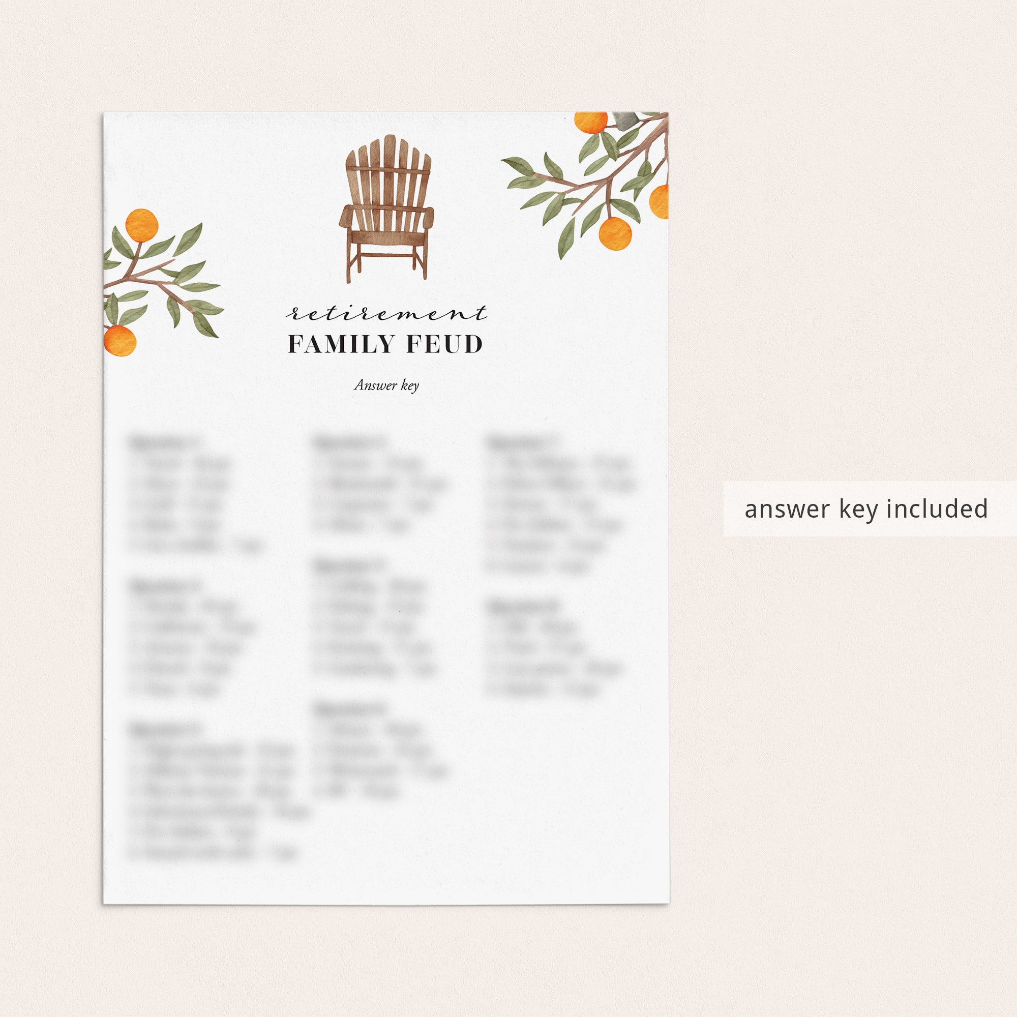 Add some fun to your retirement party with this beautiful watercolor Retirement Family Feud game. Family Feud is one of the best game shows ever. Have your co-workers, friends and family compete to guess the most popular answer to Retirement Feud questions. An answer key with Retirement Family Feud answers and points is included. The person or team with the highest score wins!
