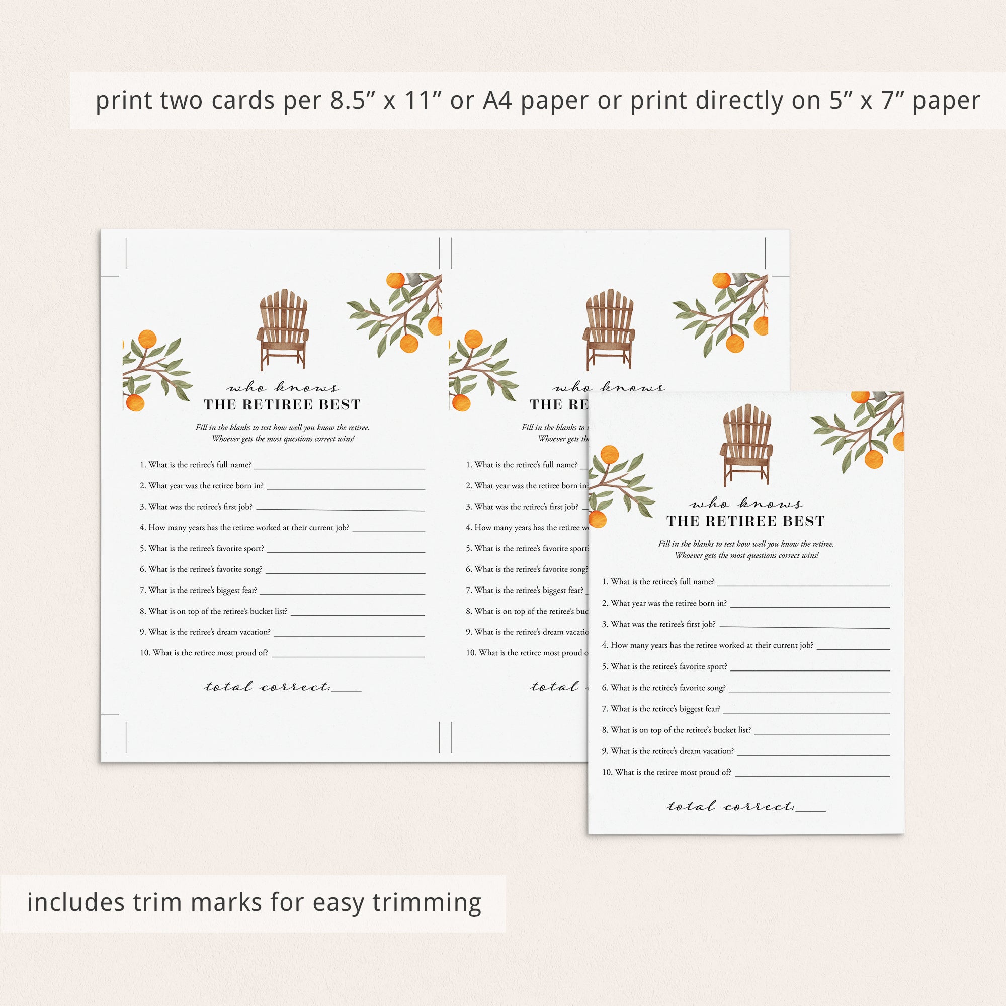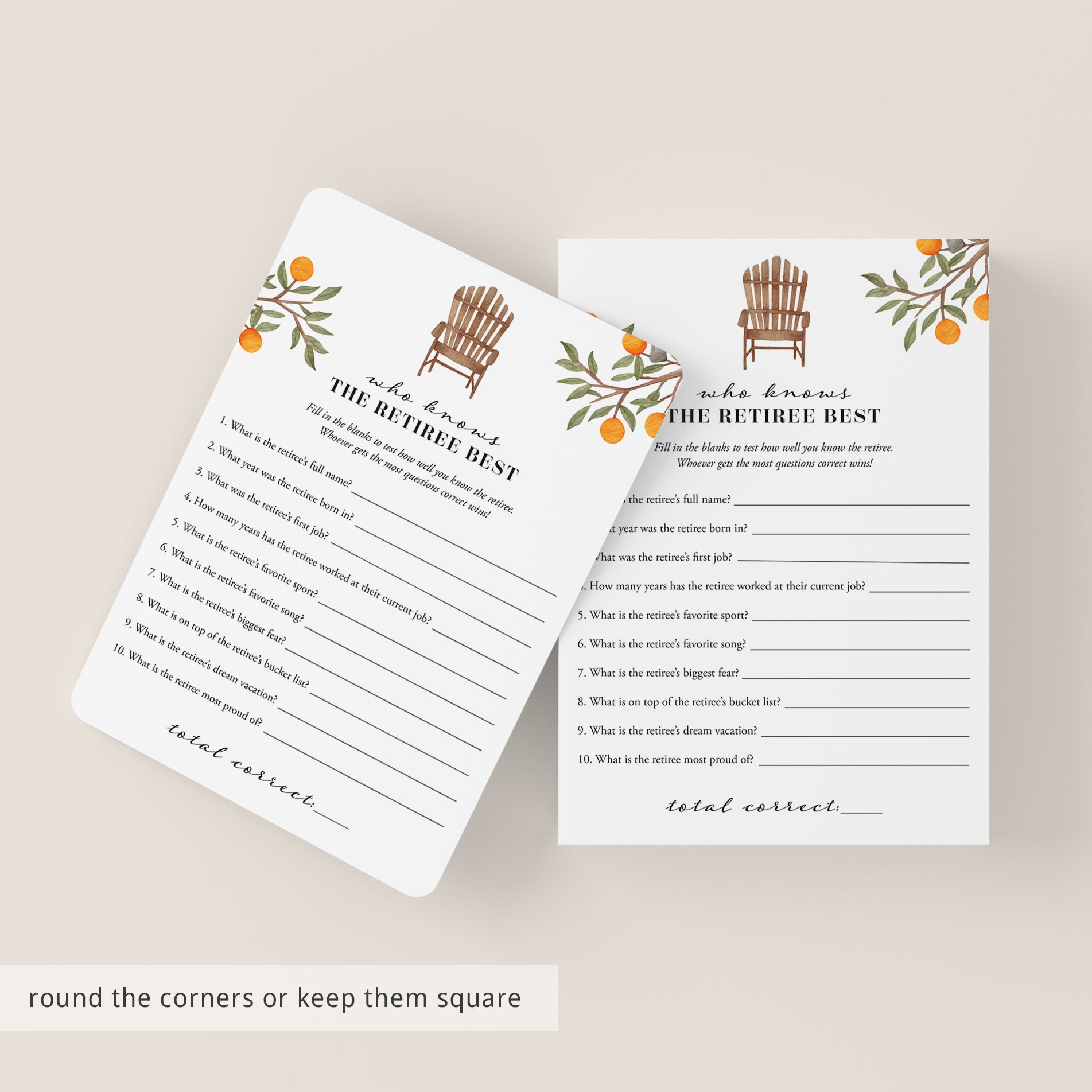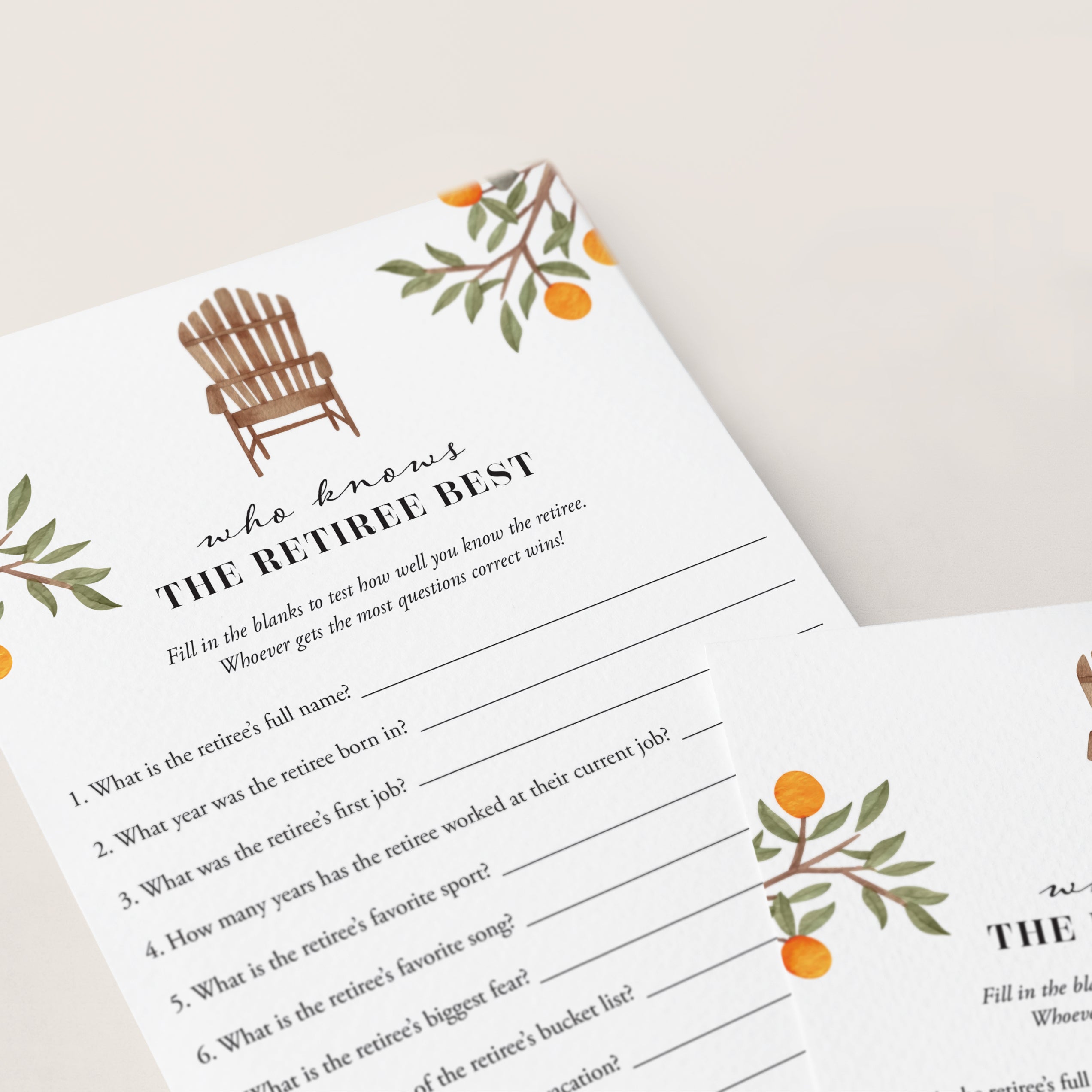 Test your family, friends and co-workers how well they know the retiree and play 'Who knows the retiree best’ with this beautiful watercolor retirement party quiz. This retirement quiz is a great way to bring disparate people together and to put them all in a party mood. It's the perfect addition to a retirement party.