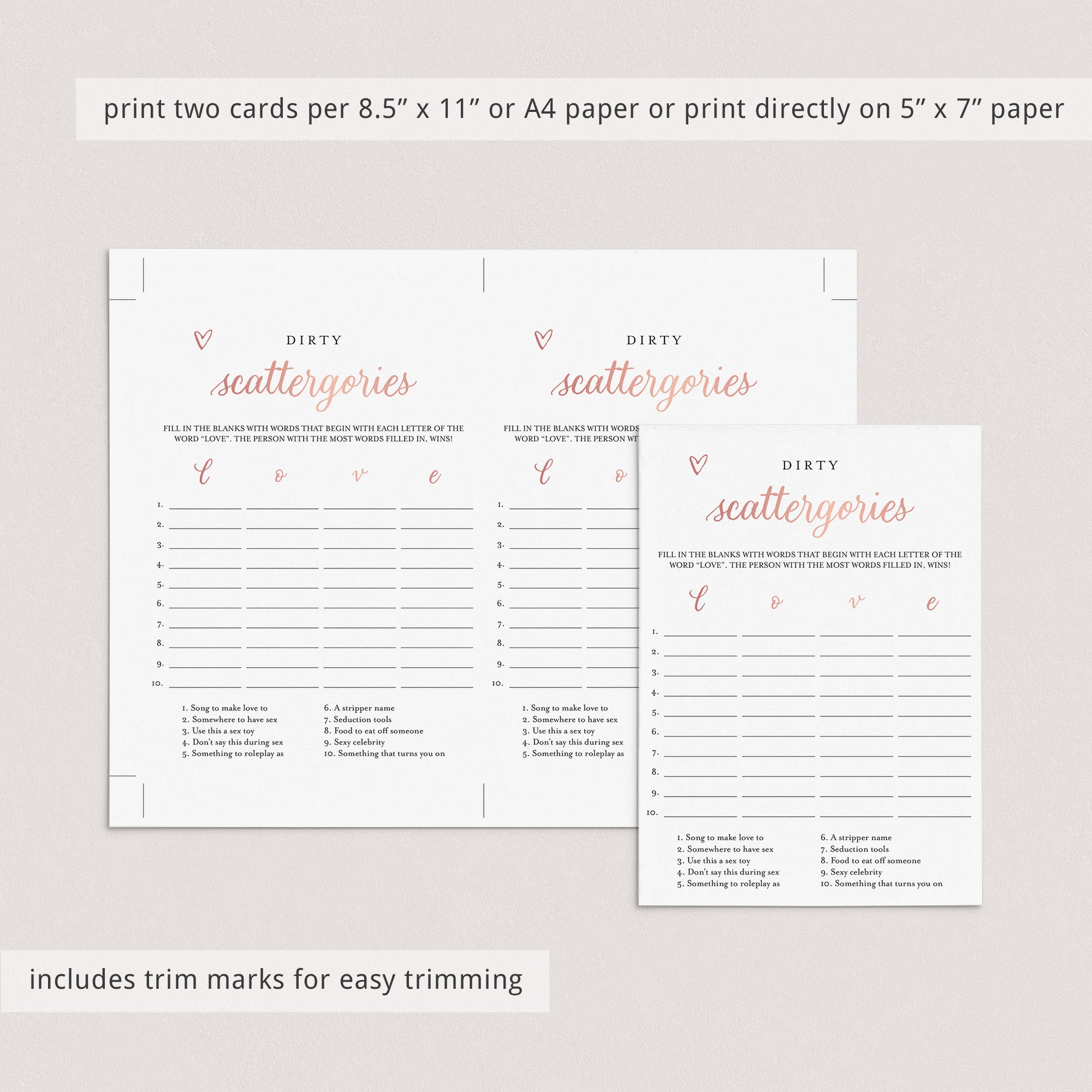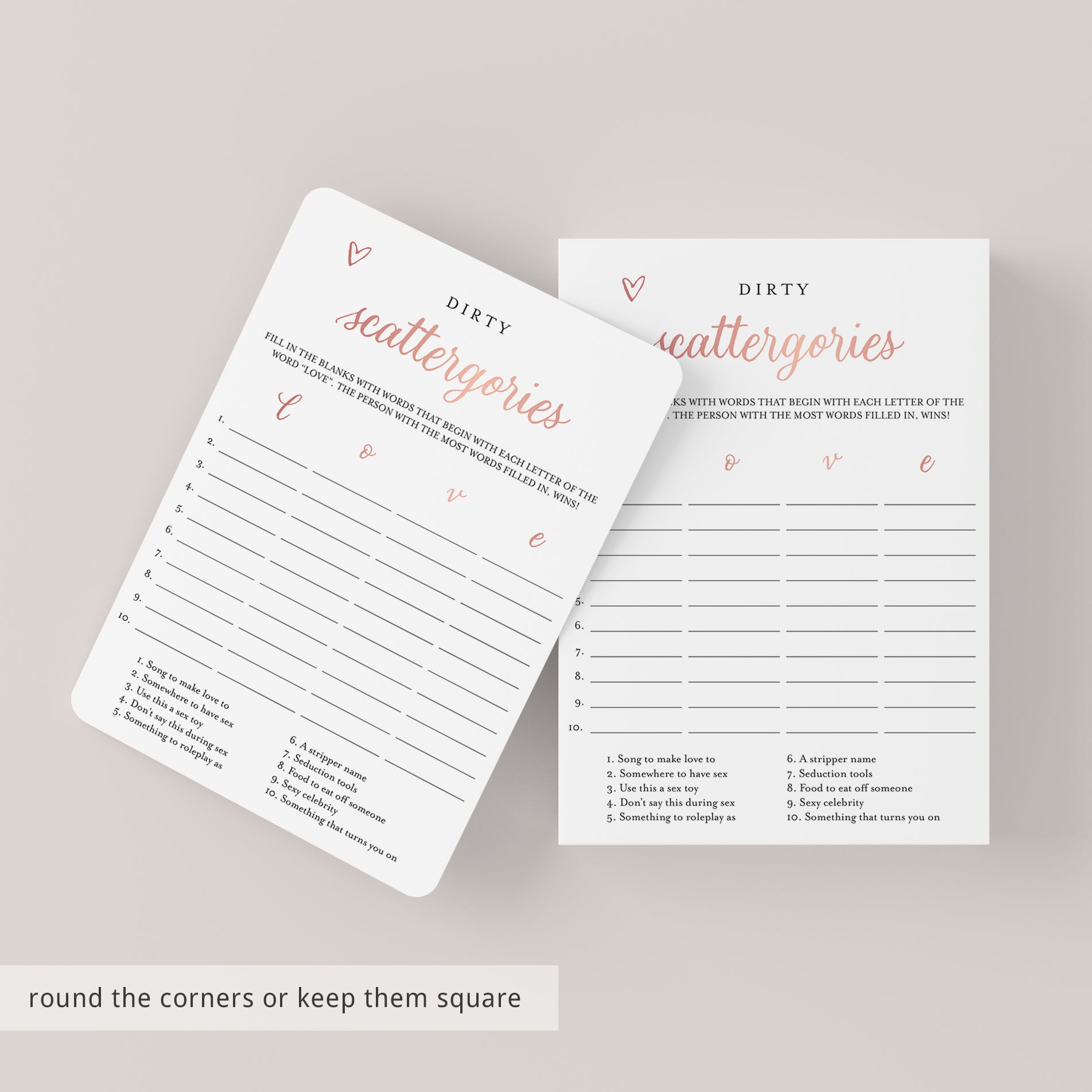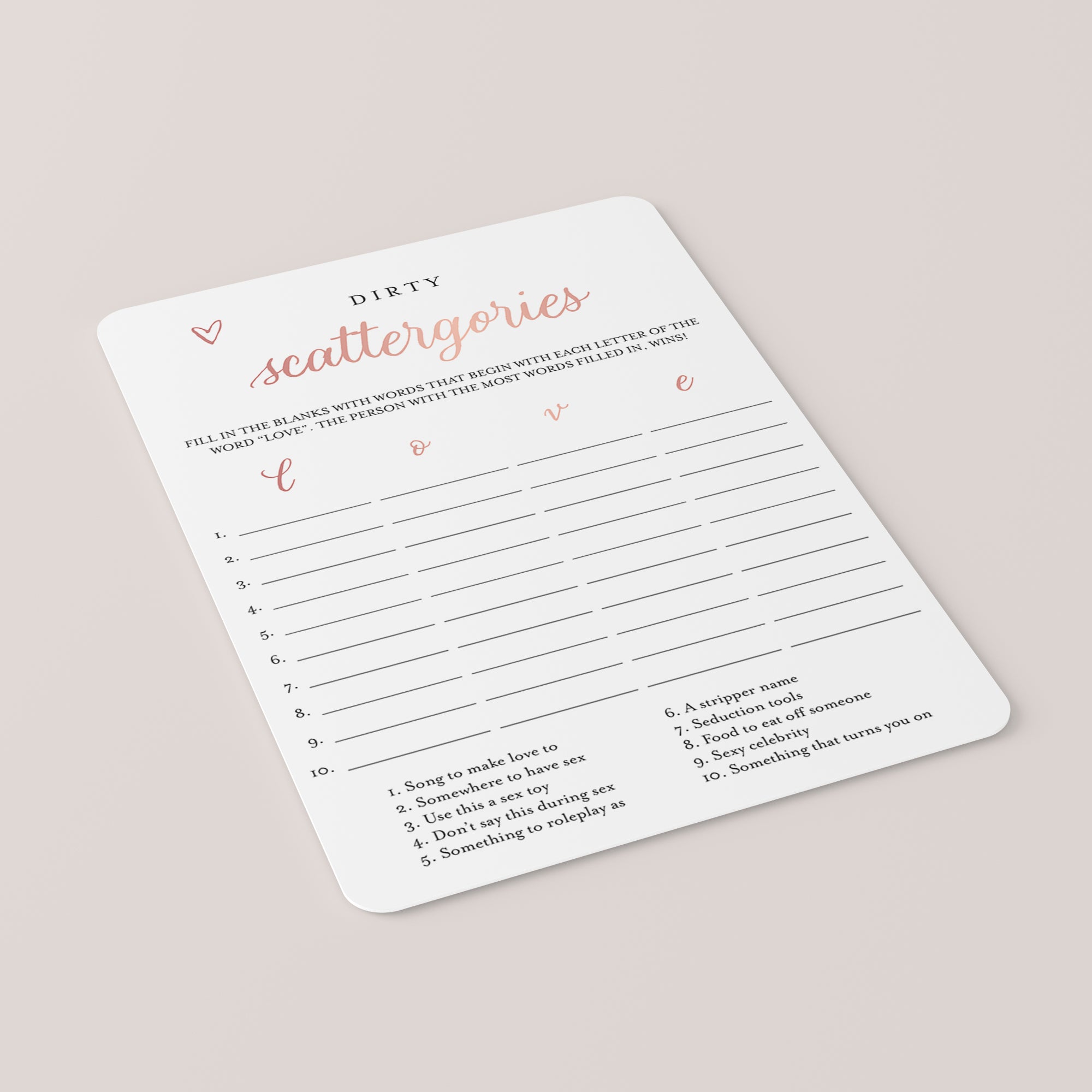 The game is very easy to play. Simply hand out this glamorous rose gold Dirty Scattergories game to your guests. They will have to come up with as many words related to the naughty categories at the bottom of the sheet. The difficulty is that the words must begin with the letters in the word "LOVE". The person that gets the most answers filled in within the set time, wins!