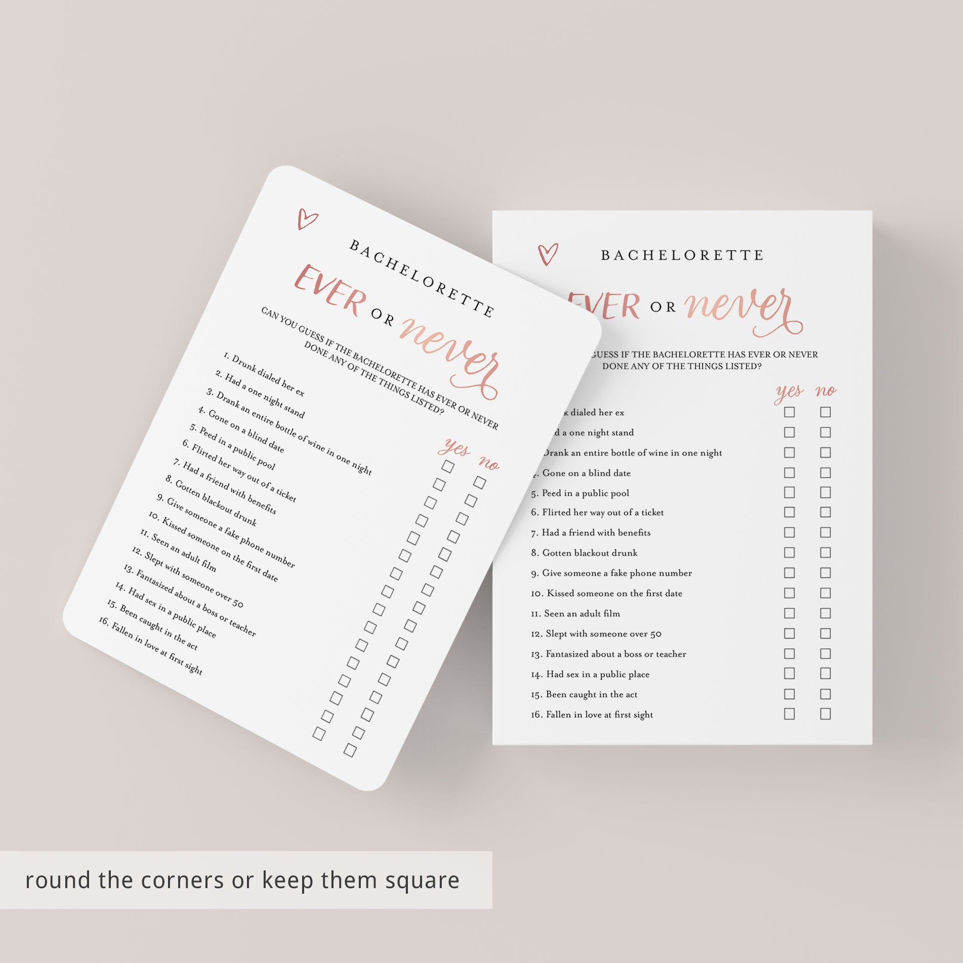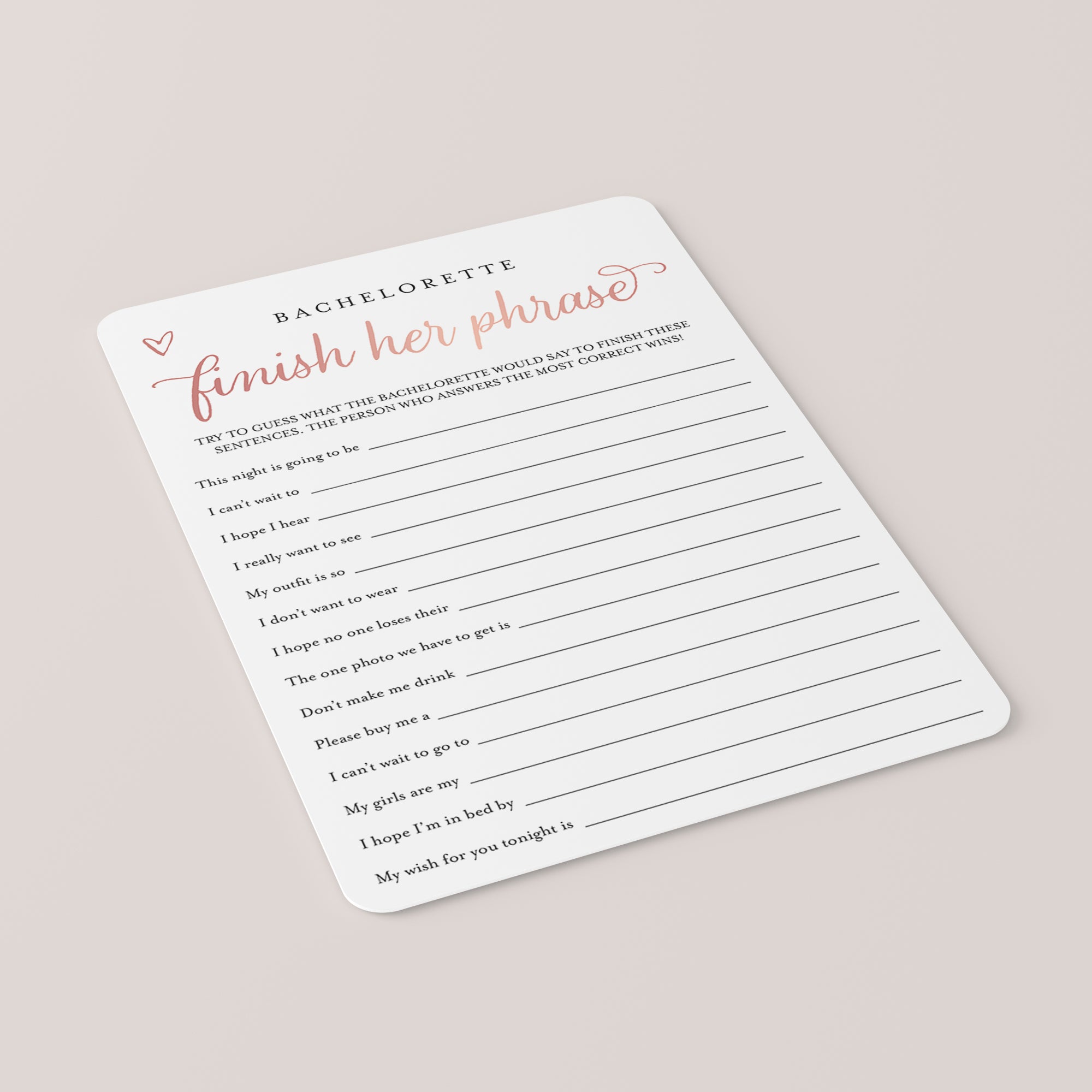 Kick off the fun at your hen party with this simple, yet glamorous, rose gold hen party games bundle 4 popular games. The rose gold games with elegant script are the perfect addition to your hen night or bachelorette party.