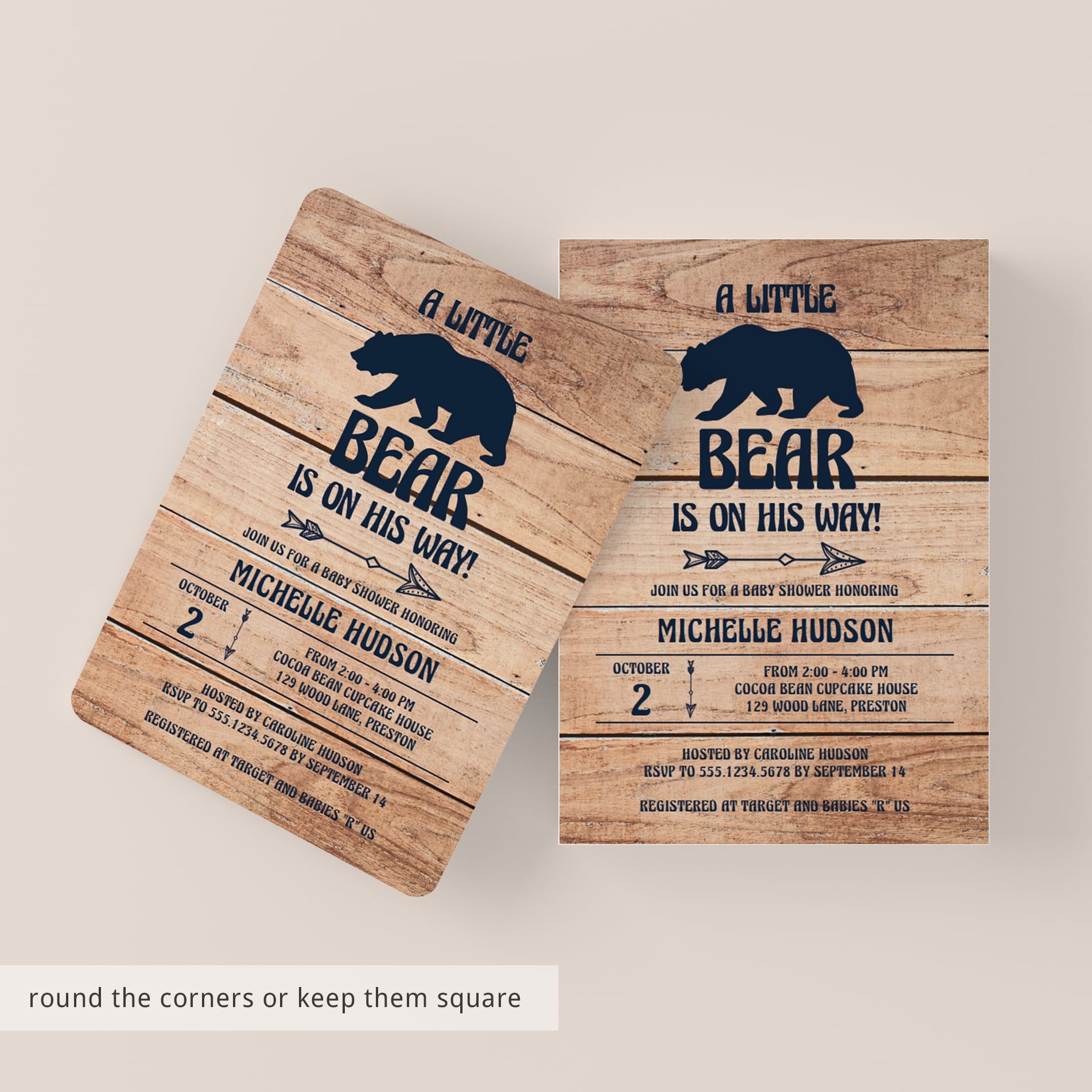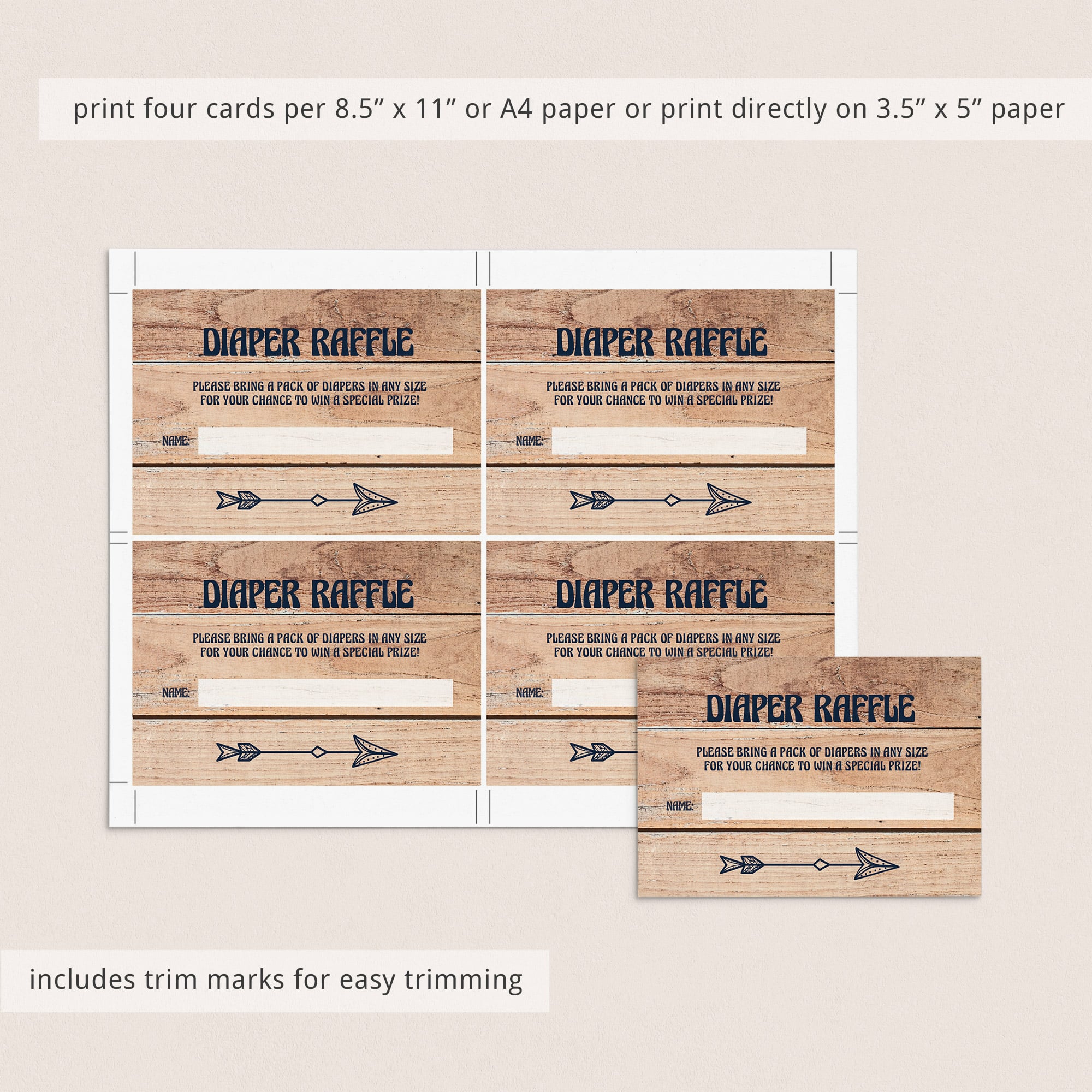 The set includes the Baby Shower Invitation, a Diaper Raffle ticket and a Book Request card. With a rustic wood background and sweet arrows, this baby shower invitation set is perfect to celebrate the parents-to-be and their new adventure!