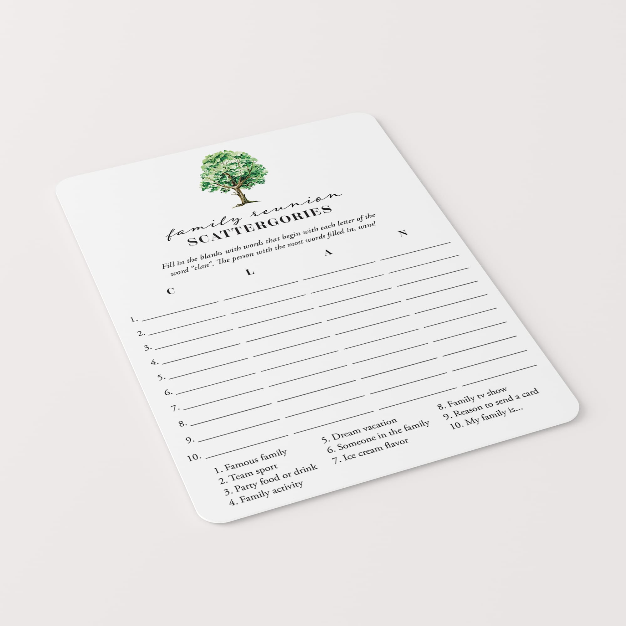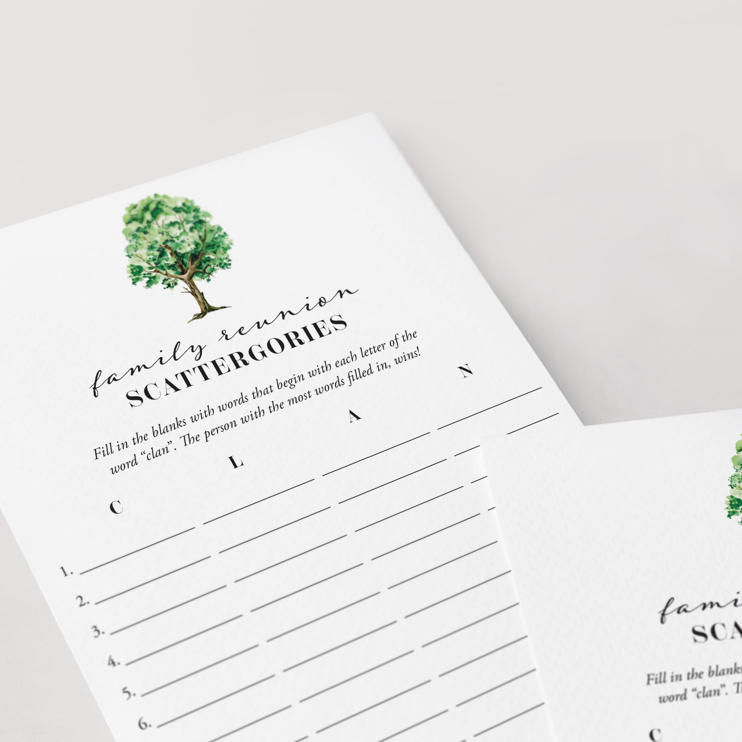 How many words can you fill in with the letters "C", "L", "A" and "N"? Play Scattergories at your next family gathering with these minimalist game cards with watercolor family tree. It's a great game for all ages and the classic design will fit any family reunion theme.