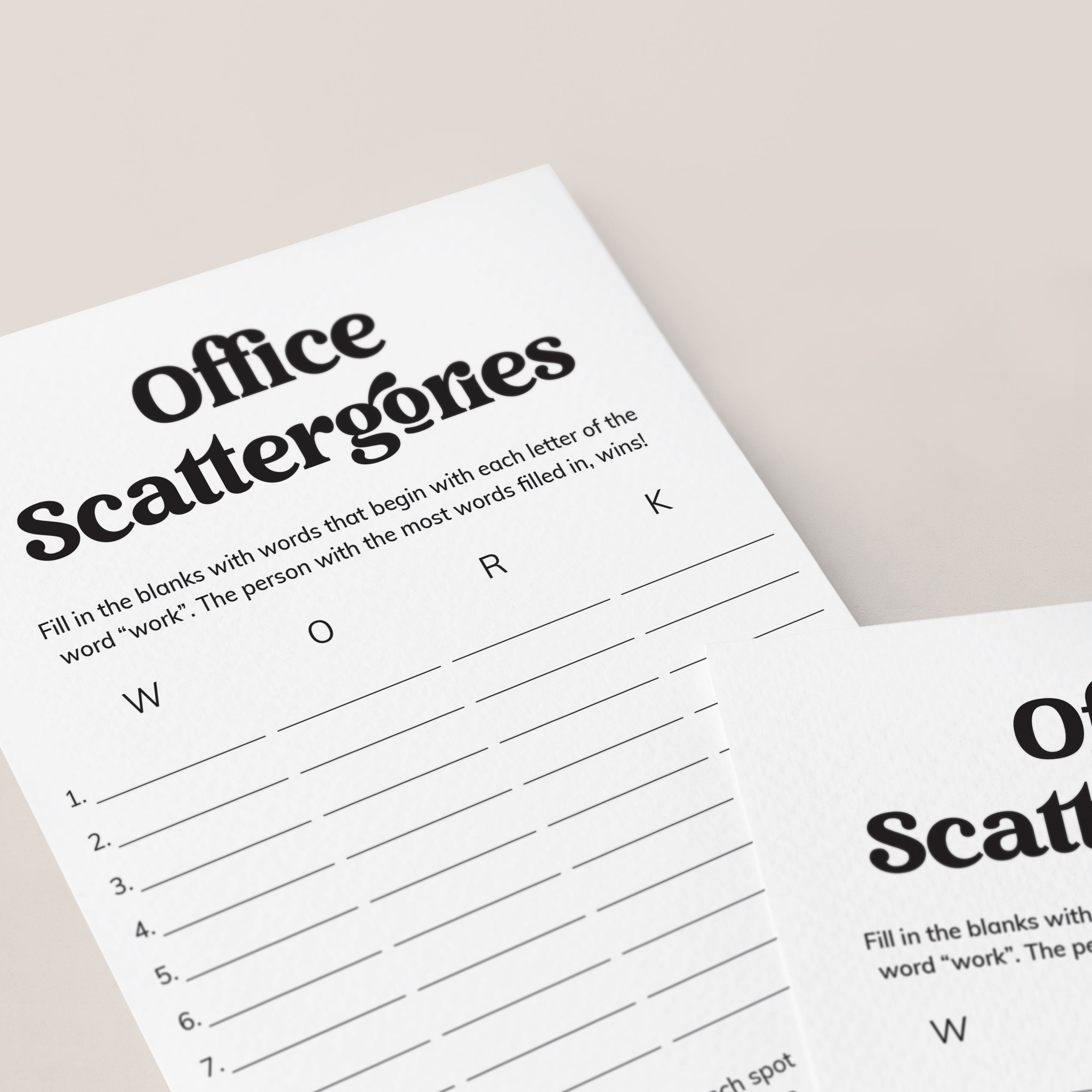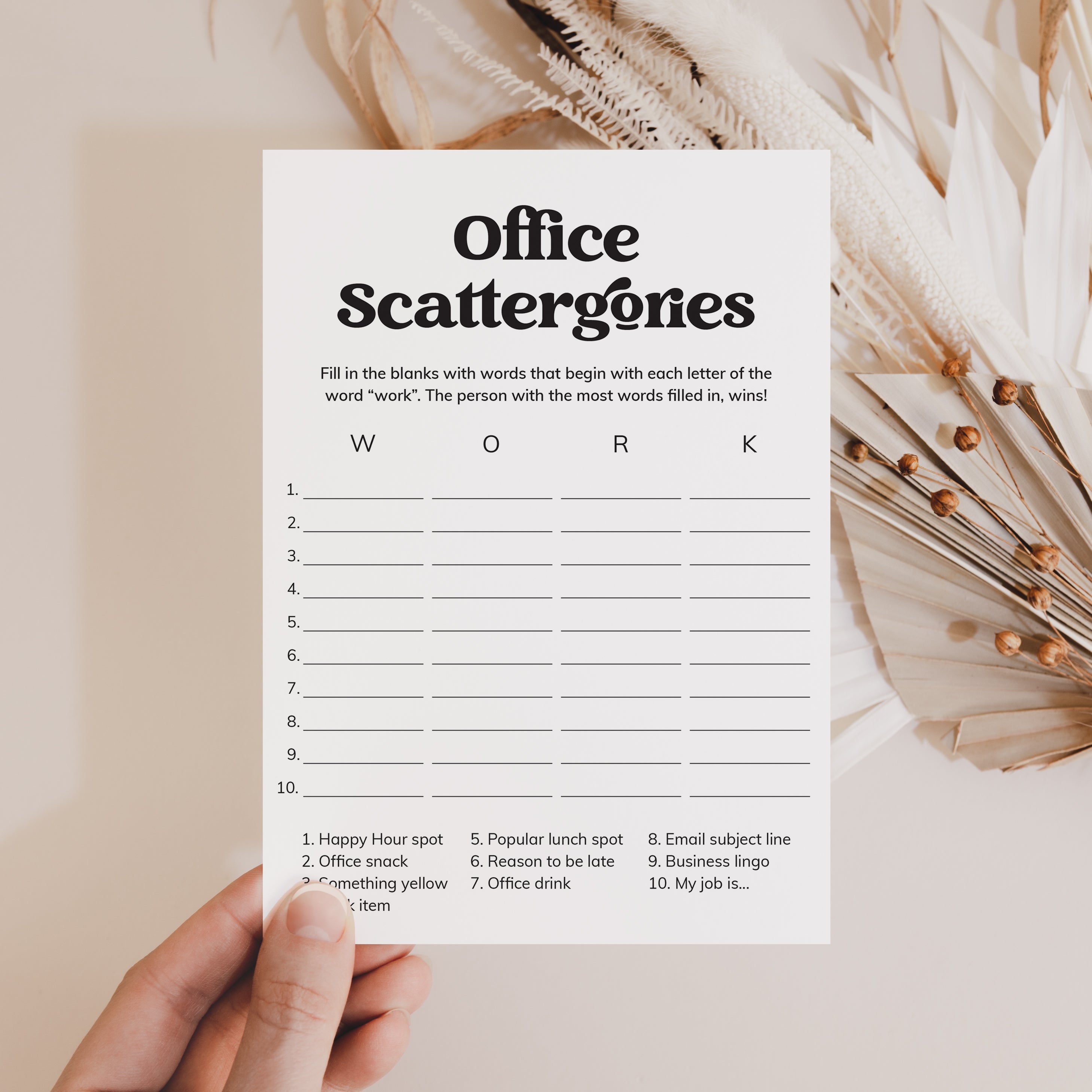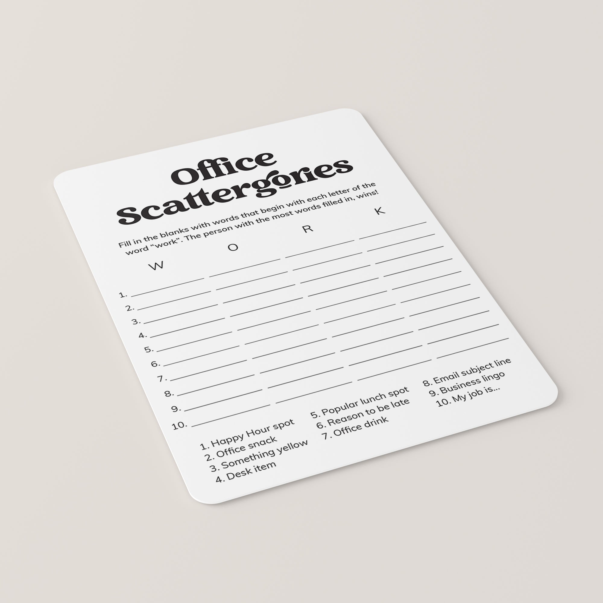How to play the scattergories game? Simply hand out a game sheet and a pen to your coworkers. They will have to come up with as many words related to the office categories at the bottom of the sheet. The difficulty is that the words must begin with the letters in the word "WORK". The person that gets the most words filled in within the set time, wins!