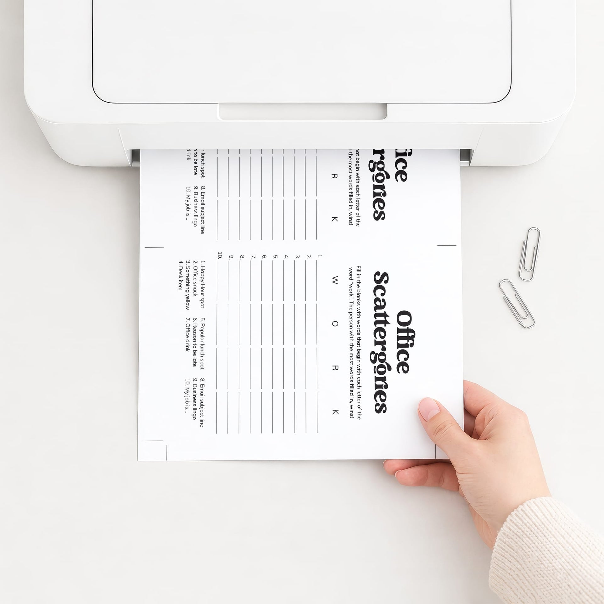 How to play the scattergories game? Simply hand out a game sheet and a pen to your coworkers. They will have to come up with as many words related to the office categories at the bottom of the sheet. The difficulty is that the words must begin with the letters in the word "WORK". The person that gets the most words filled in within the set time, wins!