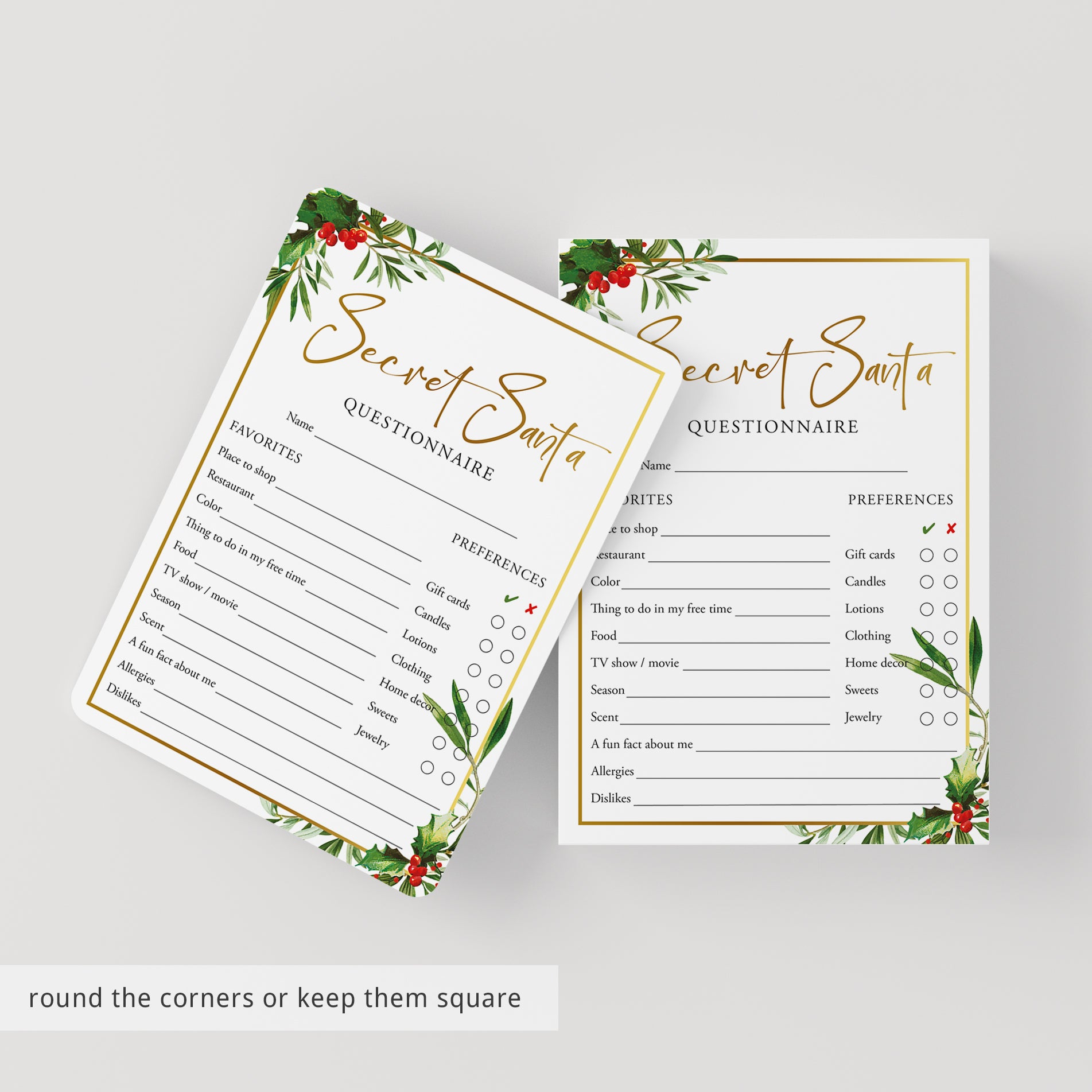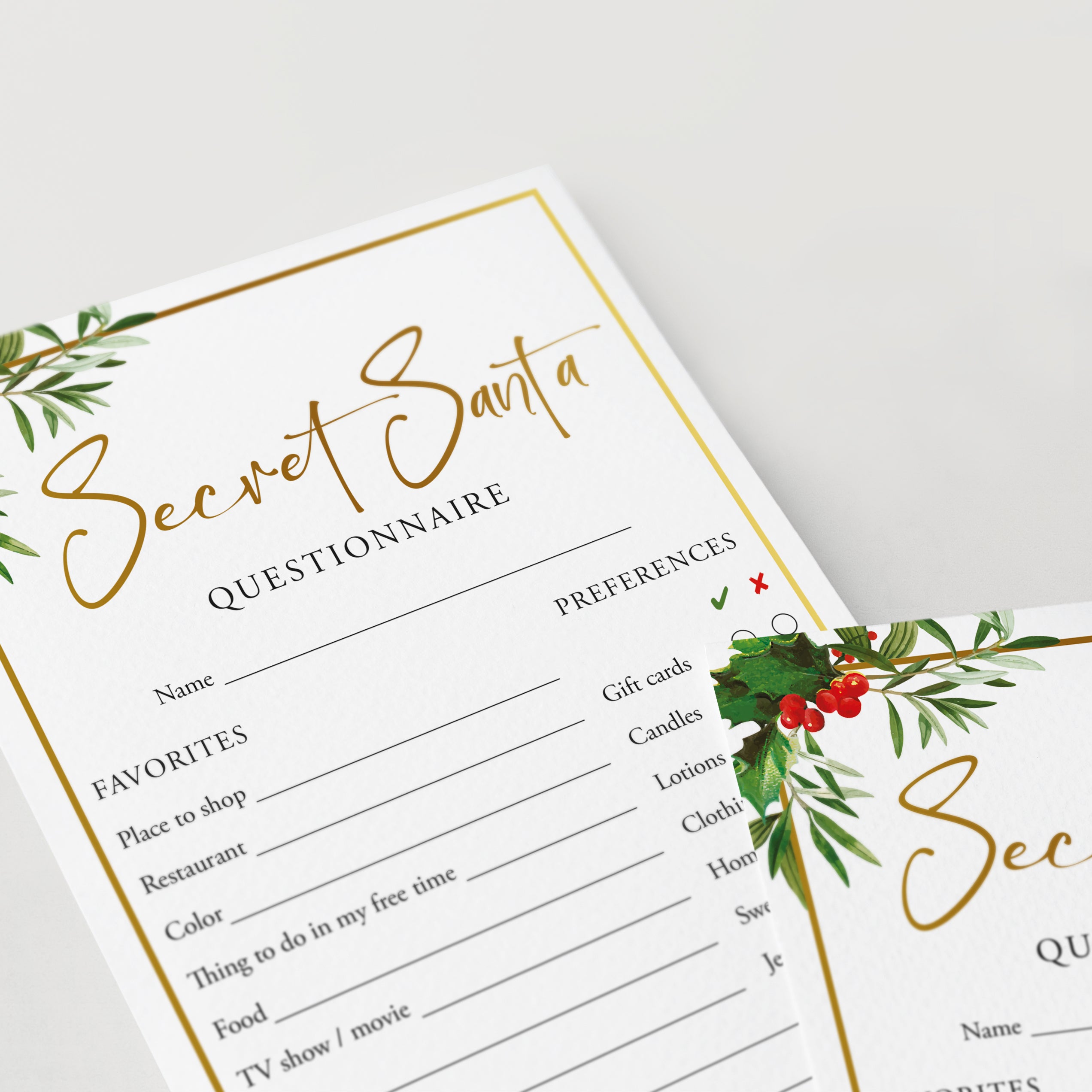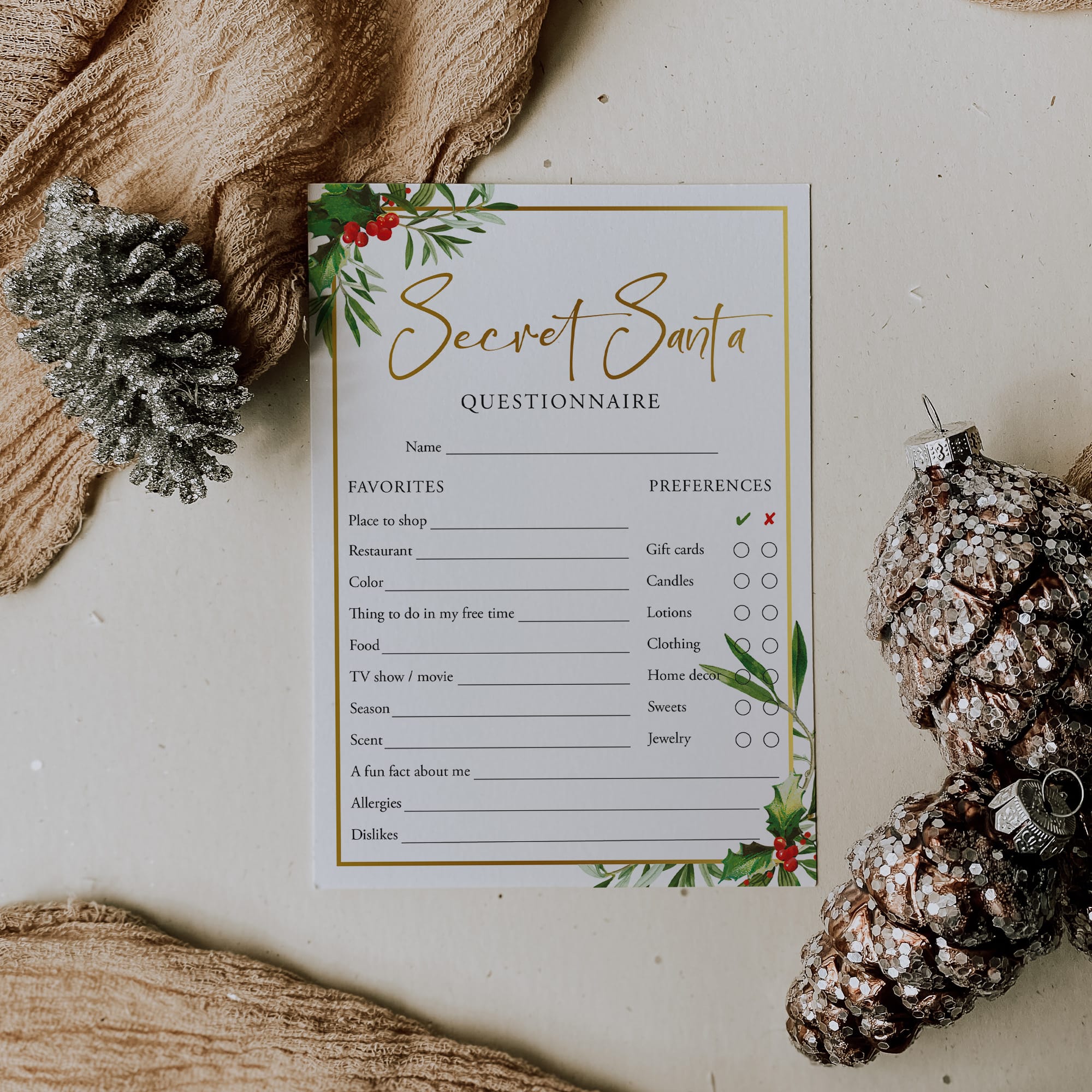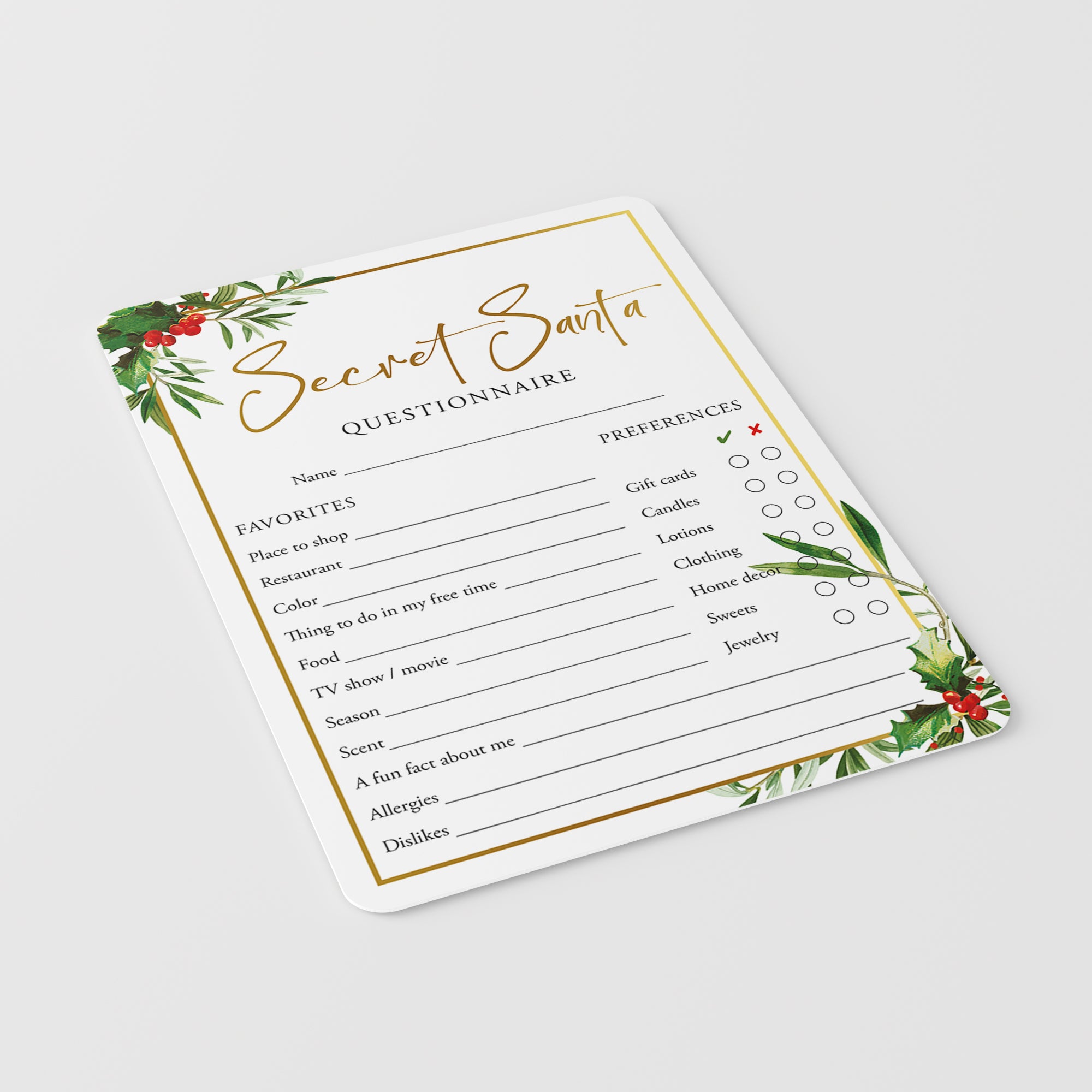 Make this year's planning and buying Christmas gifts easy and organized with this printable Secret Santa Questions Form. Have everyone fill out one of the elegant cards with Christmas berries and greenery and make your holiday gift shopping stress free. These Secret Santa Questions Forms for Adults are perfect to use with coworkers at work or with friends at home.