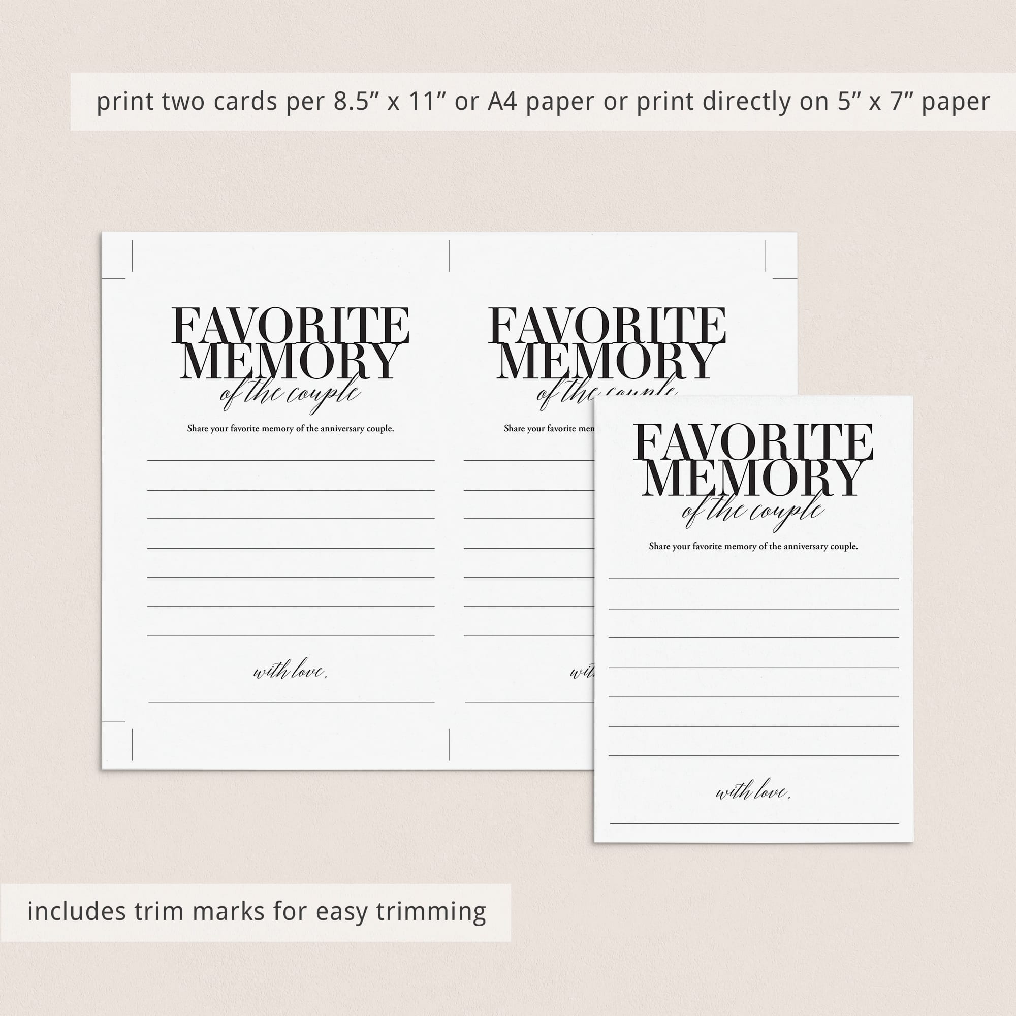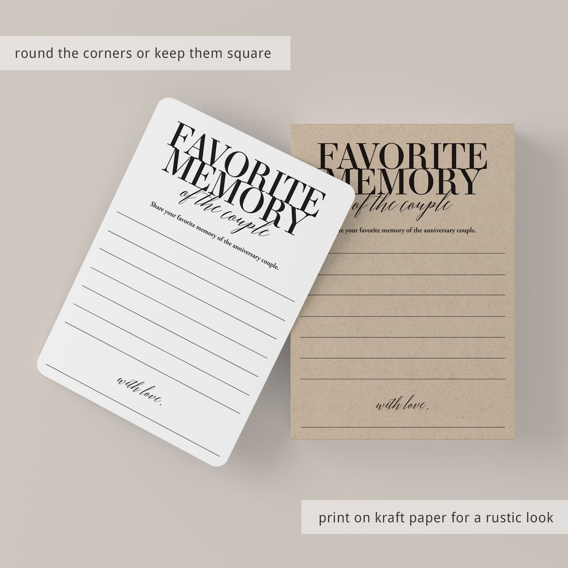 Are you looking for a memorable keepsake for an anniversary party? Have your guests share their Favorite Memory with the anniversary couple with these simple, yet sophisticated, wedding anniversary cards. It's the perfect addition to your anniversary party and sure to be a hit!