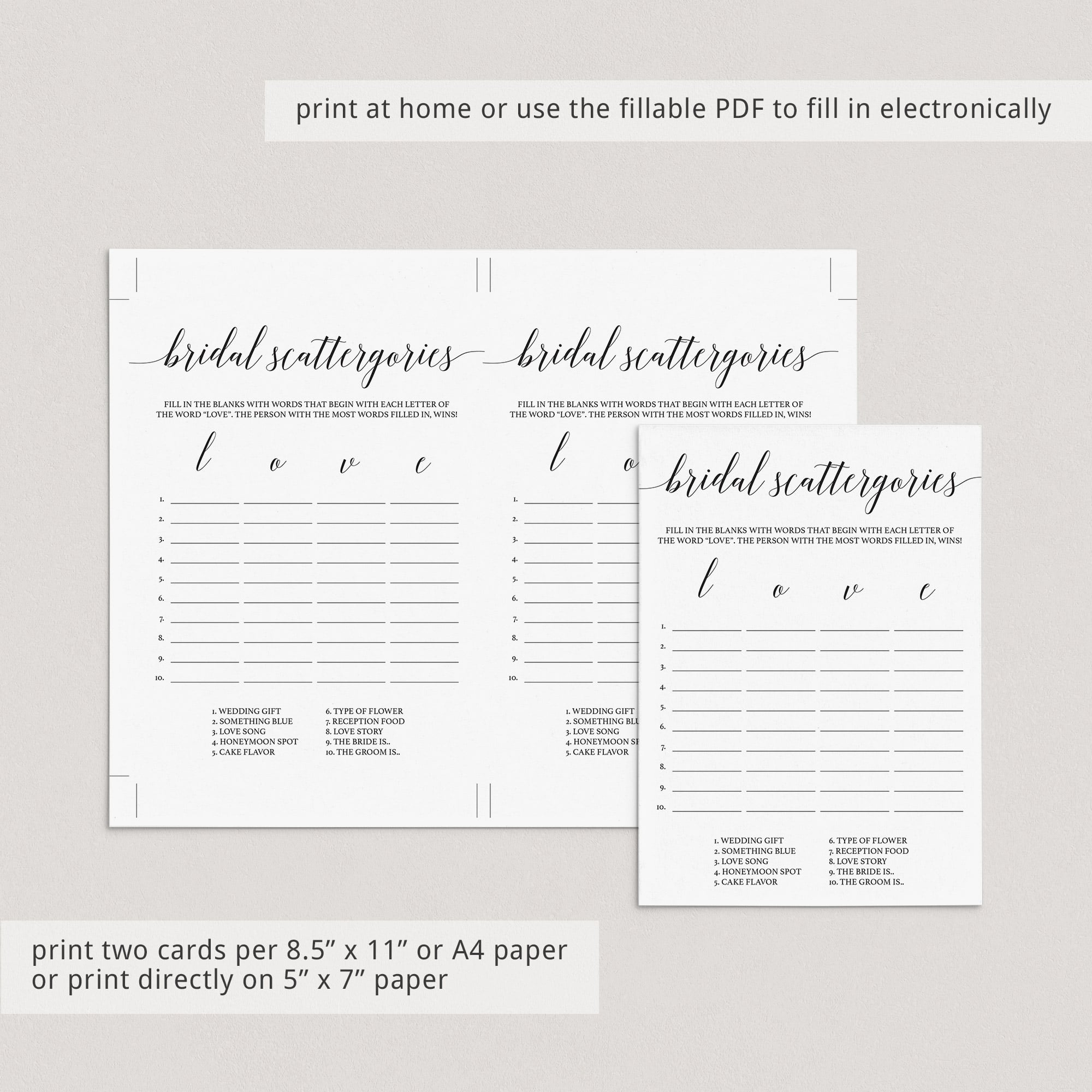 And if you are hosting a virtual bridal shower, you can email the Scattergories game cards to friends and family and have them print the cards at home or fill in the answers electronically in the free version of Adobe Acrobat Reader.