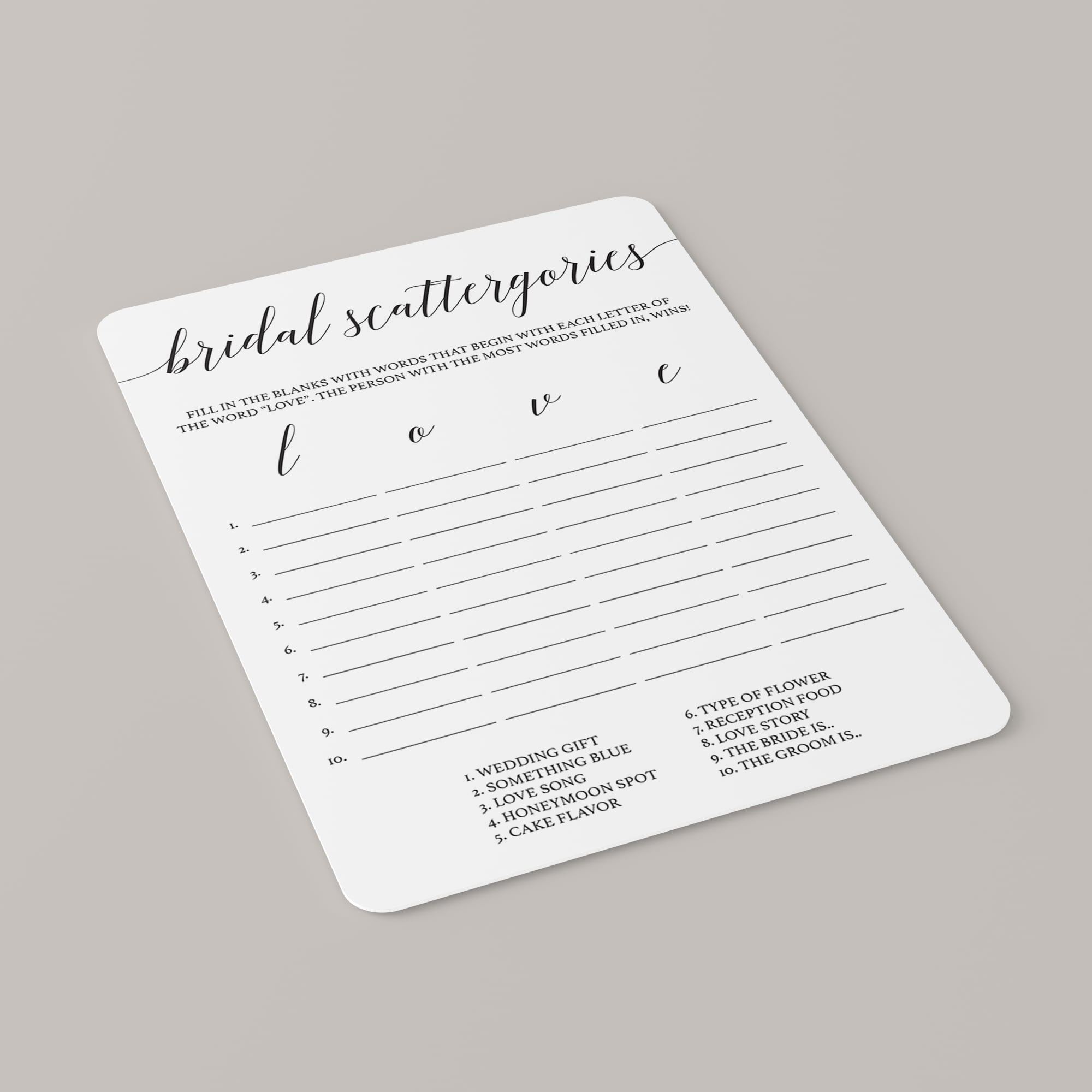 How to play the bridal shower game scattergories? Simply hand out or send a game sheet to your guests. They will have to come up with as many words related to the categories at the bottom of the sheet. The difficulty is that the words must begin with the letters in the word "LOVE". The person that gets the most answers filled in within the set time, wins!