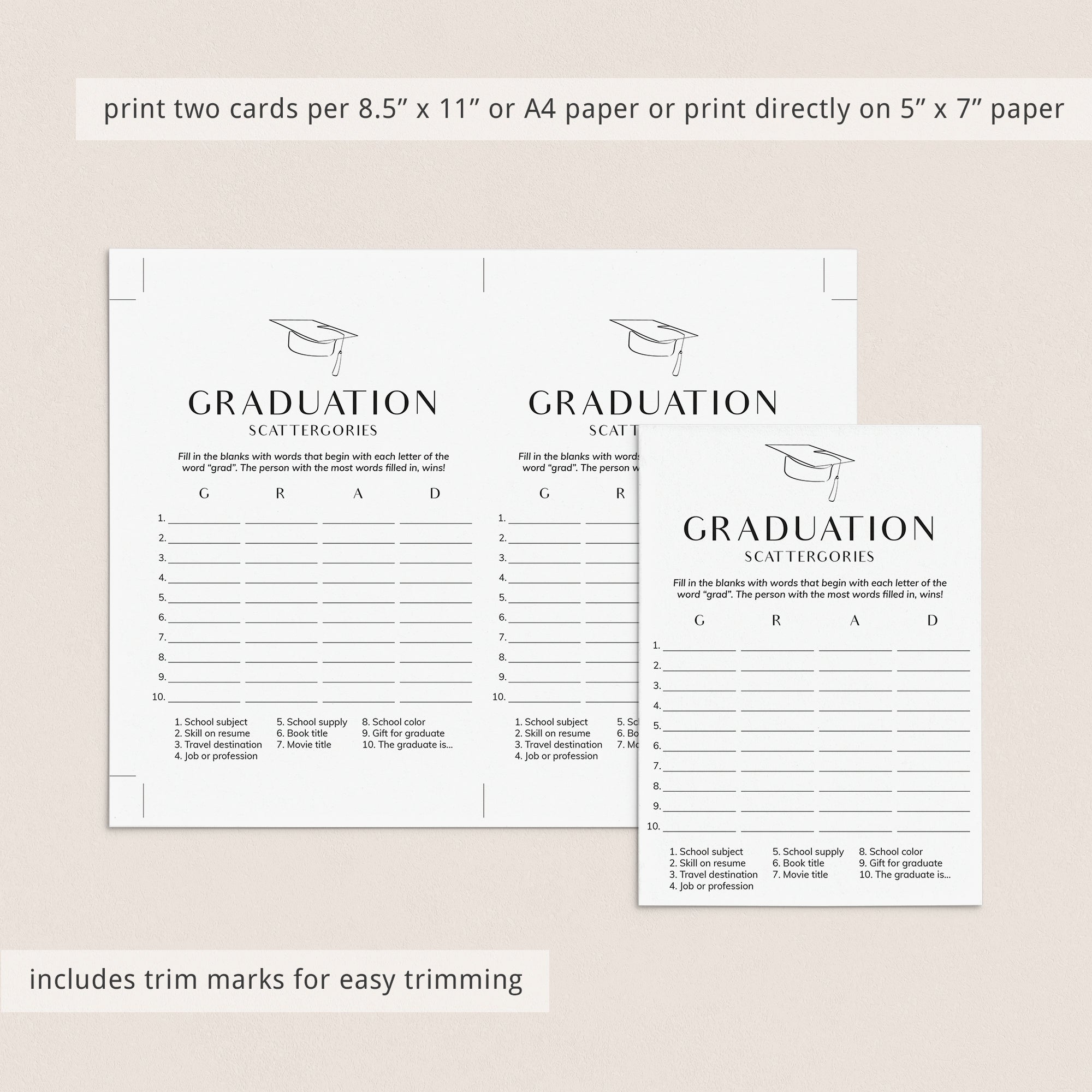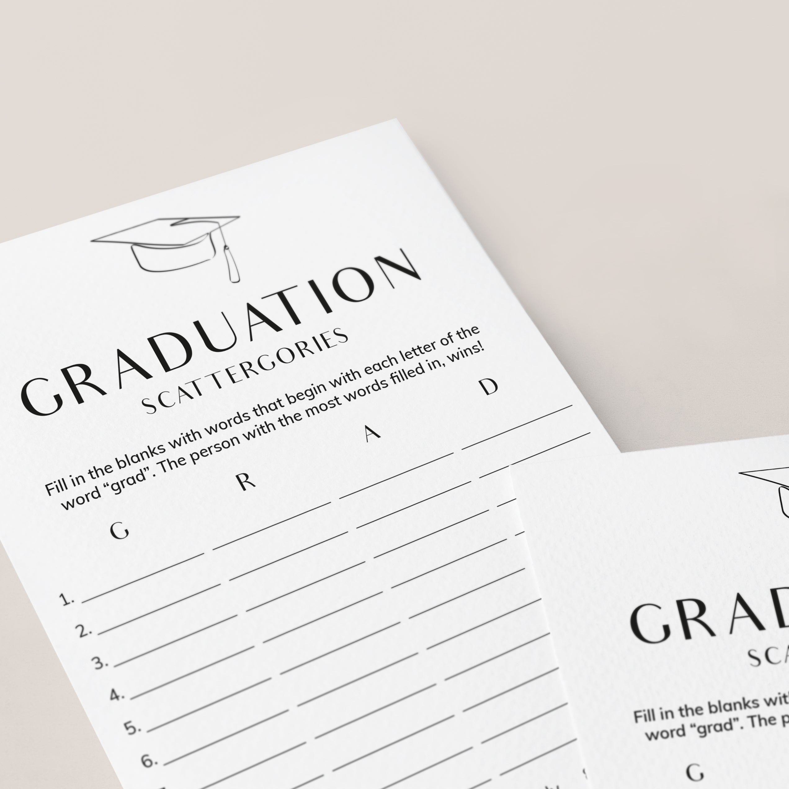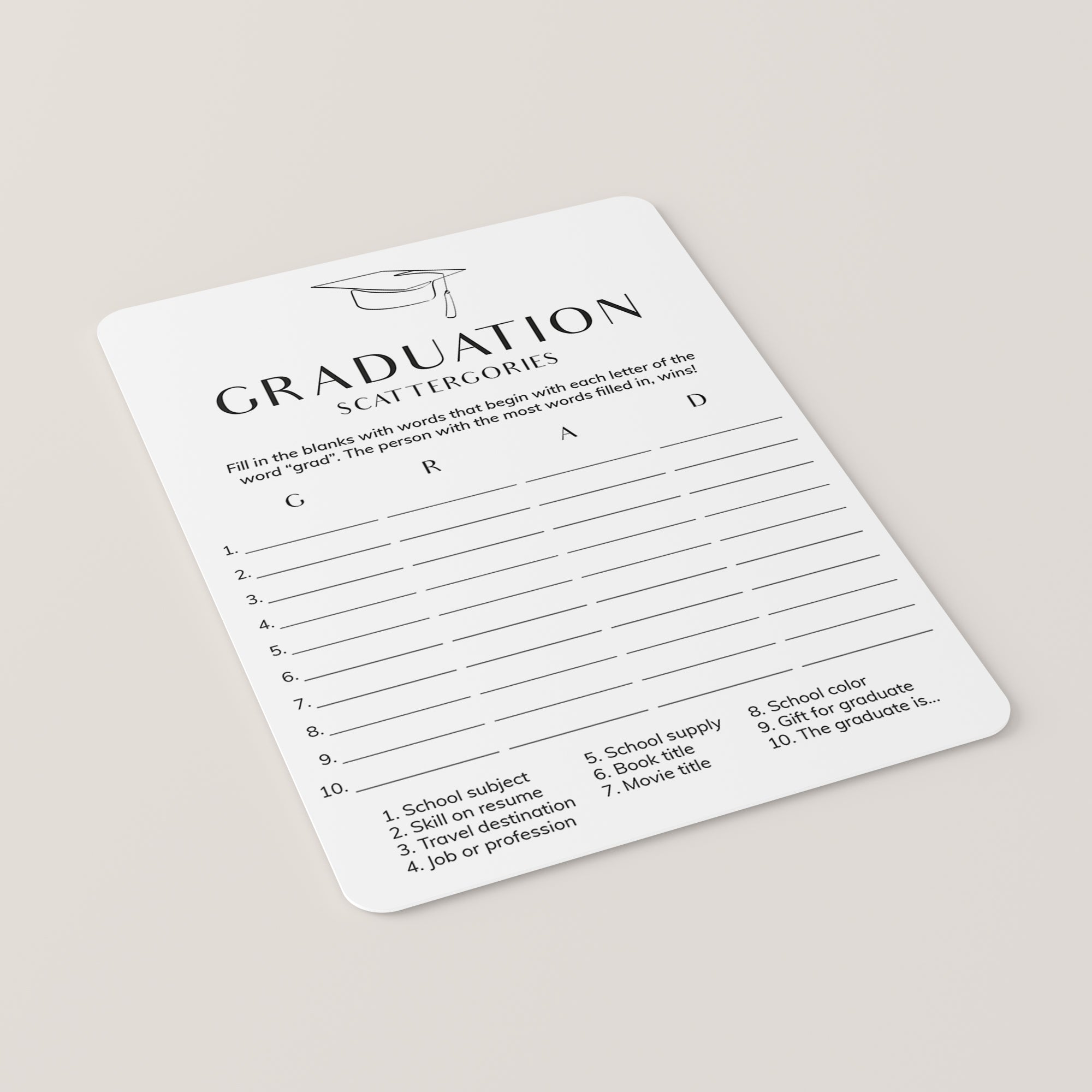 How many words can you fill in with the letters "G", "R", "A" and "D"? Play Scattergories at your Graduation party with this modern graduation game with minimalist grad cap.