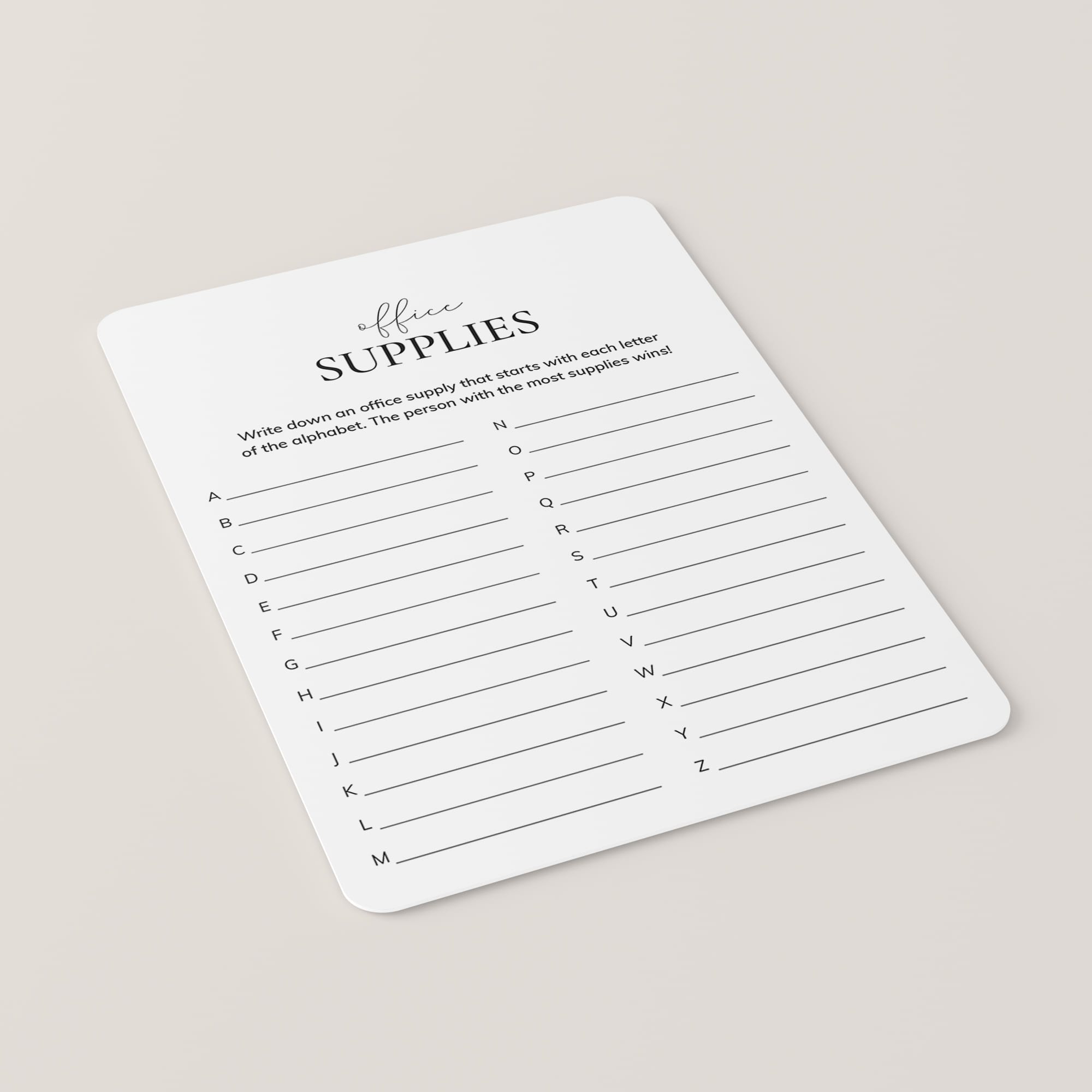 How many Office Supplies do you know? Find out with this simple and fun Office Party A to Z word game. It's the perfect addition to your next Company Party, Happy Hour or Staff Meeting.