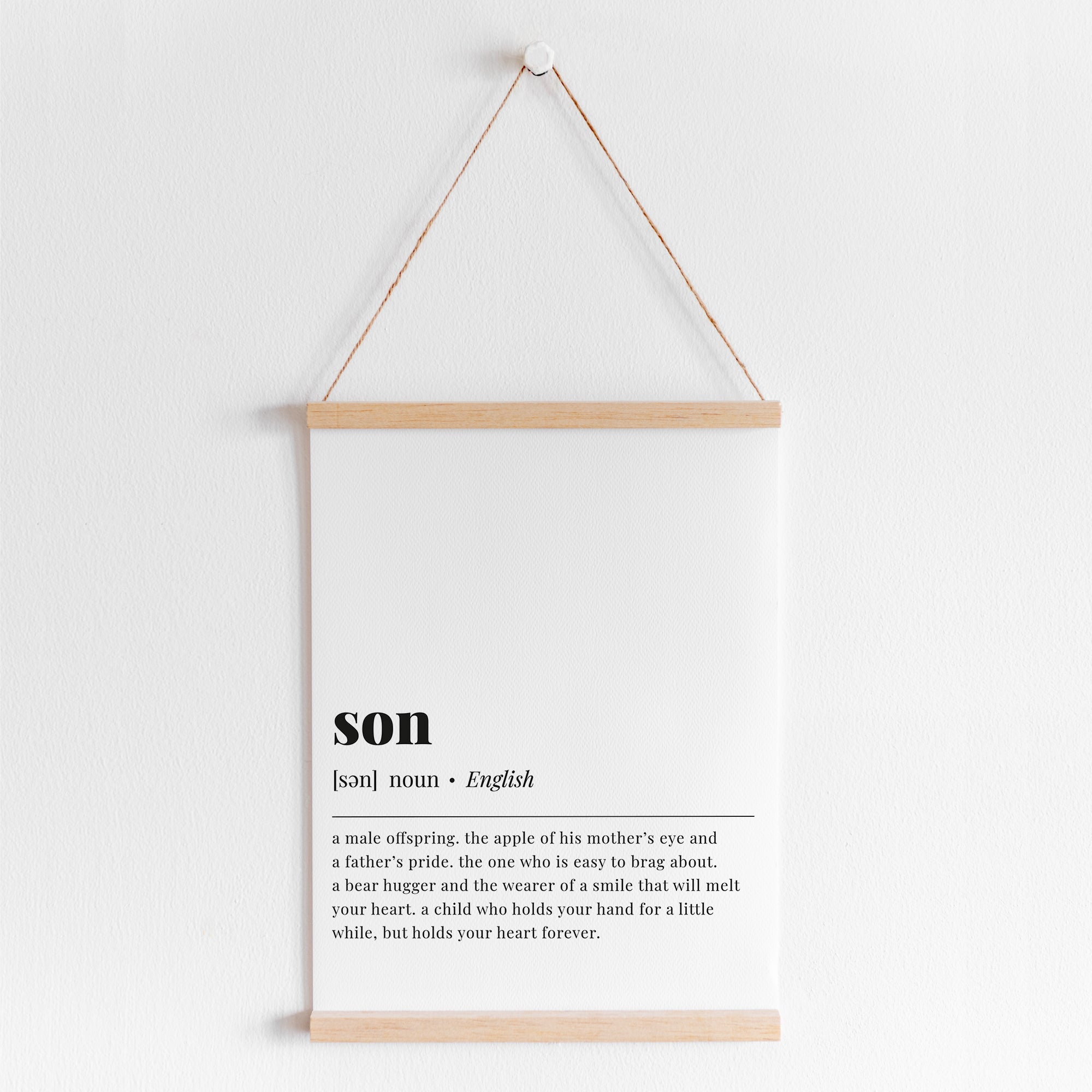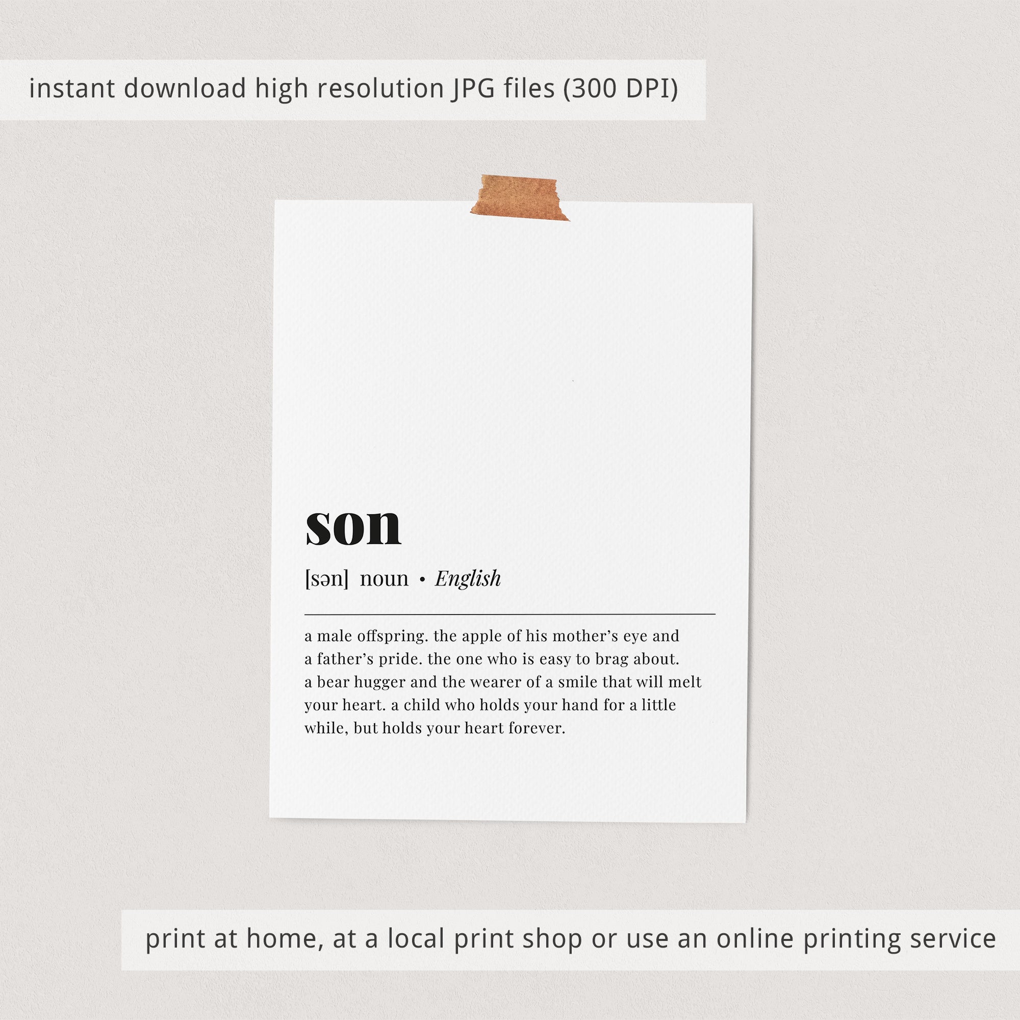 This dictionary-style meaning of the word 'son' print is a digital download. After purchase you will receive a download link immediately on screen. Also within minutes of your order and payment, an e-mail will be sent to you with a link for your download.